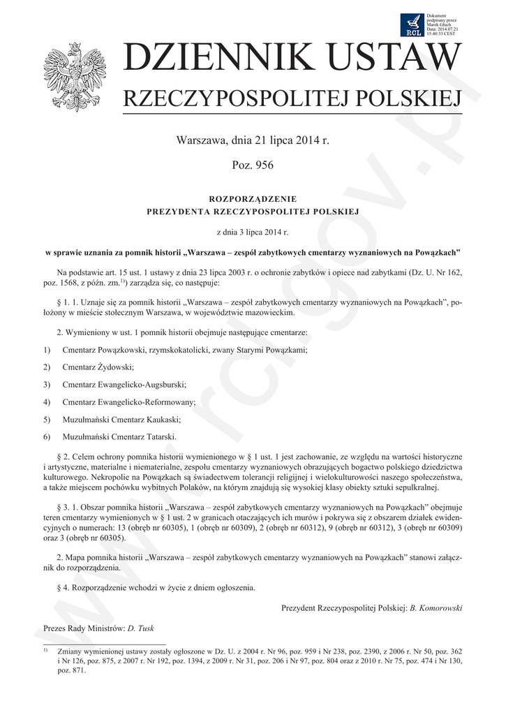 Dokument podpisany przez Marek Głuch Data: 2014.07.21 15:40:33 CEST DZIENNIK USTAW v.p l RZECZYPOSPOLITEJ POLSKIEJ Warszawa, dnia 21 lipca 2014 r. Poz. 956 ROZPORZĄDZENIE PREZYDENTA RZECZYPOSPOLITEJ POLSKIEJ .go z dnia 3 lipca 2014 r. w sprawie uznania za pomnik historii „Warszawa – zespół zabytkowych cmentarzy wyznaniowych na Powązkach” Na podstawie art. 15 ust. 1 ustawy z dnia 23 lipca 2003 r. o ochronie zabytków i opiece nad zabytkami (Dz. U. Nr 162, poz. 1568, z późn. zm.1)) zarządza się, co następuje: § 1. 1. Uznaje się za pomnik historii „Warszawa – zespół zabytkowych cmentarzy wyznaniowych na Powązkach”, położony w mieście stołecznym Warszawa, w województwie mazowieckim. 2. Wymieniony w ust. 1 pomnik historii obejmuje następujące cmentarze: w. rcl 1)Cmentarz Powązkowski, rzymskokatolicki, zwany Starymi Powązkami; 2)Cmentarz Żydowski; 3)Cmentarz Ewangelicko-Augsburski; 4)Cmentarz Ewangelicko-Reformowany; 5)Muzułmański Cmentarz Kaukaski; 6)Muzułmański Cmentarz Tatarski. § 2. Celem ochrony pomnika historii wymienionego w § 1 ust. 1 jest zachowanie, ze względu na wartości historyczne i artystyczne, materialne i niematerialne, zespołu cmentarzy wyznaniowych obrazujących bogactwo polskiego dziedzictwa kulturowego. Nekropolie na Powązkach są świadectwem tolerancji religijnej i wielokulturowości naszego społeczeństwa, a także miejscem pochówku wybitnych Polaków, na którym znajdują się wysokiej klasy obiekty sztuki sepulkralnej. ww § 3. 1. Obszar pomnika historii „Warszawa – zespół zabytkowych cmentarzy wyznaniowych na Powązkach” obejmuje teren cmentarzy wymienionych w § 1 ust. 2 w granicach otaczających ich murów i pokrywa się z obszarem działek ewidencyjnych o numerach: 13 (obręb nr 60305), 1 (obręb nr 60309), 2 (obręb nr 60312), 9 (obręb nr 60312), 3 (obręb nr 60309) oraz 3 (obręb nr 60305). 2. Mapa pomnika historii „Warszawa – zespół zabytkowych cmentarzy wyznaniowych na Powązkach” stanowi załącznik do rozporządzenia. § 4. Rozporządzenie wchodzi w życie z dniem ogłoszenia. Prezydent Rzeczypospolitej Polskiej: B. Komorowski Prezes Rady Ministrów: D. Tusk 1) Zmiany wymienionej ustawy zostały ogłoszone w Dz. U. z 2004 r. Nr 96, poz. 959 i Nr 238, poz. 2390, z 2006 r. Nr 50, poz. 362 i Nr 126, poz. 875, z 2007 r. Nr 192, poz. 1394, z 2009 r. Nr 31, poz. 206 i Nr 97, poz. 804 oraz z 2010 r. Nr 75, poz. 474 i Nr 130, poz. 871. Dziennik Ustaw – 2 – Poz. 956 Załącznik do rozporządzenia Prezydenta Rzeczypospolitej Polskiej Załącznik do rozporządzenia Prezydenta Rzeczypospolitej z dnia ......................................................... (poz..............................) Polskiej z dnia 3 lipca 2014 r. (poz. 956) v.p l MAPAPOMNIKA POMNIKA HISTORII HISTORII MAPA „WARSZAWA – ZESPÓŁ ZABYTKOWYCH CMENTARZY NA POWĄZKACH” „WARSZAWA - ZESPÓŁ ZABYTKOWYCH CMENTARZYWYZNANIOWYCH WYZNANIOWYCH NA POWĄZKACH” w. rcl 1 .go 6 2 5 ww 3 4 Warszawa - zespół zabytkowych cmentarzy wyznaniowych na Powązkach granica pomnika historii 1) Cmentarz Powązkowski, rzymskokatolicki, zwany Starymi Powązkami podział na kwatery 2) Cmentarz Żydowski 3) Cmentarz Ewangelicko-Augsburski 4) Cmentarz Ewangelicko-Reformowany obiekty architektury 5) Muzułmański Cmentarz Kaukaski 6) Muzułmański Cmentarz Tatarski 0 200 m