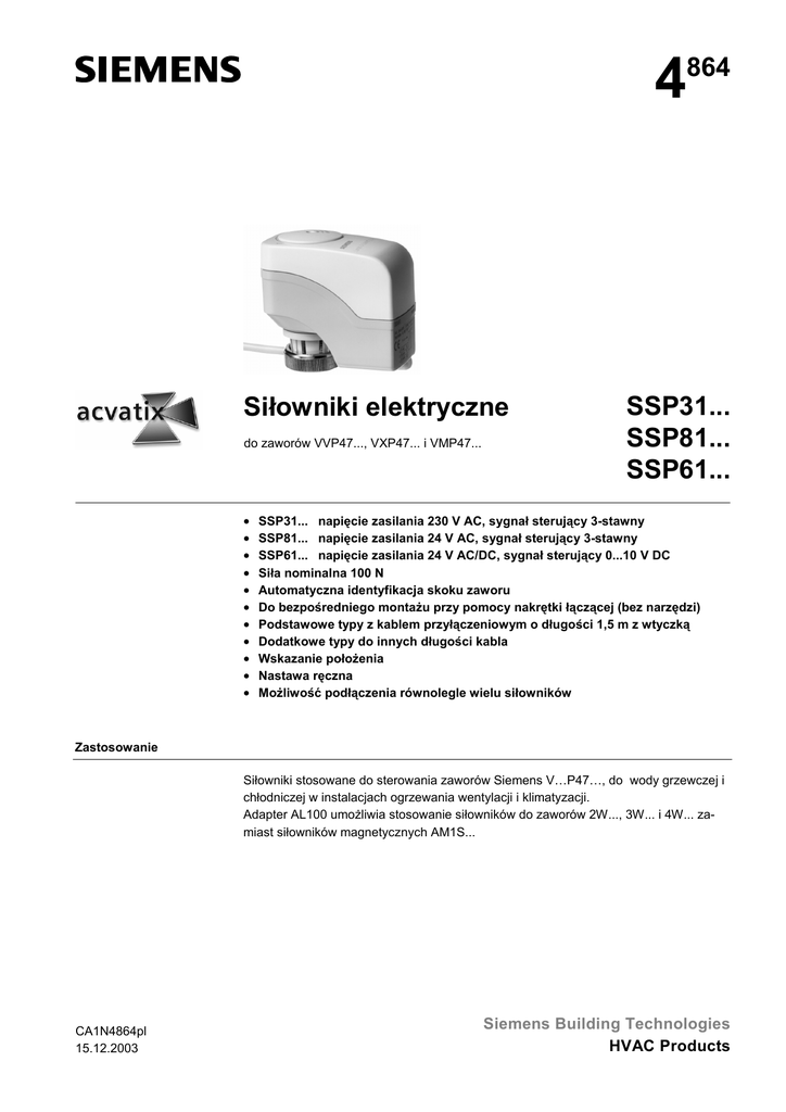 4 864 Siłowniki elektryczne do zaworów VVP47..., VXP47... i VMP47... • • • • • • • • • • • SSP31... SSP81... SSP61... SSP31... napięcie zasilania 230 V AC, sygnał sterujący 3-stawny SSP81... napięcie zasilania 24 V AC, sygnał sterujący 3-stawny SSP61... napięcie zasilania 24 V AC/DC, sygnał sterujący 0...10 V DC Siła nominalna 100 N Automatyczna identyfikacja skoku zaworu Do bezpośredniego montażu przy pomocy nakrętki łączącej (bez narzędzi) Podstawowe typy z kablem przyłączeniowym o długości 1,5 m z wtyczką Dodatkowe typy do innych długości kabla Wskazanie położenia Nastawa ręczna Możliwość podłączenia równolegle wielu siłowników Zastosowanie Siłowniki stosowane do sterowania zaworów Siemens V…P47…, do wody grzewczej i chłodniczej w instalacjach ogrzewania wentylacji i klimatyzacji. Adapter AL100 umożliwia stosowanie siłowników do zaworów 2W..., 3W... i 4W... zamiast siłowników magnetycznych AM1S... CA1N4864pl 15.12.2003 Siemens Building Technologies HVAC Products Zestawienie typów Typ Napięcie zasilania Czas przebiegu 50 Hz Sterowanie Kabel podłączeniowy SSP31 1) SSP31/00 2) SSP81 1) SSP81/00 3) SSP81.04 1) SSP81.04/00 3) SSP61 1) SSP61/00 3) SSP61P 1) 230 V AC 150 s 3-stawne 1,5 m bez kabla 1,5 m bez kabla 1,5 m bez kabla 1,5 m bez kabla 1,5 m Zamawianie 43 s 24 V AC/DC 34 s 0...10 V DC 0...10 V DC 4) 1) Podstawowe typy dostarczane są z kablem przyłączeniowym 2) Dodatkowe typy do innych długości kabla (patrz «Wyposażenie dodatkowe») lub jako część zamienna 3) Dodatkowe typy do innych długości kabla lub zacisków podłączeniowych (patrz «Wyposażenie dodatkowe») lub jako część zamienna 4) Aktywny zakres skoku 5...7,5 V DC (0...100 % skoku) Typ ASY3L15 ASY3L25 ASY3L45 ASY8L15 ASY8L25 ASY8L45 ASY6L15 ASY6L25 ASY6L45 ASY98 ASY99 ASY100 AL100 Wyposażenie dodatkowe 24 V AC Opis Napięcie zasilania Sterowanie Kabel przyłączeniowy 1,5 m 230 V AC 3-stawne Kabel przyłączeniowy 2,5 m Kabel przyłączeniowy 4,5 m Kabel przyłączeniowy 1,5 m 24 V AC Kabel przyłączeniowy 2,5 m Kabel przyłączeniowy 4,5 m Kabel przyłączeniowy 1,5 m 24 V AC/DC 0...10 V DC Kabel przyłączeniowy 2,5 m Kabel przyłączeniowy 4,5 m Śruba mocująca zabezpieczająca wtyczkę podłączeniową Wtyczka podłączeniowa do siłowników 3-stawnych SSP81... (24 V AC) Wtyczka podłączeniowa do siłowników 0…10 V DC SSP61/00 (24 V AC) Adapter do zaworów 2W..., 3W... i 4W... Przy zamówieniu należy podać ilość, opis urządzenia i oznaczenie typu. Przykład: Dostawa 2 siłowniki bez kabla SSP81/00 2 wtyczki podłączeniowe ASY99 Zawory, siłowniki i wyposażenie dodatkowe pakowane są oddzielnie. Urządzenia współpracujące Montaż bezpośredni Montaż z adapterem AL100 (renowacja) kvs [m3/h] Typ Rodzaj zaworu VVP47... Zawory 2-drogowe VXP47... Zawory 3-drogowe VMP47... Zawory 3-drogowe z obejściem 0,6...2,5 2W...K... Zawory 2-drogowe 0,6...2,5 3W... Zawory 3-drogowe 0,6...4,0 4W... Zawory 3-drogowe z obejściem 0,6...2,5 0,6...4,0 Ciśnienie nominalne [bar] PN16 Karta katalogowa PN16 N4846 N4847 kvs = Przepływ nominalny zimnej wody (5...30 °C) przez całkowicie otwarty zawór (H100) przy spadku ciśnienia 100 kPa (1 bar) 2/8 Siemens Building Technologies HVAC Products Siłowniki elektryczne SSP... CA1N4864pl 15.12.2003 y F M30 x1,5 AB A 4864Z01 Aby zapewnić prawidłową współpracę siłowników SSP... z zaworami innych producentów, zawory te muszą spełniać następujące wymagania: • Przyłącze M30 x 1,5 do podłączenia siłownika • Siła nominalna 100 N, patrz «Dane techniczne» • Wymiar x (otwarty zawór) x > 9,0 mm • Wymiar y (zamknięty zawór) y ≤ 14,5 mm x Zawory innych producentów Działanie i budowa Jeśli siłownik sterowany jest sygnałem 3-stawnym lub 0...10 V DC, wytwarza on skok, który przenoszony jest na trzpień zaworu. Przedstawiony poniżej opis działania dotyczy zaworów, które w stanie bez zasilania są całkowicie zamknięte (N.Z.). Sterowanie 3-stawne SSP31… /SSP81... • Napięcie na Y1: Trzpień siłownika wysuwa się: Otwieranie zaworu • Napięcie na Y2: Trzpień siłownika chowa się: Zamykanie zaworu • Brak napięcia na Y1 i Y2: Siłownik pozostaje w bieżącej pozycji Sterowanie 0...10 V DC SSP61… • Zawór jest otwierany / zamykany proporcjonalnie do napięcia na Y • Przy 0 V zawór jest całkowicie zamknięty (A → AB) • Przy braku zasilania siłownik przyjmuje pozycję całkowitego zamknięcia (A → AB) Właściwości i korzyści • • • • • • Obudowa z tworzywa sztucznego Bezobsługowa przekładnia zabezpieczona przed zblokowaniem Nastawa ręczna kluczem imbusowym 3 mm Zmniejszony pobór mocy w stanie utrzymywania pozycji Wyłącznik przeciążeniowy i dla pozycji krańcowych Możliwa równoległa praca 24 siłowników SSP81..., 6 siłowników SSP31... i 10 siłowników SSP61..., pod warunkiem wystarczającej obciążalności wyjściaregulatora • Dostępne wtyczki podłączeniowe do specjalnych długości kabla (tylko do siłowników 24 V AC i 24 V AC/DC) • Brak możliwości pomylenia kabli z wtyczkami 24 V AC i 230 V AC Wyposażenie dodatkowe Śruba mocująca Śruba ASY98 przeznaczona jest do zabezpieczenia wtyczki kabla 4864Z02 b Wtyczka mocowana jest zatrzaskowo, ale może być dodatkowo zabezpieczona śrubą mocującą d Wtyczki podłączeniowe 4864Z04 4864Z03 c Do specjalnych długości kabli podłączeniowych siłowników 24 V AC/DC ASY99 do siłowników 3-stawnych SSP81... ASY100 do siłowników 0…10 V DC SSP61/00 Wtyczki dostarczane są z instrukcją montażu (74 319 0385 0) 3/8 Siemens Building Technologies HVAC Products Siłowniki elektryczne SSP... CA1N4864pl 15.12.2003 4864Z05 Adapter Adapter AL100 wymagany jest do montażu siłowników SSP61... na zaworach 2W..., 3W... i 4W... zamiast siłowników magnetycznych AM1S... Adapter dostarczany jest z instrukcją montażu (74 319 0302 0) Wskazówki Projektowanie Przestrzeg