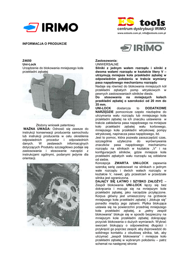 INFORMACJA O PRODUKCIE Z4650 Uni-Lock Urządzenie do blokowania mniejszego koła przekładni zębatej Złożony wniosek patentowy WAŻNA UWAGA: Odnosić się zawsze do instrukcji konserwacji producenta samochodu lub instrukcji producenta w celu określenia odpowiednich procedur i odpowiednich danych. W zestawach informacyjnych dotyczących Produktu szczegółowo podaje się zastosowania i stosowanie narzędzi z instrukcjami ogólnymi, podanymi jedynie dla orientacji. Zastosowania: UNIWERSALNE Silniki z jednym wałem rozrządu i silniki z dwoma wałami rozrządu w kształcie litery V – utrzymują mniejsze koła przekładni zębatej w odpowiednim położeniu w trakcie wymiany pasa napędowego mechanizmu rozrządu Nadaje się również do blokowania mniejszych kół przekładni zębatych pomp wtryskowych w pewnych zastosowaniach silników diesla. Do stosowania na mniejszych kołach przekładni zębatej o szerokości od 20 mm do 35 mm. UNI-LOCK dostarcza to DODATKOWE NARZĘDZIE pomocnicze często niezbędne do utrzymania wału rozrządu lub mniejszego koła przekładni zębatej na ich znaczku ustawienia w trakcie zakładania pasa napędowego na mniejsze koło przekładni zębatej wału korbowego, mniejszego koła przekładni wtryskowej pompy wtryskowej, napinacza pasa napędowego, itd. Jest to pomoc, która pozwala zaoszczędzić czas, szczególnie użyteczna do wyrównywania znaczków pasa napędowego mechanizmu rozrządu na silnikach w kształcie „V” i na konfiguracjach silników, gdzie mniejsze koła przekładni zębatych wału rozrządu są oddalone od siebie. Koncepcja ZWARTA UNI-LOCK zapewnia szeroką serię zastosowań na silnikach o jednym wale rozrządu i dwóch wałach rozrządu w kształcie V, nawet, gdy przestrzeń w przedziale silnika jest ograniczona. DAJĄCY SIĘ ŁATWO I SZYBKO ZAŁOŻYĆ – Zespół blokowania UNI-LOCK łączy się bez dokręcania i mocuje się na mniejszym kole przekładni zębatej, jako narzędzie przyłączone. Korpus główny jest umieszczony na grzbiecie mniejszego koła przekładni zębatej i „blokuje się” ponadto między jego zębami. Płytka blokująca ustawia się na powierzchni przedniej mniejszego koła przekładni zębatej, a „pełny zespół blokowania” blokuje się w sposób bezpieczny na mniejszym kole przekładni zębatej dokręcając przycisk blokowania o dużych wymiarach. Wybrać sworzeń blokujący o odpowiedniej długości i przykręcić go poprzez zespół, aby doprowadzić do solidnego kontaktu z obudową silnika, tak, aby utrzymać „zespół blokowania” i mniejsze koło przekładni zębatej w wybranym położeniu – patrz schemat na następnej stronie Części zamienne: Poz. Ozn. Wyszczególnienie 1 2 3 4 5 6 4650/1 4650/2 4650/3 4650/5 4650/6 4650/8 Korpus główny łącznie ze śrubą blokującą Płytka blokująca przednia Śruba nastawcza – do montażu równoległego Szpilka styku i blokowania – krótka Szpilka styku i blokowania – długa Przycisk blokujący o dużych rozmiarach Mocowanie UNI-LOCK Korpus główny Płytka blokująca Śruba blokująca Śruba nastawcza Szpilka krótka Szpilka długa „Zespół blokowania” Połączyć bez dokręcania elementów składowych UNI-LOCK, tak jak to przedstawiono poniżej w celu uzyskania „zespołu blokowania” – patrz również powyższy rysunek. 1. Przykręcić śrubę nastawczą do korpusu głównego. 2. Wsunąć płytkę blokującą przednią na część gwintowaną korpusu głównego i sprawdzić czy śruba nastawcza ustawia się na rowku dolnym płytki blokującej 3. Przykręcić śrubę blokującą o dużych wymiarach na część gwintowaną korpusu głównego, NIE DOKRĘCAĆ DO OPORU w tej chwili – połączyć tylko na luźno. Szpilki Styku i Blokowania UNI-LOCK jest dostarczany z dwiema szpilkami styku i blokowania – krótką i długą Szpilka styku i blokowania jest wkręcana poprzez „zespół blokowania”, a wybrana szpilka powinna być dostatecznie długa, aby mogła zapewnić dobry solidny styk z obudową silnika, aby utrzymać mniejsze koło przekładni zębatej w wymaganym Wyrównać mniejsze koło przekładni zębatej na znaczkach ustawienia lub nastawić w wybranym położeniu. Zamocować UNI-LOCK , który został zamontowany bez dokręcania na mniejszym kole przekładni zębatej, umieszczając korpus główny z tyłu mniejszego koła przekładni zębatej, ustawiając ponadto między zębami mniejszego koła przekładni zębatej. Założyć płytkę blokującą przednią na przedniej powierzchni mniejszego koła przekładni zębatej. Stosować śrubę nastawczą, aby zagwarantować, że korpus główny i płytka blokująca przednia będą równoległe do siebie, gdy są „zablokowane” na mniejszym kole przekładni zębatej. Korpus główny i Płytka blokująca przednia powinny być równoległe między sobą, utrzymywane przez śrubę nastawczą WAŻNA UWAGA: Konieczne jest, aby korpus główny i płytka blokująca przednia były zamontowane w POŁOŻENIIU RÓWNOLEGŁYM między sobą po połączeniu na mniejszym kole przekładni zębatej tak, aby doszło do skutecznego położeniu. Wkręcić szpilkę do „zespołu blokowania” aż do położenia, w którym lekko wychodzi ona z grzbietu zespołu. „ Zespół blokowania” powinien być zamocowany do mniejszego koła przekładni zębatej przed całkowitym wsunięciem szpilki styku i blokowania do obudowy silnika. UWAGA: Szpilka blokująca jest zazwyczaj wkręcana poprzez zespół blokowania” zanim zostanie przymocowana do mniejszego koła przekładni zębatej, lecz w razie potrzeby ‘„zespół blokowania” może być zamontowany, a potem szpilka blokowania może być wkręcona do niego. SZPILKI BLOKUJĄCE POWINNY BYĆ UTRZYMYWANE W STANIE PRAWIDŁOWO NASMAROWANYM Szpilka styku i blokowania styka się z obudową silnika „zablokowania”. Odkręcić śrubę nastawczą w celu wyregulowania i podtrzymania części dolnej płytki blokującej przedniej i sprawdzić czy płytka