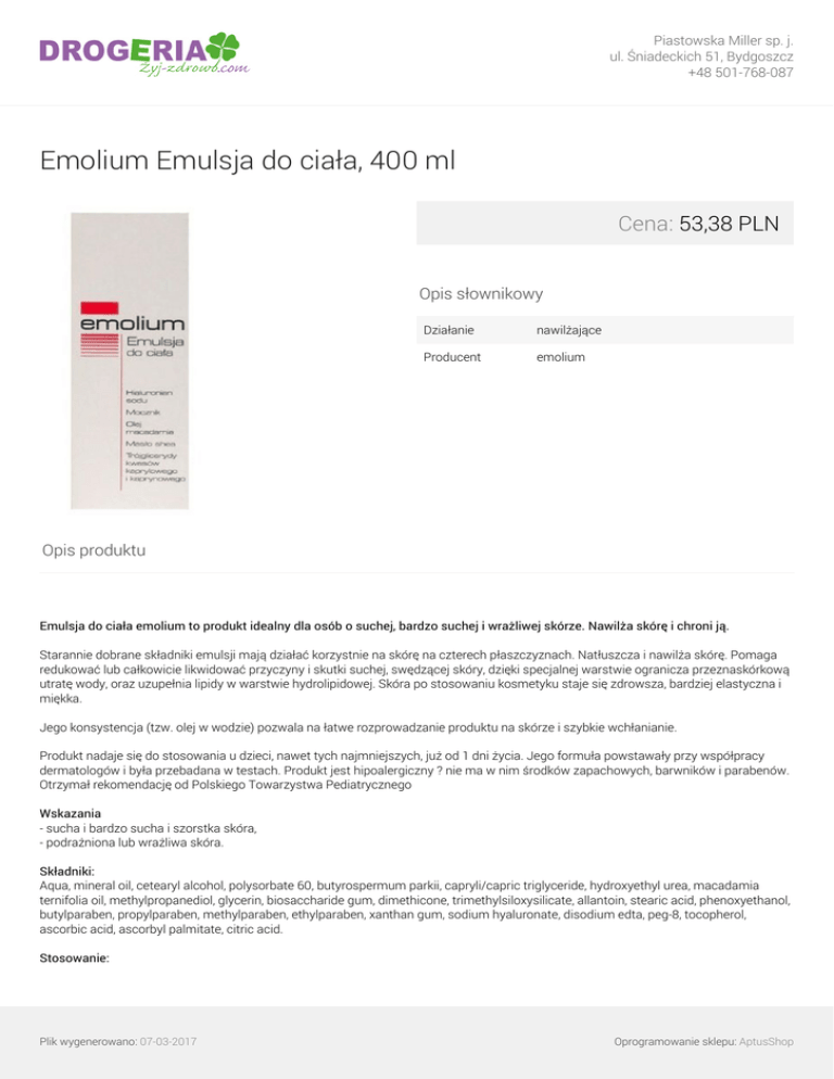 Piastowska Miller sp. j. ul. Śniadeckich 51, Bydgoszcz +48 501-768-087 Emolium Emulsja do ciała, 400 ml Cena: 53,38 PLN Opis słownikowy Działanie nawilżające Producent emolium Opis produktu Emulsja do ciała emolium to produkt idealny dla osób o suchej, bardzo suchej i wrażliwej skórze. Nawilża skórę i chroni ją. Starannie dobrane składniki emulsji mają działać korzystnie na skórę na czterech płaszczyznach. Natłuszcza i nawilża skórę. Pomaga redukować lub całkowicie likwidować przyczyny i skutki suchej, swędzącej skóry, dzięki specjalnej warstwie ogranicza przeznaskórkową utratę wody, oraz uzupełnia lipidy w warstwie hydrolipidowej. Skóra po stosowaniu kosmetyku staje się zdrowsza, bardziej elastyczna i miękka. Jego konsystencja (tzw. olej w wodzie) pozwala na łatwe rozprowadzanie produktu na skórze i szybkie wchłanianie. Produkt nadaje się do stosowania u dzieci, nawet tych najmniejszych, już od 1 dni życia. Jego formuła powstawały przy współpracy dermatologów i była przebadana w testach. Produkt jest hipoalergiczny ? nie ma w nim środków zapachowych, barwników i parabenów. Otrzymał rekomendację od Polskiego Towarzystwa Pediatrycznego Wskazania - sucha i bardzo sucha i szorstka skóra, - podrażniona lub wrażliwa skóra. Składniki: Aqua, mineral oil, cetearyl alcohol, polysorbate 60, butyrospermum parkii, capryli/capric triglyceride, hydroxyethyl urea, macadamia ternifolia oil, methylpropanediol, glycerin, biosaccharide gum, dimethicone, trimethylsiloxysilicate, allantoin, stearic acid, phenoxyethanol, butylparaben, propylparaben, methylparaben, ethylparaben, xanthan gum, sodium hyaluronate, disodium edta, peg-8, tocopherol, ascorbic acid, ascorbyl palmitate, citric acid. Stosowanie: Plik wygenerowano: 07-03-2017 Oprogramowanie sklepu: AptusShop Piastowska Miller sp. j. ul. Śniadeckich 51, Bydgoszcz +48 501-768-087 Cienką warstwę emulsji nanieść na czystą i osuszoną skórę. W celu najlepszej skuteczności, poleca się stosowanie produktu po każdym myciu. Plik wygenerowano: 07-03-2017 Powered by TCPDF (www.tcpdf.org) Oprogramowanie sklepu: AptusShop