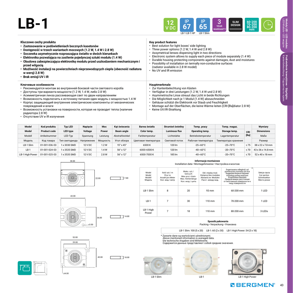IP IP 12 65 67 V DC LB-1·LB-1 HP 3 YEAR WARRANTY LB-1 Slim SLIM DESIGN - 60-200 70-200 80-200 mm Key product features • Best solution for light boxes' side lighting • Three power options (1.2 W, 1.4 W and 2.8 W) • Assymetrical lenses dispersing light in two directions • Electronic system allows to supply each piece of module separately (1.4 W) • Durable housing protecting components against damages, dust and moistures • Possibility of installation on termally non-conductive surfaces (radiator available in 2.8 W model) • No UV and IR emission Ключевые особенности • Рекомендуется монтаж во внутренней боковой части светового короба • Доступны три варианта мощности (1.2 W, 1.4 W, либо 2.8 W) • Асимметричная линза рассеивающая свет по двум направлениям • Возможность подключить к источнику питания один модуль с мощностью 1.4 W • Корпус защищающий внутренние электрические компоненты от механических повреждений и влаги • Возможность установки на поверхности, которая не проводит тепла (наличие радиатора 2.8 W) • Отсутствие UV и IR излучения Hauptmerkmale • Zur Kantenbelechtung von Kästen • Verfügbar in drei Leistungen (1.2 W, 1.4 W und 2.8 W) • Asymmetrische Linse streuut das Licht in beide Richtungen • Die Möglichkeit nach je 1 Modul (1.4 W) abzuschneiden • Gehäuse schützt die Elektronik vor Staub und Feuchtigkeit • Montage auf der Oberflächen, die keine Wärme leiten (CRI [Ra]diator 2.8 W) • Keine UV/IR-Strahlung Kod produktu Typ LED Napięcie Moc Kąt świecenia Barwa światła Strumień świetlny Temp. pracy Temp. magaz. Model Product code LED type Voltage Power Beam angle Color temp. Luminous flux Operating temp. Storage temp. Podświetlenie krawędziowe • Edgelights Kantenbeleuchtung • Подсветка по краях Kluczowe cechy produktu • Zastosowanie w podświetleniach bocznych kasetonów • Dostępność w trzech wariantach mocowych (1.2 W, 1.4 W i 2.8 W) • Soczewka asymetrycznie rozpraszająca światło w dwóch kierunkach • Elektronika pozwalająca na zasilenie pojedynczej sztuki modułu (1.4 W) • Obudowa zabezpieczająca elektronikę modułu przed uszkodzeniem mechanicznym i przed wilgocią • Możliwość instalacji na powierzchniach nieprzewodzących ciepła (obecność radiatora w wersji 2.8 W) • Brak emisji UV i IR Model Moduły LED • LED modules LED-Module • LED модули - LB-1 Wymiary Dimensions CRI [Ra] Modell Artikelnummer LED-Typ Spannung Leistung Abstrahlwinkel Farbtemperatur Lichtstärke Betriebstemperatur Lagertemperatur Модель Код товара Тип светодиода Напряжение Мощность Угол обзора Цветовая температура Световой поток Рабочая температура Температура хранения Maße LB-1 Slim 01-001-036-03 1 x 3030 SMD 12 V DC 1.2 W 15° x 45° 6500 K 120 lm -25~60°C -25~70°C ≥ 75 38 x 22 x 7.8 mm LB-1 01-001-024-03 1 x 3535 SMD 12 V DC 1.4 W 56° x 12° 6000-6500 K 120 lm -40~60°C -20~70°C ≥ 70 43 x 36 x 14.8 mm LB-1 High Power 01-001-025-03 1 x 3535 SMD 12 V DC 2.8 W 56° x 12° 6500-7000 K 185 lm -40~60°C -20~70°C ≥ 70 52 x 40 x 18 mm Размер Informacje montażowe Installation data • Montagehinweise • Настройка и монтаж 38.00 22.00 7.80 * Model Model Modell Модель Ilość szt./ m Pcs/ m Anzahl pro Meter Кол. мод./ метр Maks. szt./ łańcuch Max pcs/ chain Max. Kettenlänge Кол. мод./ цепь Odl. między mod. Distance btw modules Abstand zw. Modulen Расст. между мод. Sugerowana odległość od powierzchni montażu do lica Suggested distance between mounting surface and front Empfohlene Bautiefe Предлагаемое расстояние от монтажной поверхности к лицу поверхности LB-1 Slim 8 20 93 mm 60-200 mm 1 LED LB-1 7 30 110 mm 70-200 mm 1 LED LB-1 High Power 7 18 110 mm 80-200 mm 3 LEDs Sekcje cięcia Cut section Schnittsektor Место резки 43.00 36.00 14.80 Sposób pakowania Packing • Verpackung • Упаковка ø3.50 LB-1 Slim: 100 (5 x 20) LB-1: 60 (2 x 30) LB-1 High Power: 54 (3 x 18) * Zawarte dane są wartościami uśrednionymi. Above mentioned information is averaged data. Die technische Angaben sind Mittelwerte. Содержится данные представляют собой средние значения. 52.00 39.00 40.00 18.00 ø4.00 LB-1 Slim LB-1 LB-1 High Power 43