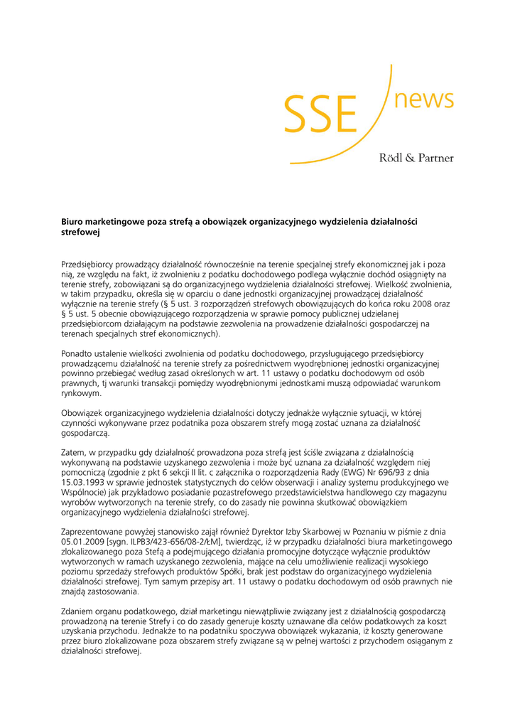 Biuro marketingowe poza strefą a obowiązek organizacyjnego wydzielenia działalności strefowej Przedsiębiorcy prowadzący działalność równocześnie na terenie specjalnej strefy ekonomicznej jak i poza nią, ze względu na fakt, iż zwolnieniu z podatku dochodowego podlega wyłącznie dochód osiągnięty na terenie strefy, zobowiązani są do organizacyjnego wydzielenia działalności strefowej. Wielkość zwolnienia, w takim przypadku, określa się w oparciu o dane jednostki organizacyjnej prowadzącej działalność wyłącznie na terenie strefy (§ 5 ust. 3 rozporządzeń strefowych obowiązujących do końca roku 2008 oraz § 5 ust. 5 obecnie obowiązującego rozporządzenia w sprawie pomocy publicznej udzielanej przedsiębiorcom działającym na podstawie zezwolenia na prowadzenie działalności gospodarczej na terenach specjalnych stref ekonomicznych). Ponadto ustalenie wielkości zwolnienia od podatku dochodowego, przysługującego przedsiębiorcy prowadzącemu działalność na terenie strefy za pośrednictwem wyodrębnionej jednostki organizacyjnej powinno przebiegać według zasad określonych w art. 11 ustawy o podatku dochodowym od osób prawnych, tj warunki transakcji pomiędzy wyodrębnionymi jednostkami muszą odpowiadać warunkom rynkowym. Obowiązek organizacyjnego wydzielenia działalności dotyczy jednakże wyłącznie sytuacji, w której czynności wykonywane przez podatnika poza obszarem strefy mogą zostać uznana za działalność gospodarczą. Zatem, w przypadku gdy działalność prowadzona poza strefą jest ściśle związana z działalnością wykonywaną na podstawie uzyskanego zezwolenia i może być uznana za działalność względem niej pomocniczą (zgodnie z pkt 6 sekcji II lit. c załącznika o rozporządzenia Rady (EWG) Nr 696/93 z dnia 15.03.1993 w sprawie jednostek statystycznych do celów obserwacji i analizy systemu produkcyjnego we Wspólnocie) jak przykładowo posiadanie pozastrefowego przedstawicielstwa handlowego czy magazynu wyrobów wytworzonych na terenie strefy, co do zasady nie powinna skutkować obowiązkiem organizacyjnego wydzielenia działalności strefowej. Zaprezentowane powyżej stanowisko zajął również Dyrektor Izby Skarbowej w Poznaniu w piśmie z dnia 05.01.2009 [sygn. ILPB3/423-656/08-2/ŁM], twierdząc, iż w przypadku działalności biura marketingowego zlokalizowanego poza Stefą a podejmującego działania promocyjne dotyczące wyłącznie produktów wytworzonych w ramach uzyskanego zezwolenia, mające na celu umożliwienie realizacji wysokiego poziomu sprzedaży strefowych produktów Spółki, brak jest podstaw do organizacyjnego wydzielenia działalności strefowej. Tym samym przepisy art. 11 ustawy o podatku dochodowym od osób prawnych nie znajdą zastosowania. Zdaniem organu podatkowego, dział marketingu niewątpliwie związany jest z działalnością gospodarczą prowadzoną na terenie Strefy i co do zasady generuje koszty uznawane dla celów podatkowych za koszt uzyskania przychodu. Jednakże to na podatniku spoczywa obowiązek wykazania, iż koszty generowane przez biuro zlokalizowane poza obszarem strefy związane są w pełnej wartości z przychodem osiąganym z działalności strefowej. Kontakt Marcin Kowalski dział prawno – podatkowy + 48 (61) 86 44 900 [email protected] Katarzyna Winiecka dział prawno – podatkowy + 48 (61) 86 44 900 [email protected]