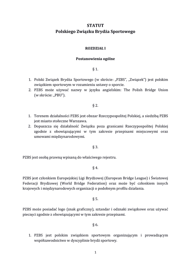 STATUT Polskiego Związku Brydża Sportowego ROZDZIAŁ I Postanowienia ogólne § 1. 1. Polski Związek Brydża Sportowego (w skrócie: „PZBS”, „Związek”) jest polskim związkiem sportowym w rozumieniu ustawy o sporcie. 2. PZBS może używać nazwy w języku angielskim: The Polish Bridge Union (w skrócie: „PBU”). § 2. 1. Terenem działalności PZBS jest obszar Rzeczypospolitej Polskiej, a siedzibą PZBS jest miasto stołeczne Warszawa. 2. Dopuszcza się działalność Związku poza granicami Rzeczypospolitej Polskiej zgodnie z obowiązującymi w tym zakresie przepisami miejscowymi oraz umowami międzynarodowymi. § 3. PZBS jest osobą prawną wpisaną do właściwego rejestru. § 4. PZBS jest członkiem Europejskiej Ligi Brydżowej (European Bridge League) i Światowej Federacji Brydżowej (World Bridge Federation) oraz może być członkiem innych krajowych i międzynarodowych organizacji o podobnym profilu działania. § 5. PZBS może posiadać logo (znak graficzny), sztandar i odznaki związkowe oraz używać pieczęci zgodnie z obowiązującymi w tym zakresie przepisami. § 6. 1. PZBS jest polskim związkiem sportowym organizującym i prowadzącym współzawodnictwo w dyscyplinie brydż sportowy. 1 2. PZBS działa na podstawie prawa powszechnie obowiązującego w Rzeczypospolitej Polskiej oraz na podstawie niniejszego Statutu. 3. Organem nadzorującym działalność PZBS jest minister właściwy do spraw kultury fizycznej. 4. PZBS ma wyłączne prawo do: a) prowadzenia współzawodnictwa sportowego o tytuł Mistrza Polski oraz o Puchar Polski w brydżu sportowym, b) ustanawiania i realizacji reguł sportowych, organizacyjnych i dyscyplinarnych we współzawodnictwie sportowym organizowanym przez PZBS, c) powoływania kadry narodowej oraz przygotowywania jej do mistrzostw świata, mistrzostw Europy lub innych zawodów rangi międzypaństwowej, d) reprezentowania brydża sportowego w międzynarodowych organizacjach sportowych. 5. PZBS umieszcza na stroju reprezentacji kraju godło Rzeczypospolitej Polskiej, chyba że przepisy międzynarodowej organizacji sportowej działającej w dziedzinie brydża sportowego, do której należy PZBS, stanowią inaczej. § 7. PZBS jest organizacją pożytku publicznego, prowadzącą działalność na rzecz ogółu środowiska brydżowego. ROZDZIAŁ II Cele i środki działania PZBS § 8. 1. PZBS i jego członkowie skupiają ludzi uprawiających dyscyplinę brydż sportowy („brydżystów”). 2. Celem PZBS jest organizowanie i prowadzenie współzawodnictwa w brydżu sportowym oraz wspieranie innych form brydża. 3. PZBS: a) wykorzystuje intelektualne, poznawcze, wychowawcze, twórcze i inne walory brydża sportowego, w szczególności w działalności wśród młodzieży, b) szerzy wiedzę o walorach brydża sportowego oraz czynnie wspiera działania podejmowane w tej dziedzinie, c) krzewi zamiłowanie i nawyki uczciwej rywalizacji oraz kultury obyczajów brydżowych, d) upowszechnia wiedzę o znaczących wynikach sportowych polskich brydżystów, o historii, teorii i przepisach dyscypliny brydż sportowy, 2 e) współdziała i udziela fachowej pomocy organizacjom i klubom polonijnym działającym w dziedzinie brydża poza granicami Rzeczypospolitej Polskiej. 4. Do zadań PZBS należy w szczególności: a) organizacja i prowadzenie współzawodnictwa sportowego w dyscyplinie brydż sportowy, b) nadawanie klubom sportowym licencji uprawniających do udziału we współzawodnictwie sportowym, c) reprezentowanie polskiego brydża sportowego w międzynarodowych organizacjach sportowych oraz organizowanie udziału w międzynarodowym współzawodnictwie sportowym, d) przygotowywanie kadry narodowej do uczestnictwa w międzynarodowym współzawodnictwie sportowym, e) ustalanie zasad organizacji współzawodnictwa sportowego i składu kadry narodowej, f) określanie zasad i egzekwowanie odpowiedzialności dyscyplinarnej zawodników, g) ustalanie zasad i trybu zmiany przynależności zawodników do klubu sportowego, h) określanie reguł technicznych i dyscyplinarnych zawodów sportowych oraz organów dyscyplinarnych uprawnionych do orzekania w sprawach związanych z naruszeniem tych reguł w czasie lub w związku z zawodami sportowymi, a także ich kompetencji, trybu postępowania i rodzajów wymierzania kar, i) przyznawanie, w zakresie zgodnym z obowiązującymi przepisami prawa, licencji sędziowskich i szkoleniowych oraz określanie, w zakresie zgodnym z obowiązującymi przepisami prawa, niezbędnych warunków umożliwiających wypełnianie funkcji sędziów i szkoleniowców (trenerów i instruktorów w rozumieniu właściwych przepisów prawa). § 9. PZBS realizuje swoje cele w szczególności poprzez: a) umożliwianie zrzeszania się brydżystom, b) opracowywanie kierunków rozwoju brydża w kraju, c) organizowanie, wspomaganie lub prowadzenie: ‒ w sposób bezpośredni lub pośredni zawodów krajowych, międzynarodowych, pucharowych, treningowych, promocyjnych i innych zgodnie z ustalonym systemem współzawodnictwa sportowego, ‒ krajowej i międzynarodowej klasyfikacji sportowej, ‒ kształcenia trenerów, instruktorów i sędziów oraz nadawanie im, w zakresie zgodnym z obowiązującymi przepisami prawa, uprawnień oraz licencji, ‒ klasyfikacji zawodników, szkoleniowców i sędziów, 3 ‒ obozów i wczasów rekreacyjno-brydżowych oraz wycieczek sportowoturystycznych brydża sportowego, d) ustalanie w odniesieniu do zawodów brydża sportowego: ‒ Jednolitego Kalendarza Sportowego i regulaminów rozgrywek, ‒ zasad i norm użytkowania brydżowego sprzętu sportowego oraz jego atestacji i homologacji, e) sprawowanie nadzoru merytorycznego nad działalnością członków PZBS, zwłaszcza w zakresie: ‒ rozwijania brydża sportowego wśród młodzieży, ‒ prowadzenia klasyfikacji sportowej, ‒ koordynowania kalendarza imprez sportowych, ‒ prowadzenia ewidencji sekcji, zawodników, sędziów, szkoleniowców i działaczy, 