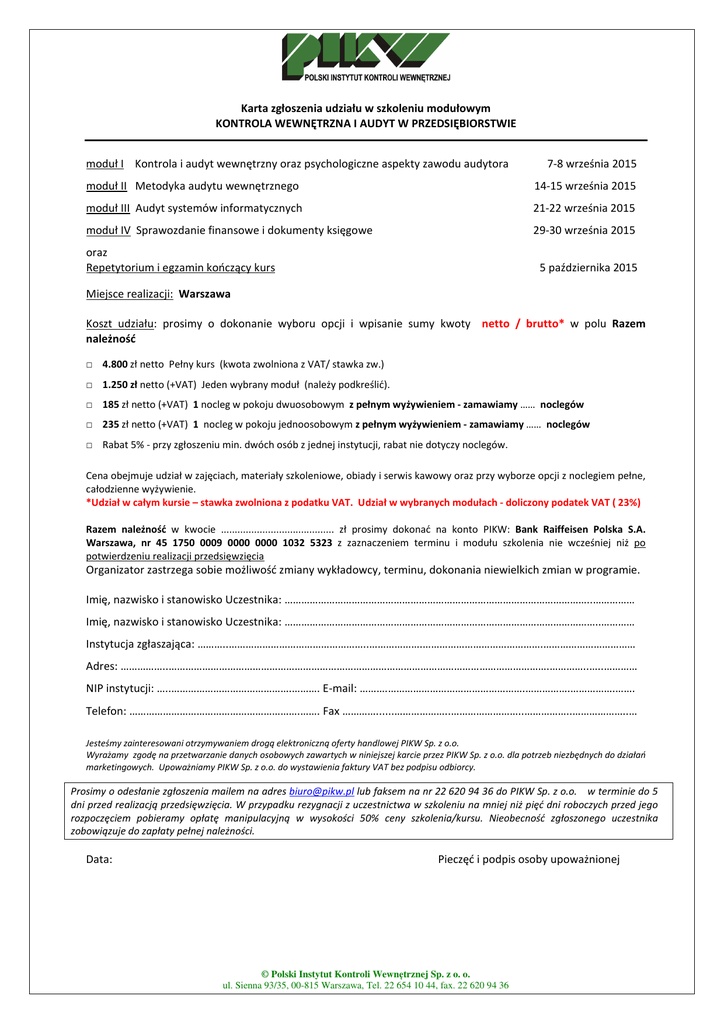 Karta zgłoszenia udziału w szkoleniu modułowym KONTROLA WEWNĘTRZNA I AUDYT W PRZEDSIĘBIORSTWIE moduł I Kontrola i audyt wewnętrzny oraz psychologiczne aspekty zawodu audytora 7-8 września 2015 moduł II Metodyka audytu wewnętrznego 14-15 września 2015 moduł III Audyt systemów informatycznych 21-22 września 2015 moduł IV Sprawozdanie finansowe i dokumenty księgowe 29-30 września 2015 oraz Repetytorium i egzamin kończący kurs 5 października 2015 Miejsce realizacji: Warszawa Koszt udziału: prosimy o dokonanie wyboru opcji i wpisanie sumy kwoty netto / brutto* w polu Razem należność □ 4.800 zł netto Pełny kurs (kwota zwolniona z VAT/ stawka zw.) □ 1.250 zł netto (+VAT) Jeden wybrany moduł (należy podkreślić). □ 185 zł netto (+VAT) 1 nocleg w pokoju dwuosobowym z pełnym wyżywieniem - zamawiamy …… noclegów □ 235 zł netto (+VAT) 1 nocleg w pokoju jednoosobowym z pełnym wyżywieniem - zamawiamy …… noclegów □ Rabat 5% - przy zgłoszeniu min. dwóch osób z jednej instytucji, rabat nie dotyczy noclegów. Cena obejmuje udział w zajęciach, materiały szkoleniowe, obiady i serwis kawowy oraz przy wyborze opcji z noclegiem pełne, całodzienne wyżywienie. *Udział w całym kursie – stawka zwolniona z podatku VAT. Udział w wybranych modułach - doliczony podatek VAT ( 23%) Razem należność w kwocie ......................................... zł prosimy dokonać na konto PIKW: Bank Raiffeisen Polska S.A. Warszawa, nr 45 1750 0009 0000 0000 1032 5323 z zaznaczeniem terminu i modułu szkolenia nie wcześniej niż po potwierdzeniu realizacji przedsięwzięcia Organizator zastrzega sobie możliwość zmiany wykładowcy, terminu, dokonania niewielkich zmian w programie. Imię, nazwisko i stanowisko Uczestnika: ………………………………………………………………………………………………..…………… Imię, nazwisko i stanowisko Uczestnika: …………………………………………………………………………………………………..………… Instytucja zgłaszająca: ………..…………………………………………..……………….…………………………………….…………………………… Adres: ……………..……………………………………………………………………………………………………………………….…………..…..………… NIP instytucji: …..…………………………………….………. E-mail: ……….………………………………………….…………….…………….……. Telefon: …………………………………………………….……. Fax …………......………………..……………………..……………..………………..… Jesteśmy zainteresowani otrzymywaniem drogą elektroniczną oferty handlowej PIKW Sp. z o.o. Wyrażamy zgodę na przetwarzanie danych osobowych zawartych w niniejszej karcie przez PIKW Sp. z o.o. dla potrzeb niezbędnych do działań marketingowych. Upoważniamy PIKW Sp. z o.o. do wystawienia faktury VAT bez podpisu odbiorcy. Prosimy o odesłanie zgłoszenia mailem na adres [email protected] lub faksem na nr 22 620 94 36 do PIKW Sp. z o.o. w terminie do 5 dni przed realizacją przedsięwzięcia. W przypadku rezygnacji z uczestnictwa w szkoleniu na mniej niż pięć dni roboczych przed jego rozpoczęciem pobieramy opłatę manipulacyjną w wysokości 50% ceny szkolenia/kursu. Nieobecność zgłoszonego uczestnika zobowiązuje do zapłaty pełnej należności. Data: Pieczęć i podpis osoby upoważnionej © Polski Instytut Kontroli Wewnętrznej Sp. z o. o. ul. Sienna 93/35, 00-815 Warszawa, Tel. 22 654 10 44, fax. 22 620 94 36