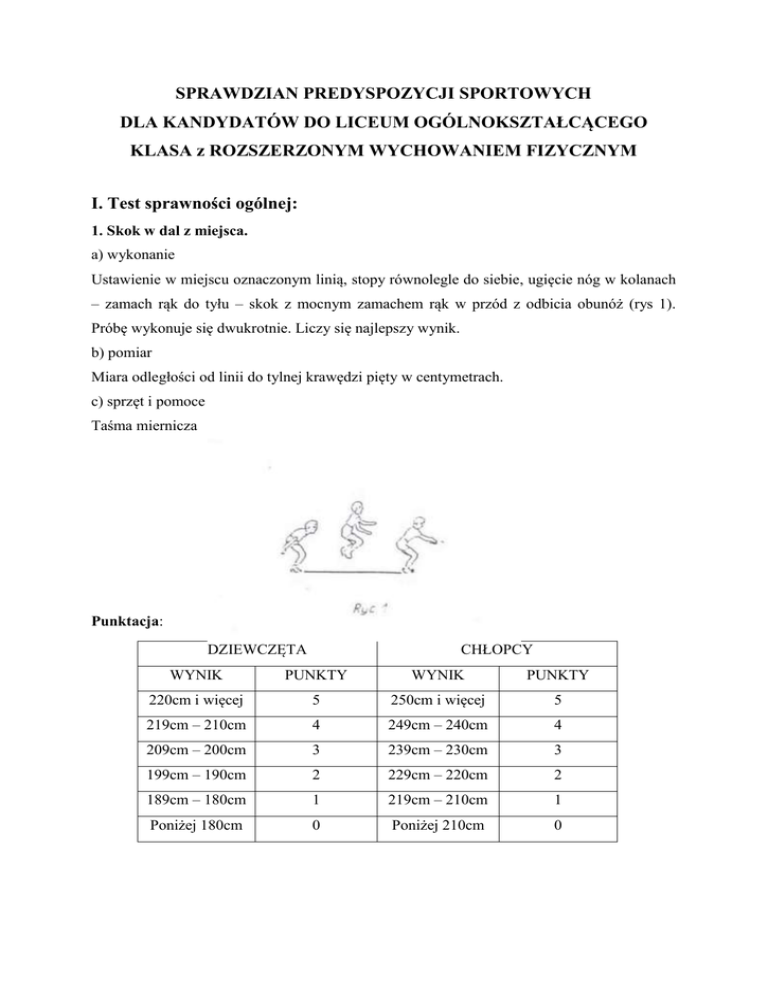 SPRAWDZIAN PREDYSPOZYCJI SPORTOWYCH DLA KANDYDATÓW DO LICEUM OGÓLNOKSZTAŁCĄCEGO KLASA z ROZSZERZONYM WYCHOWANIEM FIZYCZNYM I. Test sprawności ogólnej: 1. Skok w dal z miejsca. a) wykonanie Ustawienie w miejscu oznaczonym linią, stopy równolegle do siebie, ugięcie nóg w kolanach – zamach rąk do tyłu – skok z mocnym zamachem rąk w przód z odbicia obunóż (rys 1). Próbę wykonuje się dwukrotnie. Liczy się najlepszy wynik. b) pomiar Miara odległości od linii do tylnej krawędzi pięty w centymetrach. c) sprzęt i pomoce Taśma miernicza Punktacja: DZIEWCZĘTA CHŁOPCY WYNIK PUNKTY WYNIK PUNKTY 220cm i więcej 5 250cm i więcej 5 219cm – 210cm 4 249cm – 240cm 4 209cm – 200cm 3 239cm – 230cm 3 199cm – 190cm 2 229cm – 220cm 2 189cm – 180cm 1 219cm – 210cm 1 Poniżej 180cm 0 Poniżej 210cm 0 2. Bieg zygzakiem (po kopercie). a) wykonanie Na wybranym miejscu – oznaczony chorągiewkami prostokąt o wymiarach 5x3m. Na sygnał gwizdkiem po komendzie „gotów – start – strat wysoki pojedynczo. Bieg sprintem z ominięciem chorągiewek (bez dotknięcia). Bieg w ten sposób jest wykonywany trzy krotnie. Przy omijaniu chorągiewki startowej, zawodnik jest informowany: „jeszcze dwa, jeszcze raz…”. Po trzeciej rundzie (obiegu), dotknięcie chorągiewki startowej powoduje zatrzymanie wskazówki stopera przez mierzącego czas (rys 2) b) pomiar Wykonuje się dwie próby – liczy się lepszy czas. Czas mierzy się z dokładnością do 0,1 sekundy. c) sprzęt i pomoce Tyczki – 5 sztuk, stoper, boisko. Punktacja: DZIEWCZĘTA CHŁOPCY WYNIK PUNKTY WYNIK PUNKTY 22,99s i mniej 5 21,99s i mniej 5 23,00s – 23,99s 4 22,00s – 22,99s 4 24,00s – 24,99s 3 23,00s – 23,99s 3 25,00s – 25,99s 2 24,00s – 24,99s 2 26,00s – 26,99s 1 25,00s – 25,99s 1 27,00s – powyżej 0 26,00s – powyżej 0 3. Rzut piłką lekarską (2kg – dziewczyny, 3 kg - chłopcy) z miejsca w przód, zza głowy a) wykonanie Pozycja wyjściowa – piłka trzymana oburącz na wysokości klatki piersiowej, stopy na szerokości bioder, ustawione równolegle kilkanaście centymetrów przed linią wyrzutu. Ćwiczący po wykonaniu zamachu piłką, połączonego ze skłonem tułowia do tyłu i ugięciem nóg w kolanach, wyrzuca ją znad głowy (rys. 3) Wykonuje się trzy próby. Liczy się najlepszy. b) pomiar Długość rzutu mierzy się prostopadle od najbliższego śladu piłki do linii odbicia. Odległość mierzy się z dokładnością do 10 centymetrów. Punktacja: CHŁOPCY DZIEWCZYNY WYNIK PUNKTY WYNIK PUNKTY 9,00m i więcej 5 10,00m i więcej 5 8,99m – 8,00m 4 9,99m – 9,00m 4 7,99m – 7,00m 3 8,99m – 8,00m 3 6,99m – 6,00m 2 7,99m – 7,00m 2 5,99m – 5,00m 1 6,99m – 6,00m 1 4,99 – poniżej 0 5,99 – poniżej 0