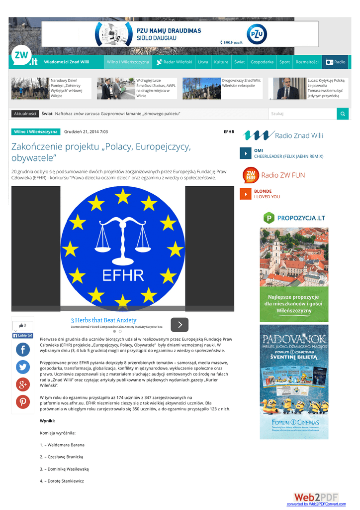 Wiadomości Znad Wilii Wilno i Wileńszczyzna Narodowy Dzień Pamięci „Żołnierzy Wyklętych” w Nowej Wilejce Aktualności Radar Wileński W drugiej turze Šimašius i Zuokas, AWPL na drugim miejscu w Wilnie Litwa Kultura Grudzień 21, 2014 7:03 Gospodarka Sport Rozmaitości Drogowskazy Znad Wilii: Wileńskie nekropolie Świat Naftohaz znów zarzuca Gazpromowi łamanie „zimowego pakietu” Wilno i Wileńszczyzna Świat Radio Lucas: Krytykuję Polskę, że pozwoliła Tomaszewskiemu być jedynym przywódcą litewskich Polaków Szukaj EFHR Zakończenie projektu „Polacy, Europejczycy, obywatele” 20 grudnia odbyło się podsumowanie dwóch projektów zorganizowanych przez Europejską Fundację Praw Człowieka (EFHR) - konkursu "Prawa dziecka oczami dzieci" oraz egzaminu z wiedzy o społeczeństwie. Radio Znad Wilii OMI CHEERLEADER (FELIX JAEHN REMIX) Radio ZW FUN BLONDE I LOVED YOU 3 Herbs that Beat Anxiety 0 Doctors Reveal 1 Weird Compound to Calm Anxiety that May Surprise You Lubię to! Pierwsze dni grudnia dla uczniów biorących udział w realizowanym przez Europejską Fundację Praw Człowieka (EFHR) projekcie „Europejczycy, Polacy, Obywatele” były dniami wzmożonej nauki. W wybranym dniu (3, 4 lub 5 grudnia) mogli oni przystąpić do egzaminu z wiedzy o społeczeństwie. Przygotowane przez EFHR pytania dotyczyły 8 przerobionych tematów – samorząd, media masowe, gospodarka, transformacja, globalizacja, konflikty międzynarodowe, wykluczenie społeczne oraz prawo. Uczniowie zapoznawali się z materiałem słuchając audycji emitowanych co środę na falach radia „Znad Wilii” oraz czytając artykuły publikowane w piątkowych wydaniach gazety „Kurier Wileński”. W tym roku do egzaminu przystąpiło aż 174 uczniów z 347 zarejestrowanych na platformie wos.efhr.eu. EFHR niezmiernie cieszy się z tak wielkiej aktywności uczniów. Dla porównania w ubiegłym roku zarejestrowało się 350 uczniów, a do egzaminu przystąpiło 123 z nich. Wyniki: Komisja wyróżniła: 1. – Waldemara Barana 2. – Czesławę Branicką 3. – Dominikę Wasilewską 4. – Dorotę Stankiewicz converted by Web2PDFConvert.com 5. – Gretę Rodziewicz 6. – Monikę Geglis 7. – Wiktorię Jasevičiūtė 8. -Gretę Dudeń 9. Julię Gotowski 10. Dominikę Żukowską 11. Alberta Arlukowicza 12. Dariusza Kryzanowskiego 13. Agatę Bielską 14. Marzenę Franckiewicz 15. Martę Chmielewską 16. Kamilę Tomaszewską Trzecie miejsce z wynikiem 97,5 pkt zdobyłaa Gabriela Jasińska, z Gimnazjum im. J. Pawła II Drugie miejsce otrzymał Rafał Kubarewicz, który uzyskał 98 pkt., (Szkoła im. Czesława Miłosza w Pakienie). Pierwsze miejsce z wynikiem 100 pkt zdobyła Ewelina Tymul, z Gimnazjum im. Jana Pawła II Na gali odbyło się również rozstrzygnięcie konkursu plastycznego „Prawa dziecka oczami dzieci”, do którego prace można było nadsyłać do 18 grudnia. Wyniki: Wyróżnienia otrzymali: 1. Gabriela Daszkiewicz, 5 kl., Szkoła Aleksandra Puszkina 2. Daniel Bukin, 6 kl, 11 lat, Szkoła Średnia im. Elizy Orzeszkowej w Białej Wace 3. Wiktoria Grablewska, 13 lat / 7 klasa, Szkola Podstawowa w Kiwiszkach Nagrody główne w konkursie otrzymują: Trzecie miejsce zdobył Erika K., 7 kl., 13 m., Szkoła podstawowa im. Czesława Miłosza w Pakiene Drugą nagrodę otrzymała Kamila Anna Herman, 13 lat/8 klasa, Gimnazjum im. F. Ruszczyca w Rudominie Pierwsze miejsce zdobyła Koleta Jenkelevic, 14 lat/8 klasa, Gimnazjum Jana Pawła II Dodaj komentarz... Dodaj komentarz Wtyczka społecznościowa Facebooka Tomaszewski zachowuje status quo Palewicz: Ten wynik jest historycznym zwycięstwem Lider AWPL nie zdradza, kogo poprze w drugiej turze Akcja Wyborcza Polaków na Litwie w koalicji z Aliansem Rosjan osiągnęła lepsze wyniki niż w poprzednich wyborach – komentuje lider polskiej partii Waldemar Tomaszewski. Polityk nie zdradza na razie, kogo poprze w drugiej turze wyborów mera Wilna. AWPL poza koalicją w Wilnie? Politolog: Zuokas będzie desperacko zabiegał o poparcie Tomaszewskiego W drugiej turze Šimašius i Zuokas, AWPL na drugim miejscu w Wilnie converted by Web2PDFConvert.com Lucas: Krytykuję Polskę, że pozwoliła Tomaszewskiemu być jedynym przywódcą litewskich Polaków Tomaszewski: Nie tylko mniejszości narodowe na nas głosują Waldemar Tomaszewski po przybyciu do sztabu wyborczego, który znajduje się w Domu Kultury Polskiej w Wilnie, oświadczył dziennikarzom, że sytuacja geopolityczna nie miała wpływu na jego wynik wyborczy, nie chciał jednak powiedzieć z kim AWPL byłaby w koalicji w Wilnie. Palewicz i Rekść zostają na swoich stanowiskach Tomaszewski i Šimašius wyprzedzają Zuokasa? Rekść: Nigdy nie obiecywałam wyborcom czegoś bez pokrycia Mer rejonu wileńskiego Maria Rekść w tegorocznych bezpośrednich wyborach władz lokalnych zdobyła ponad 60 proc. poparcie. W Mejszagole członek komisji nie chciał zezwolić na pracę dziennikarzy 400 osób na marszu pamięci Borysa Niemcowa w Wilnie Duża frekwencja w rejonie solecznickim i Rudominie. „Po mszy świętej ma być więcej” Czubiński o Żołnierzach Wyklętych: Pamięć o nich, to element codziennego patriotyzmu Tomaszewski nie chciał wypowiedzieć się ws. drugiej tury Politycy oraz kandydaci, którzy już oddali swój głos w wyborach samorządowych, sądzą, że na przyszłych merach będzie spoczywała duża odpowiedzialność. Więcej informacji ZW.lt w Twoim smartfonie Ostatnio dodane Linkevičius weźmie udział w pogrzebie Niemcowa Naftohaz znów zarzuca Gazpromowi łamanie „zimowego pakietu” Praca w EFHR Kolejne wybory uzupełniające do sejmu Dzielimy się informacjami! Pobierz na Androida TWITTER Tweety Portal Obserwuj Radio Znad Wilii 32min @RadioZnadWilii1 Linkevičius weźmie udział w pogrzebie #Niemcow @LinkeviciusL zw.lt/litwa/linkevic… Radio Znad Wilii 1godz. @RadioZnadWilii1 #Tomaszewski zachowuje status quo @InneWilno zw.lt/wilno-wilenszc… Radio Znad Wilii @Rad