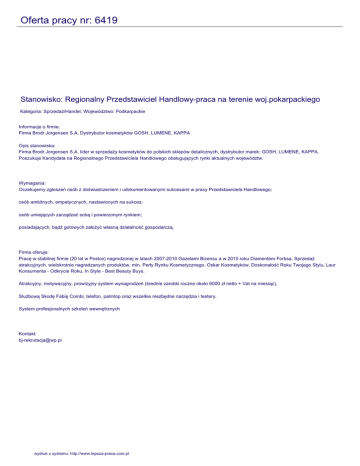 Oferta pracy nr: 6419 Stanowisko: Regionalny Przedstawiciel Handlowy-praca na terenie woj.pokarpackiego Kategoria: Sprzedaż/Handel, Województwo: Podkarpackie Informacje o firmie: Firma Brodr.Jorgensen S.A. Dystrybutor kosmetyków GOSH, LUMENE, KAPPA Opis stanowiska: Firma Brodr.Jorgensen S.A. lider w sprzedaży kosmetyków do polskich sklepów detalicznych, dystrybutor marek: GOSH, LUMENE, KAPPA. Poszukuje Kandydata na Regionalnego Przedstawiciela Handlowego obsługujących rynki aktualnych województw. Wymagania: Oczekujemy zgłoszeń osób z doświadczeniem i udokumentowanymi sukcesami w pracy Przedstawiciela Handlowego; osób ambitnych, empatycznych, nastawionych na sukces; osób umiejących zarządzać sobą i powierzonym rynkiem; posiadających, bądź gotowych założyć własną działalność gospodarczą. Firma oferuje: Pracę w stabilnej firmie (20 lat w Poslce) nagrodzonej w latach 2007-2010 Gazelami Bizensu a w 2010 roku Diamentem Forbsa. Sprzedaż atrakcyjnych, wielokrotnie nagradzanych produktów. min. Perły Rynku Kosmetycznego, Oskar Kosmetyków, Doskonałość Roku Twojego Stylu, Laur Konsumenta - Odkrycie Roku, In Style - Best Beauty Buys. Atrakcyjny, motywacyjny, prowizyjny system wynagrodzeń (średnie zarobki roczne około 6000 zł netto + Vat na miesiąc), Służbową Skodę Fabię Combi, telefon, palmtop oraz wszelkie niezbędne narzędzia i testery. System profesjonalnych szkoleń wewnętrznych Kontakt: [email protected] wydruk z systemu: http://www.lepsza-praca.com.pl