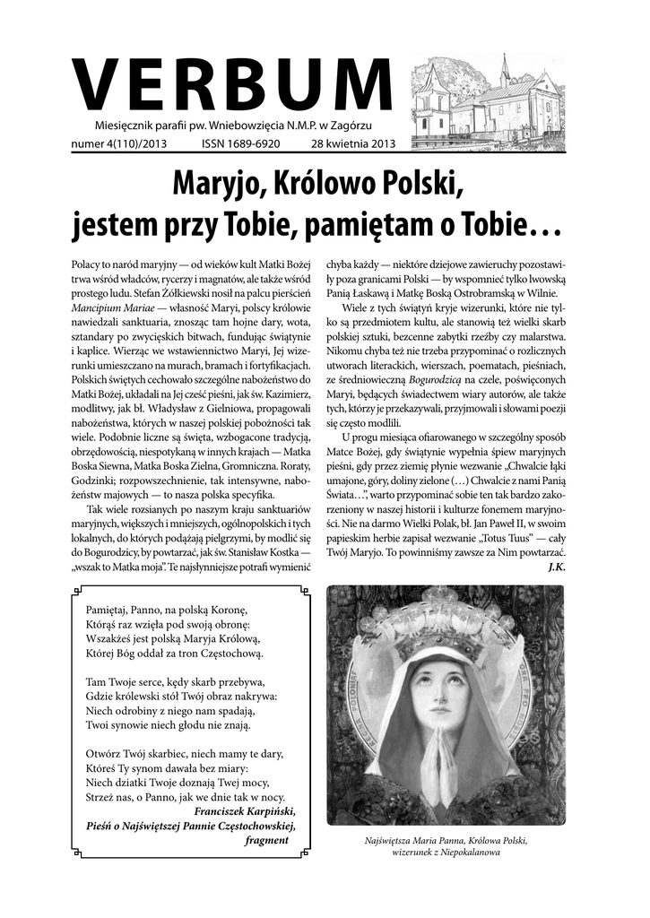 VERBUM Miesięcznik parafii pw. Wniebowzięcia N.M.P. w Zagórzu numer 4(110)/2013 ISSN 1689-6920 28 kwietnia 2013 Maryjo, Królowo Polski, jestem przy Tobie, pamiętam o Tobie… Polacy to naród maryjny — od wieków kult Matki Bożej trwa wśród władców, rycerzy i magnatów, ale także wśród prostego ludu. Stefan Żółkiewski nosił na palcu pierścień Mancipium Mariae — własność Maryi, polscy królowie nawiedzali sanktuaria, znosząc tam hojne dary, wota, sztandary po zwycięskich bitwach, fundując świątynie i kaplice. Wierząc we wstawiennictwo Maryi, Jej wizerunki umieszczano na murach, bramach i fortyfikacjach. Polskich świętych cechowało szczególne nabożeństwo do Matki Bożej, układali na Jej cześć pieśni, jak św. Kazimierz, modlitwy, jak bł. Władysław z Gielniowa, propagowali nabożeństwa, których w naszej polskiej pobożności tak wiele. Podobnie liczne są święta, wzbogacone tradycją, obrzędowością, niespotykaną w innych krajach — Matka Boska Siewna, Matka Boska Zielna, Gromniczna. Roraty, Godzinki; rozpowszechnienie, tak intensywne, nabożeństw majowych — to nasza polska specyfika. Tak wiele rozsianych po naszym kraju sanktuariów maryjnych, większych i mniejszych, ogólnopolskich i tych lokalnych, do których podążają pielgrzymi, by modlić się do Bogurodzicy, by powtarzać, jak św. Stanisław Kostka — „wszak to Matka moja”. Te najsłynniejsze potrafi wymienić chyba każdy — niektóre dziejowe zawieruchy pozostawiły poza granicami Polski — by wspomnieć tylko lwowską Panią Łaskawą i Matkę Boską Ostrobramską w Wilnie. Wiele z tych świątyń kryje wizerunki, które nie tylko są przedmiotem kultu, ale stanowią też wielki skarb polskiej sztuki, bezcenne zabytki rzeźby czy malarstwa. Nikomu chyba też nie trzeba przypominać o rozlicznych utworach literackich, wierszach, poematach, pieśniach, ze średniowieczną Bogurodzicą na czele, poświęconych Maryi, będących świadectwem wiary autorów, ale także tych, którzy je przekazywali, przyjmowali i słowami poezji się często modlili. U progu miesiąca ofiarowanego w szczególny sposób Matce Bożej, gdy świątynie wypełnia śpiew maryjnych pieśni, gdy przez ziemię płynie wezwanie „Chwalcie łąki umajone, góry, doliny zielone (…) Chwalcie z nami Panią Świata…”, warto przypominać sobie ten tak bardzo zakorzeniony w naszej historii i kulturze fonemem maryjności. Nie na darmo Wielki Polak, bł. Jan Paweł II, w swoim papieskim herbie zapisał wezwanie „Totus Tuus” — cały Twój Maryjo. To powinniśmy zawsze za Nim powtarzać. J.K. Pamiętaj, Panno, na polską Koronę, Którąś raz wzięła pod swoją obronę: Wszakżeś jest polską Maryja Królową, Której Bóg oddał za tron Częstochową. Tam Twoje serce, kędy skarb przebywa, Gdzie królewski stół Twój obraz nakrywa: Niech odrobiny z niego nam spadają, Twoi synowie niech głodu nie znają. Otwórz Twój skarbiec, niech mamy te dary, Któreś Ty synom dawała bez miary: Niech dziatki Twoje doznają Twej mocy, Strzeż nas, o Panno, jak we dnie tak w nocy. Franciszek Karpiński, Pieśń o Najświętszej Pannie Częstochowskiej, fragment Najświętsza Maria Panna, Królowa Polski, wizerunek z Niepokalanowa Królowa Korony Polskiej Wielokrotnie już podejmowaliśmy w „Verbum” temat świąt maryjnych, wizerunków Bogarodzicy, kierowanych do Niej modlitw, tak się jednak złożyło, że jeszcze nie pisaliśmy bardziej szczegółowo o tak ważnej dla nas, Polaków, uroczystości, jaką jest Święto Matki Bożej Królowej Polski. Samo określenie Maryi jako Królowej towarzyszy chrześcijaństwu od jego początków. Królową ludzkości nazywa Maryję św. Andrzej z Krety, św. German pisze „Zasiądź (na tronie) o Pani, godzi się bowiem, byś, jako najchwalebniejsza wśród królów Królowa, zajęła najwyższe miejsce”. Św. Jan Damasceński określa Maryję jako „Królową, Władczynię i Panią” oraz „Panią wszelkiego stworzenia, podobnie nazywali Maryję św. Ildefons z Toledo, papież Grzegorz II. Wypowiedzi poprzedników streścił zaś św. Alfons Ligouri: „Ponieważ Najświętsza Maryja Panna została podniesiona do tak bardzo wzniosłej godności, że stała się Matką Króla królów, dlatego słusznie uwieńczył ją Kościół tytułem Królowej” (cyt. za: Encyklika Piusa XII „Ad coeli Reginam”). Oficjalnie, dla całej Polski, święto to wyznaczone zostało przez Kongregację Obrzędów na 3 maja oraz dołączone do Litanii Loretańskiej (pierwotnie Królowa Korony Polskiej, potem Królowa Polski) 12 października 1923 roku. Nie był to jednak bynajmniej początek tego kultu. Ma on długą i bardzo ciekawą historię, zataczającą kręgi o wiele dalej niż panorama z Jasnogórskiej wieży. Jako pierwszy nazwał Maryję Królową Polski i Polaków Grzegorz z Sambora, a było to już w drugiej połowie XIV wieku. Tym samym świadomość szczególnej, królewskiej opieki Maryi nad naszym narodem okazuje się jedną z najstarszych tego typu w Europie. Na początek XVII wieku datowana jest opowieść o objawieniach włoskiego mnicha, ojca Mancinelliego, współbrata św. Stanisława Kostki, który — modląc się przy grobie młodego Polaka, miał ujrzeć Matkę Bożą, ze św. Stanisławem u stóp. Gdy jezuita zawołał „Królowo Wniebowzięta, módl się za nami”, Maryja miała powiedzieć: „Dlaczego nie nazywasz mnie Królową Polski? Ja to Królestwo bardzo umiłowałam i wielkie rzeczy dla niego zamierzam, ponieważ osobliwą miłością do mnie płoną jego synowie”. Pobożny zakonnik udał się z pielgrzymką do Polski, tam został przyjęty przez króla Zygmunta III Wazę, a podczas modlitwy w katedrze wawelskiej zobaczył Maryję ponownie i usłyszał głos: „Ja jestem Królową Polski. Jestem Matką tego narodu, który jest mi bardzo drogi, wstawiaj się więc do mnie za nim, o pomyślność tej ziemi błagaj nieustannie, a