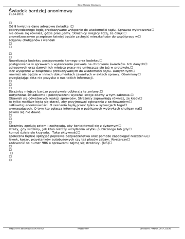 Straż Miejska Włocławek Świadek bardziej anonimowy 21.04.2015. Od 8 kwietnia dane adresowe świadka i pokrzywdzonego będą przekazywane wyłącznie do wiadomości sądu. Sprawca wykroczenia nie dowie się również, gdzie pracujemy. Strażnicy miejscy liczą, że dzięki znowelizowanym przepisom łatwiej będzie zachęcić mieszkańców do współpracy w ściganiu chuliganów i wandali Nowelizacja kodeksu postępowania karnego oraz kodeksu postępowania w sprawach o wykroczenia pozwala na chronienie świadków. Ich danych adresowych oraz danych ich miejsca pracy nie umieszcza się już w protokole, lecz wyłącznie w załączniku przekazywanym do wiadomości sądu. Danych tych również nie będzie w innych dokumentach zawartych w aktach sprawy. Obwiniony przeglądając akta nie pozyska o nas takich informacji. Strażnicy miejscy bardzo pozytywnie odbierają te zmiany. Dotychczas świadkowie i pokrzywdzeni wyrażali swoje obawy w tym zakresie. Obawiali się odwetowych reakcji sprawców. Strażnicy zapewniają również, że kiedy to tylko możliwe będą się starać, aby przyjmować zgłoszenia z zachowaniem całkowitej anonimowości. O zeznania będą prosić tylko w sytuacjach tego wymagających. O tym kto zgłasza informacje o publicznych wybrykach chuligan na pewno się nie dowie. Strażnicy apelują zatem i zachęcają, aby kontaktować się z dyżurnym straży, gdy widzimy, jak ktoś niszczy urządzenia użytku publicznego lub gdy komuś dzieje się krzywda. Taka aktywność społeczna będzie sprzyjać poprawie bezpieczeństwa oraz pomoże zapobiegać niszczeniu ławek, koszy, przystanków autobusowych czy też placów zabaw. Wystarczy zadzwonić na numer 986 a sprawcami zajmą się strażnicy. (NS) http://www.strazmiejska.um.wlocl.pl Kreator PDF Utworzono 7 March, 2017, 02:30