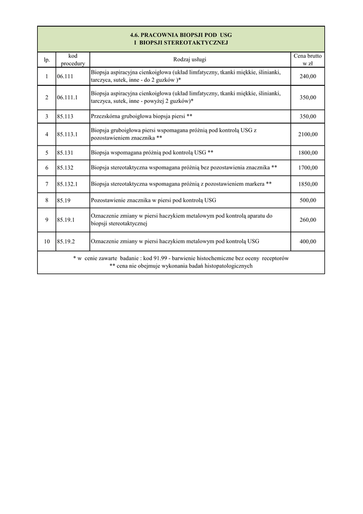 4.6. PRACOWNIA BIOPSJI POD USG I BIOPSJI STEREOTAKTYCZNEJ lp. kod procedury Rodzaj usługi Cena brutto w zł 1 06.111 Biopsja aspiracyjna cienkoigłowa (układ limfatyczny, tkanki miękkie, ślinianki, tarczyca, sutek, inne - do 2 guzków )* 240,00 2 06.111.1 Biopsja aspiracyjna cienkoigłowa (układ limfatyczny, tkanki miękkie, ślinianki, tarczyca, sutek, inne - powyżej 2 guzków)* 350,00 3 85.113 Przezskórna gruboigłowa biopsja piersi ** 350,00 4 85.113.1 Biopsja gruboigłowa piersi wspomagana próżnią pod kontrolą USG z pozostawieniem znacznika ** 2100,00 5 85.131 Biopsja wspomagana próżnią pod kontrolą USG ** 1800,00 6 85.132 Biopsja stereotaktyczna wspomagana próżnią bez pozostawienia znacznika ** 1700,00 7 85.132.1 Biopsja stereotaktyczna wspomagana próżnią z pozostawieniem markera ** 1850,00 8 85.19 Pozostawienie znacznika w piersi pod kontrolą USG 500,00 9 85.19.1 Oznaczenie zmiany w piersi haczykiem metalowym pod kontrolą aparatu do biopsji stereotaktycznej 260,00 10 85.19.2 Oznaczenie zmiany w piersi haczykiem metalowym pod kontrolą USG 400,00 * w cenie zawarte badanie : kod 91.99 - barwienie histochemiczne bez oceny receptorów ** cena nie obejmuje wykonania badań histopatologicznych