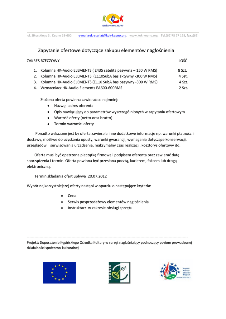 ul. Sikorskiego 3, Kępno 63-600, e-mail:[email protected], www.kok-kepno.org, Tel.(62)78 27 128, fax.:(62) Zapytanie ofertowe dotyczące zakupu elementów nagłośnienia ZAKRES RZECZOWY 1. 2. 3. 4. ILOŚĆ Kolumna HK-Audio ELEMENTS ( E435 satelita pasywna – 150 W RMS) Kolumna HK-Audio ELEMENTS (E110SubA bas aktywny -300 W RMS) Kolumna HK-Audio ELEMENTS (E110 SubA bas pasywny -300 W RMS) Wzmacniacz HK-Audio Elements EA600-600RMS 8 Szt. 4 Szt. 4 Szt. 2 Szt. Złożona oferta powinna zawierać co najmniej: Nazwę i adres oferenta Opis nawiązujący do parametrów wyszczególnionych w zapytaniu ofertowym Wartość oferty (netto oraz brutto) Termin ważności oferty Ponadto wskazane jest by oferta zawierała inne dodatkowe informacje np. warunki płatności i dostawy, możliwe do uzyskania upusty, warunki gwarancji, wymagania dotyczące konserwacji, przeglądów i serwisowania urządzenia, maksymalny czas realizacji, kosztorys ofertowy itd. Oferta musi być opatrzona pieczątką firmową i podpisem oferenta oraz zawierać datę sporządzenia i termin. Oferta powinna być przesłana pocztą, kurierem, faksem lub drogą elektroniczną. Termin składania ofert upływa 20.07.2012 Wybór najkorzystniejszej oferty nastąpi w oparciu o następujące kryteria: Cena Serwis posprzedażowy elementów nagłośnienia Instruktarz w zakresie obsługi sprzętu -----------------------------------------------------------------------------------------------------------------------------Projekt: Doposażenie Kępińskiego Ośrodka Kultury w sprzęt nagłaśniający podnoszący poziom prowadzonej działalności społeczno-kulturalnej