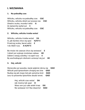 I. WEZWANIA 1. Na pobudkę czas Wilczku, wilczku na pobudkę czas CGC Wilczku, wilczku dzień już wzywa nas CGC Otwórz oczka, mundur włóż G Ze śpiworka wyłaź już C Wilczku, wilczku na pobudkę czas CGC 2. Wilczku, wilczku trzeba wstać Wilczku, wilczku trzeba wstać EA O, jak bardzo chce się spać H/H7 E Przetrzyj oczka, beret włóż E I do Akeli rusz. A H/H7 E Bo może nie zawsze chce się wstawać E I dzień już szykuje mnóstwo zabaw HE Zabierz swoją szóstkę i na apel rusz E By wschodzącym słońcem ucieszyć się już HE 3. Hej, wilczki Słoneczko już wysoko, świat pięknie iskrzy się DAD Wilczki pod śpiworkiem chrapią we śnie GAD Nudzę się jak mops lub jak samotny kret DAD Lecz ta piosenka śpiochów zbudzi wnet. GAD Hej, wilczki czas wstać DA Jak można tak spać D Wasz sen już całe wieki trwa DG No wstawać mi! Raz dwa!/x2 DAD 4. Koniec dnia Czas wieczorny nadszedł już d A/A7 d Wilczki kładą się do snu dCF Chociaż wokół ciemno jest FCd A7 Wilczki pamiętają, że GC A7 d Dobry Pan Bóg jest wśród nas FC By spokojnie minął czas, F/d Aby świtem zbudzić się FC I znów śpiewać słowa te gC A7 d Dobry Pan Bóg jest wśród nas FC I spokojnie minął czas C F/d Znów jest świt i jasny dzień FC Dzięki Boże za nasz sen. gC A7 d 5. Wilczki idą spać Au, au, au, au już wilczki kładą się do snu. DAD Au, au, au, au już wilczki idą spać. DGAD 6. Skały Narady to czas Skały Narady to czas, z oddali słychać wezwanie E H/H7 E Ze wszystkich sił biegnij tam gdzie H/H7 E Skały Narady to czas, Akela wzywa już nas E H/H7 E Ze wszystkich sił biegnij wnet abyś był tam, gdzie Radę zacząć już czas H H Skały Narady to czas, Akela wzywa gromadę E H/H7 E Wnet wilczki biegną na Radę H/H7 E Skały Narady to czas, Akela wzywa już nas E H/H7 E Ze wszystkich sił biegnij wnet abyś był Tam, gdzie radę zacząć już czas H H 7. Daleko z głębi Dżungli Daleko z głębi dżungli Akela wzywa nas. DAD Gromadzi wilczki wokół na Skałę woła wraz. DAD Wilczku, wilczku! Narady to już czas! DAD Wilczku, wilczku! Akela wzywa nas! DAD 8. Szóstka już się śpieszy Szustka już się śpieszy raz, dwa, trzy! CFGC Szybko przybiegniemy, żeby razem być. CGC Moja twoja szóstka, wszystkie już gotowe, C Akela czeka! FGC 9. Na posiłek stary wilk: Nadszedł czas wilczki na posiłek! DA Nadszedł czas wilczki na posiłek! DA Przerwijcie śpiewy, przerwijcie krzyk, DG Koniec zabawy do stołu w mig! GDGAD wilczki: Najwyższa pora, zgłodnieliśmy! DA Najwyższa pora, zgłodnieliśmy! AD Bogu dziękując za dary te, DG Ciesząc się tobą, będziemy jeść. GDAD 10. Czerwone kwiecie Kiedy już wieczór zbliża się, Akela wzywa wilczki swe. GCDGCDG W czerwonym kwieciu grzejemy łapki, DG Gdy czar opowieści wiedzie nas (tam, gdzie…). CDGG II O PRAWIE I ZASADACH 11. Na wyciągnięcie flagi Niech na błękitnym niebie tak powiewa flaga ta, DAD Nasz mundur niechaj zdobi też, to polskich wilczków znak. DAD Symboli tych będziemy strzec i kochać chcemy je, GDA GDA By zawsze móc radować się z tego, kim wilczek jest! GDA GAD Chrystusa krzyż czerwienią swą niech przypomina nam, Tę miłość, którą człowiek-Bóg obdarzyć ludzi chciał. Pamięci tej będziemy strzec, by dobre życie wieść, By zawsze móc radować się z tego, kim wilczek jest! Franciszek Święty, patron nasz przykładem będzie nam, Jak dzień ten przeżyć, wielbiąc to, co dobry Pan Bóg dał. Tak proste życie chcemy nieść do Boga modląc się, By zawsze móc radować się z tego, kim wilczek jest! Uczynkiem dobrym trzeba też bliźniego wesprzeć nam, By kończąc dzień być pewnym, że świat znów się lepszym stał. Tak postanawiam Panie nasz i przy tym wytrwać chcę, By zawsze móc radować się z tego, kim wilczek jest! 12. Wilczku, nie zapomnij Wilczku nie zapomnij o swej obietnicy, C (G) Zawsze podążaj za starym wilkiem w trop. CFGC 13. Wilk młody Wilk młody wilk, wilk młody wilk D Zawsze śpiewa, śpiewa, śpiewa, A Ze wszystkich sił! D Wilk stary, wilk stary D Zawsze śpiewa, śpiewa, śpiewa, Ze wszystkich sił! D A 14. Nocny śpiew Dżungli Hejże nadszedł czas luby hA Naszej siły i chluby hA Górą kły, pazury i szpony. GAh Hej, słuchajcie wezwania hA Dobrych łowów każdemu, hA Kto praw strzeże dżungli zielonej. GAh 15. Akela, Bagheera (I) Akela, Bagheera - chcemy żyć ze wszystkich sił! CGCG Akela, Bagheera - by świat lepszy był CGCGC Biała, szara, czarna też Czy gromada cała jest? Wiwat ja, wiwat ty Siostry jednej krwi! G C CG CGC Jeszcze nam brunatnej brak Jest już cała rodzinka Wiwat ja, wiwat ty Siostry jednej krwi! Cała nora czysta już Wysprzątany wszystek kurz Wiwat ja, wiwat ty Siostry jednej krwi! Akela, Bagheera (II) Akela Bagheera – wszystkie siły zwarte! CGCG Akela, Bagheera – oczy otwarte! CGCGC Stolik wyczyszczony już, G Wysprzątany wszystek kurz. C Wiwat czarne! Wiwat białe! CG Dzielne wilczki małe! CGC Gwiazdek na berecie wbród, Pracowity wilczków ród. Wiwat szare i brązowe! Wilczki niestrudzone! Totem cały kolorowy, Od wstążeczek wywalczonych. Ciężka to robota, Dla wilczka radocha! 16. Ty i ja jesteśmy jednej krwi Niedźwiedź Baloo, nauczyciel wciąż do głowy kładł, D Że przyjaciół wokół siebie w całej dżungli masz. A (A7) Ref. Ty i ja jednej krwi jesteśmy, DAD wykrzycz to, a wnet zrozumiesz, że... DAD Braci masz swój uśmiech im roześlij. DAD Ja i ty jesteśmy jednej krwi. DAD Gdy kłopoty cię spotkają miej w pamięci to, Do pomocy miej przyjaciół, właśnie po to są. Gdy usłyszysz zawołanie nie zapomnij, że Ktoś od ciebie twej pomocy także może chcieć. W dżungli biega wiele gromad każda inna jest, Ale miło jest je spotkać, gdy pamiętasz, że… Kiedy zbiórka się już kończy i do domu czas, To pamiętaj w domu, w szkole, że przyjaciół masz. Kiedy znów kolejnym razem zbiórka zacznie się, Nie zapomnij ważnej prawdy, która głosi, że… 17. Drugie prawo