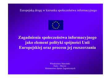 Europejską drogę w kierunku społeczeństwa informacyjnego Zagadnienia społeczeństwa informacyjnego jako element polityki spójności Unii Europejskiej oraz procesu jej rozszerzania Włodzimierz Marciński Radca – Minister Ministerstwo Spraw Zagranicznych Symbolem XX wieku stał się ... Symbol XXI wieku ? Społeczeństwo informacyjne potrafiące tworzyć i wykorzystywać informacje z korzyścią dla siebie i swego otoczenia konwergencja technologiczna • telekomunikacja • media • informatyka elektronika, miniaturyzacja, łączność satelitarna digitalizacja obrazu, dźwięku, tekstu internet konwergencja technologiczna • sieci telekomunikacyjne wykorzystywane są dla potrzeb internetu, łączności telefonicznej, przekazu medialnego, • komputer wykorzystywany jest jako uniwersalne narzędzie w pracy, do odbioru telewizji, przeglądania prasy, • technika cyfrowa wykorzystywana jest w produkcjach filmowych, muzycznych • telefonia 3G, optyka cyfrowa, systemy GPRS .... konkurencja – podstawą rozwoju • Czynnikami dynamizmu gospodarczego USA są: – rozwój technologii teleinformatycznych, produkcji oprogramowania – wykorzystanie internetu na wielką skalę w nauce, biznesie, w procesach informacyjnych Internet ma się dobrze • biznes zdecydowanie i nieodwołalnie zaakceptował internet jako narzędzie pracy • proces konwergencji tworzy w obszarze telekomunikacji, informatyki i mediów obiecujący gospodarczo rynek • rosną możliwości aktywizacji małych i średnich przedsiębiorstw oraz gorzej usytuowanych regionów • gospodarka globalna, oparta na wiedzy i sieciach, w coraz większym stopniu niezależna jest od krajów wnioski z debaty europejskiej • narzędzia elektronicznej gospodarki umożliwiają lepszą, efektywniejszą organizację Wspólnego Rynku, aktywizację małych i średnich przedsiębiorstw, regionów • inwestycje w sektorach telekomunikacji, technologii informatycznej i informacyjnej, mediów, są najbardziej dochodowe i perspektywiczne • pozostanie w tyle w rozwoju tych sektorów może spowodować nieodwracalną przepaść i degradację wnioski z debaty europejskiej • jedynie wykształcone i zdolne do absorpcji wiedzy społeczeństwa mogą skutecznie budować nowoczesną, konkurencyjną gospodarkę oraz jednocześnie uczestniczyć w efektach, które ona przynosi • poprawa warunków funkcjonowania rynku europejskiego podnosi jego konkurencyjność w stosunku do innych regionów świata Strategia Lizbońska budowa do 2010 roku „najbardziej konkurencyjnej i dynamicznej, opartej na wiedzy gospodarki świata, zdolnej do trwałego a jednocześnie zrównoważonego wzrostu ekonomicznego, charakteryzującej się wysokim poziomem zatrudnienia i spójności społecznej”. Strategia Lizbońska Jednymi z filarów strategii są: • rozwój społeczeństwa informacyjnego, • badań naukowych (gospodarka oparta na wiedzy) • liberalizacja i integracja rynku telekomunikacyjnego inicjatywa eEurope An Information Society for All • wprowadzenie mieszkańców Europy w wiek cywilizacji cyfrowej, • tworzenie Europy zdolnej do spożytkowywania informacji cyfrowej, konkurencyjnej w stosunku do reszty świata, wspierającej kreatywną kulturę, gotowej do finansowania i rozwoju nowych idei, • zapewnienie, aby dokonujące się procesy tworzyły zaufanie i wzmacniały jedność. inicjatywa eEurope An Information Society for All realizacja zadań inicjatywy w ramach planów działania • eEurope2002 • eEurope+2003 • eEurope2005 eEurope2002 priorytety: • rozbudowa infrastruktury dostępu do szybkiego, taniego internetu • inwestowanie w ludzi i ich umiejętności • pobudzanie i popularyzacja zastosowań opartych na internecie eEurope+2003 priorytety: • stworzenie narodowych planów rozwoju społeczeństwa informacyjnego • przyjęcie tych samych celów co eEurope2002, • pierwsze wspólnie uzgodnione działanie Komisji Europejskiej oraz krajów kandydujących eEurope2005 priorytety: • rozwój usług, aplikacji oraz treści dostępnych elektronicznie (e-Government, e-Learninig, e-Haelth, e-Business) • rozwój infrastruktury szerokopasmowej oraz bezpieczeństwa przekazu i przetwarzania informacji znaczenie inicjatywy eEurope • scalenie debaty europejskiej na tematy społeczeństwa informacyjnego w postaci jednego spójnego przedsięwzięcia • nadanie wysokiej rangi politycznej zagadnieniom społeczeństwa informacyjnego, • działanie na rzecz spójności europejskiej poprzez uzgodnienie i realizację wspólnych celów wiosenny szczyt UE w 2006 r. • Tzw. odnowione perspektywy Strategii Lizbońskiej • Potwierdzenie znaczenia tematyki społeczeństwa informacyjnego oraz ICT dla rozwoju UE • Zalecenie Komisji Europejskiej oraz Członkom UE konsekwentną implementację inicjatywy i2010 • Kraje członkowskie UE zobowiązały się uwzględnić ICT w Narodowych Planach Reform traktując priorytetowo zagadnienia eGovernment, sieci szerokopasmowej i edukacji cyfrowej (digital literacy). i2010 – priorytety 2006 -2007 • Wspólna europejska przestrzeń informacyjna: eCommunications - przegląd, strategia w obszarze częstotliwości, broadband, roaming, TV bez granic, Film Online, .eu • Innowacyjność i inwestycje w badania i rozwój ICT: konsultacje RFID, europejskie platformy technologiczne, 7PR B&R, ICT Task Force • Wykluczenie, efektywniejsze usługi sektora publicznego, poprawa jakości życia: eAccessibility, Broadband, digital divide, eGovernment Action Plan, eHealth, Intelligent Cars, European Digital Library zagadnienia Społeczeństwa informacyjnego – czynnikiem rozwoju • • • • Edukacja, rozwój cywilizacyjny, Zmiana jakości pracy oraz życia, Wyrównywanie szans społecznych, zacieranie granic Podaż treści oraz usług w postaci cyfrowej • Przedsiębiorczość i innowacyjność • Bezpieczeństwo sieci i systemów filary społeczeństwa informacyjnego Treści i usługi Edukacja Dostępność inf