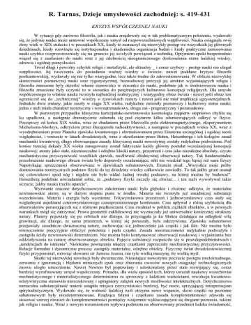 R. Tarnas, Dzieje umysłowości zachodniej: s. 419-431 KRYZYS WSPÓŁCZESNEJ NAUKI W sytuacji gdy zarówno filozofia, jak i nauka znajdowały się w tak problematycznym położeniu, wydawało się, że jedynie nauka może uratować współczesny umysł od rozpowszechnionych wątpliwości. Nauka osiągnęła swój złoty wiek w XIX stuleciu i w początkach XX, kiedy to zaznaczył się niezwykły postęp we wszystkich jej głównych dziedzinach, kiedy rozwinęła się instytucjonalna i akademicka organizacja badań i kiedy praktyczne zastosowania nauki szybko rozprzestrzeniały się na gruncie jej ścisłych powiązań z techniką. Optymizm epoki bezpośrednio wiązał się z zaufaniem do nauki oraz z jej zdolnością nieograniczonego doskonalenia stanu ludzkiej wiedzy, zdrowia i ogólnej pomyślności. Trwał długi i powolny schyłek religii i metafizyki, ale aktualny _ i coraz szybszy - postęp nauki nie ulegał wątpliwości. Jej roszczenia do posiadania ważnej wiedzy o świecie, nawet poddane krytyce filozofii postkantowskiej, wydawały się nie tylko wiarygodne, lecz także trudne do zakwestionowania. W obliczu niezwykłej skuteczności poznawczej nauki oraz rygorystycznej, bezosobowej precyzji jej struktur wyjaśniających religia i filozofia zmuszone były określić własne stanowisko w stosunku do nauki, podobnie jak w średniowieczu nauka i filozofia zmuszone były uczynić to w stosunku do potężniejszych kulturowo koncepcji religijnych. Dla umysłu współczesnego to właśnie nauka tworzyła najbardziej realistyczny i wiarygodny obraz świata - nawet jeśli obraz ten ograniczał się do „technicznej" wiedzy o zjawiskach natury i nawet jeśli nie miał implikacji egzystencjalnych. Jednakże dwie zmiany, jakie zaszły w ciągu XX wieku, radykalnie zmieniły poznawczy i kulturowy status nauki; jedna z nich miała charakter teoretyczny i wewnątrznaukowy, druga zaś - pragmatyczny i pozanaukowy. W pierwszym przypadku klasyczna kartezjańsko-newtonowska kosmologia najpierw stopniowo chyliła się ku upadkowi, a następnie dramatycznie załamała się pod ciężarem kilku zdumiewających odkryć w fizyce. Począwszy od końca XIX wieku, wraz ze zbadaniem przez Maxwella pola elektromagnetycznego, eksperymentem Michelsona-Morleya, odkryciem przez Becquerela radioaktywności, a następnie w początkach wieku XX, wraz z wyodrębnieniem przez Plancka zjawiska kwantowego i sformułowaniem przez Einsteina szczególnej i ogólnej teorii względności, i wreszcie w latach dwudziestych, wraz z określeniem przez Bohra, Heisenberga i ich kolegów zasad mechaniki kwantowej, długo obowiązujące zasady klasycznej nauki nowożytnej zostały radykalnie podważone. Pod koniec trzeciej dekady XX wieku zanegowany został faktycznie każdy główny postulat wcześniejszej koncepcji naukowej: atomy jako stałe, niezniszczalne i odrębne klocki natury, przestrzeń i czas jako niezależne absoluty, czysto mechanistyczna przyczynowość wszelkich zjawisk, możliwość obiektywnej obserwacji natury. Tak fundamentalne przeobrażenie naukowego obrazu świata było doprawdy oszałamiające, nikt nie wiedział tego lepiej niż sami fizycy Napotykając sprzeczności obserwowane w zjawiskach subatomowych, Einstein pisał: „Wszystkie moje próby dostosowania teoretycznych podstaw fizyki do tej dziedziny wiedzy całkowicie zawiodły. To tak jakby grunt usunął się człowiekowi spod nóg i nigdzie nie było widać żadnej trwałej podstawy, na której można by budować". Heisenberg podobnie uświadamiał sobie, że „podstawy fizyki zaczęły się chwiać... i ten ruch wywoływał takie uczucie, jakby nauka traciła oparcie". Wyzwanie rzucone dotychczasowym założeniom nauki było głębokie i złożone: odkryto, że materialne newtonowskie atomy są w dużym stopniu puste w środku. Materia nie tworzyła już zasadniczej substancji wszechświata. Materia i energia były wymienne. Trójwymiarowa przestrzeń i jednowymiarowy czas stały się względnymi aspektami czterowymiarowego czasoprzestrzennego kontinuum. Czas upływał z różną szybkością dla obserwatorów poruszających się z różnymi prędkościami. Czas zwalniał w pobliżu ciężkich obiektów, a w pewnych warunkach mógł się zatrzymać. Prawa geometrii euklidesowej nie wyznaczały już uniwersalnie koniecznej struktury natury. Planety pojawiały się po orbitach nie dlatego, że przyciągała je ku Słońcu działająca na odległość siłą grawitacji, ale dlatego, że sama przestrzeń, w której się poruszały, była zakrzywiona. Zjawiska subatomowe przejawiały zasadniczo dwuznaczną naturę, zachowując się jednocześnie jak cząstki i jak fale. Nie można było równocześnie precyzyjnie obliczyć położenia i pędu cząstki. Zasada nieoznaczoności radykalnie podważyła i zastąpiła ścisły newtonowski determinizm. Nie można było kontynuować obserwacji naukowej i wyjaśniania bez oddziaływania na naturę obserwowanego obiektu. Pojęcie substancji rozpuściło się w prawdopodobieństwach i „tendencjach do istnienia". Nielokalne powiązania między cząstkami zaprzeczały mechanistycznej przyczynowości. Relacje formalne i dynamiczne procesy zastąpiły materialne, odrębne obiekty. Fizyczny świat dwudziestowiecznej fizyki przypominał, mówiąc słowami sir Jamesa Jeansa, nie tyle wielką maszynę, ile wielką myśl. Skutki tej niezwykłej rewolucji były dwuznaczne. Nieustające nowożytne poczucie postępu intelektualnego, zerwania z ignorancją i błędami minionych epok oraz zbierania owoców nowych osiągnięć technologicznych znowu uległo umocnieniu. Nawet Newton był poprawiany i udoskonalany przez stale rozwijający się, coraz bardziej wyrafinowany umysł współczesny. Ponadto, dla wielu spośród tych, którzy uważali naukowy wszechświat mechanistycznego i materialistycznego determinizmu za sprzeczny z ludzkimi wartościami, rewolucja kwantoworelatywistyczna stanowiła nieoczekiwany i upragniony zal