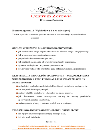 Harmonogram 12 Wykładów ( 1 x w miesiącu) Termin wykładu – zostanie podany na stronie internetowej z wyprzedzeniem 1 miesiąca OGÓLNE WSKAZÓWKI DLA ZDROWEGO ODŻYWIANIA jak kształtować swoja odpowiedzialność za zdrowie swoje i swojej rodziny jak wzmacniać nasz system trawienny, pożywienie dostosowane do pór roku, jak odróżnić zachciankę od prawdziwej potrzeby organizmu, żywność ekologiczna , a żywność przetworzona, praktyczne wskazówki przydatne przy układaniu dziennego jadłospisu KLASYFIKACJA PRODUKTÓW SPOŻYWCZYCH – JAKĄ PRAKTYCZNA WIEDZĘ MOŻEMY Z TEGO POZYSKAĆ I JAKI WPŁYW MA ONA NA NASZE ZDROWIE zachodnie i wschodnie podejście do klasyfikacji produktów spożywczych, natura produktów spożywczych, metody obróbki produktów i ich wpływ na nasze zdrowie, jak dostosować naszą wewnętrzną naturę do natury produktów spożywczych i metod ich obróbki, wykorzystanie wiedzy o naturze produktów w praktyce, PIĘC SMAKÓW; KWAŚNY, GORZKI, SŁODKI, OSTRY, SŁONY ich wpływ na poszczególne narządy naszego ciała, ich kierunek działania, 3|Strona Mirka Tetzlaff, ul. Dębogórska 64; 84-230 Rumia; NIP: 5861036887; Regon:190864492 e-mail: [email protected]; tel. 501-050-241; www.dyniowazagroda.pl praktyczne wykorzystanie powyższej znajomości działania smaków [profilaktyce zdrowotnej np. przy przeziębieniu, otyłości, cukrzycy , menopauzie, alergii i innych chorób ODŻYWIANIE MATKI I MAŁEGO DZIECKA dolegliwości okresu ciąży i sposoby radzenia sobie z nimi, odżywianie matki po porodzie i w okresie karmienia, sposoby odżywiania dzieci od poczęcia do 2 roku życia, postępowanie w przypadku kolek i alergii- przyczyny ich występowania ODŻYWIANIE DZIECI PRZEDSZKOLNYCH I WCZESNOSZKOLNYCH jakie pokarmy budują zdrowie naszych dzieci, czyli krótka opowieść o naturze produktów, nasze podejście do alergii pokarmowych u dzieci; jeść czy unikać?, jak odżywiać dzieci, aby były zdrowe i szczęśliwe, jakiego smaku dziecko potrzebuje najbardziej do swojego wzrastania praktyczne porady jak komponować atrakcyjne i zdrowe posiłki dla naszych dzieci. WSPÓŁCZESNE POGLADY DIETETYCZNE Z PERSPEKTYWY MISJI CENTRUM ZDROWIA DYNIOWA ZAGRODA – ZREZYGNUJ Z DIETY PRZEJDŹ NA ODŻYWIANIE dieta śródziemnomorska, dieta wegetariańska, dieta glikemiczna, dieta tłuszczowa, białkowa, dieta wg grupy krwi, dieta kwasowo-zasadowa, dieta diamondów 4|Strona Mirka Tetzlaff, ul. Dębogórska 64; 84-230 Rumia; NIP: 5861036887; Regon:190864492 e-mail: [email protected]; tel. 501-050-241; www.dyniowazagroda.pl WSCHODNIE I ZACHODNIE PODEJŚCIE DO ZDROWIA, CZYLI OPOWIEŚĆ O KOCHANYM ZDROWIU, O KTÓRYM NIKT SIĘ NIE DOWIE ILE KOSZTUJE, AŻ SIĘ ZEPSUJE co to jest zdrowie, czynniki wpływające na stan zdrowia, jak zestarzeć się w zdrowiu, czy istnieją produkty zdrowe dla wszystkich, czy suplementacja jest zdrowa, prawda i mity na temat zdrowego odżywiania JEDZ ZGODNIE Z PORAMI ROKU: WIOSNA, LATO, BABIE LATO, JESIEŃ, ZIMA jakie metody gotowania i jakie produkty wybierać w poszczególnych porach roku, gotowanie wg Pięciu przemian, krótki pokaz sposobu gotowania wg Pięciu Przemian, ZDROWE PODEJŚCIE DO OCZYSZCZANIA ORGANIZMU sposoby oczyszczania organizmu, najlepszy czas na oczyszczanie organizmu, czyli czy nasz organizm zadowolony jest z zabiegów , które mu fundujemy środku zimy? jak bezpiecznie przeprowadzić we własnym zakresie oczyszczanie w domu, praktyczne porady ODPORNOŚĆ ORGANIZMU I SPOSOBY JEJ BUDOWANIA co to jest odporność i jak ja kształtować, etapy naruszenia odporności, zalecenia w celu utrzymania odporności, 5|Strona Mirka Tetzlaff, ul. Dębogórska 64; 84-230 Rumia; NIP: 5861036887; Regon:190864492 e-mail: [email protected]; tel. 501-050-241; www.dyniowazagroda.pl praktyczne porady: jak uchronić się przed infekcją i przeziębieniem oraz naturalne sposoby powrotu do zdrowia CHOROBY CYWILIZACYJNE- OTYŁOŚĆ W UJĘCIU TMC rodzaje otyłości, objawy, zasady leczenia, zalecenia dietetyczne, metody gotowania Praca z otyłością wiąże się z odżywianiem, a nie głodowaniem. Zrezygnuj z diety przejdź na odżywianie i poczuj się dobrze w swoim ciele. CHOROBY CYWILIZACYJNE- CUKRZYCA I I II STOPNIA W UJĘCIU TMC typy cukrzycy, symptomy choroby i atlas zachowań, jaki „wewnętrzny klimat” reprezentuje cukrzyca typu I , a jaki typu II , dobór odpowiednich produktów i sposobów ich obróbki w przypadku obu typów cukrzycy, jak ustrzec się powikłań, które niesie za sobą cukrzyca, jak słodzić , aby nie zaszkodzić. W załączeniu materiał reklamowy i zdjęcia CENTRUM ZDROWIA DYNIOWA ZAGRODA. Z wyrazami szacunku Mirosława Tetzlaff 6|Strona Mirka Tetzlaff, ul. Dębogórska 64; 84-230 Rumia; NIP: 5861036887; Regon:190864492 e-mail: [email protected]; tel. 501-050-241; www.dyniowazagroda.pl