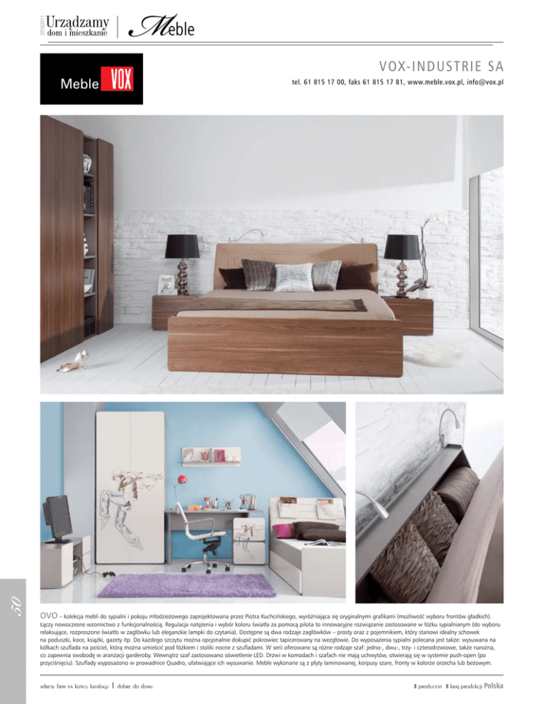 2010/2011 M eble VOX-IND U S T R I E S A 50 tel. 61 815 17 00, faks 61 815 17 81, www.meble.vox.pl, [email protected] OVO – kolekcja mebli do sypialni i pokoju młodzieżowego zaprojektowana przez Piotra Kuchcińskiego, wyróżniająca się oryginalnymi grafikami (możliwość wyboru frontów gładkich). Łączy nowoczesne wzornictwo z funkcjonalnością. Regulacja natężenia i wybór koloru światła za pomocą pilota to innowacyjne rozwiązanie zastosowane w łóżku sypialnianym (do wyboru relaksujące, rozproszone światło w zagłówku lub eleganckie lampki do czytania). Dostępne są dwa rodzaje zagłówków – prosty oraz z pojemnikiem, który stanowi idealny schowek na poduszki, koce, książki, gazety itp. Do każdego szczytu można opcjonalnie dokupić pokrowiec tapicerowany na wezgłowie. Do wyposażenia sypialni polecana jest także: wysuwana na kółkach szuflada na pościel, którą można umieścić pod łóżkiem i stoliki nocne z szufladami. W serii oferowane są różne rodzaje szaf: jedno-, dwu-, trzy- i czterodrzwiowe, także narożna, co zapewnia swobodę w aranżacji garderoby. Wewnątrz szaf zastosowano oświetlenie LED. Drzwi w komodach i szafach nie mają uchwytów, otwierają się w systemie push-open (po przyciśnięciu). Szuflady wyposażono w prowadnice Quadro, ułatwiające ich wysuwanie. Meble wykonane są z płyty laminowanej, korpusy szare, fronty w kolorze orzecha lub beżowym. adresy firm na końcu katalogu x dobre do domu z producent z kraj produkcji Polska eble V OX- I N D USTRIE SA tel. 61 815 17 00, faks 61 815 17 81, www.meble.vox.pl, [email protected] 2010/2011 M Katarina – ozdobna poduszka o podłużnym kształcie z eleganckim motywem dekoracyjnym w stylu new folk, wykończona wąską lamówką. Magnolia – wyjątkowa toaletka z tej kolekcji, zaprojektowana przez Aleksandrę Mirecką, została nagrodzona w konkursie Młody Mebel, organizowanym przez Meble Vox. Wyposażona w dwie szufladki na drobiazgi, duże lustro i wieszak umiejscowiony z boku mebla. Dodatkowo można dokupić poduszkę na siedzisko, której wzór został specjalnie zaprojektowany dla tej serii. Folki – ceramika zaprojektowana przez Annę Stępkowską. Wysokie, smukłe dzbanki i czerpaki swoją formą i motywami dekoracyjnymi nawiązują wzorniczo do sztuki ludowej. Stylizowane są na tradycyjne kamionkowe naczynia do wody. Nadrukowany na powierzchni motyw wycinanki lub parzenicy z krzyżykowego haftu w intensywnej, turkusowej kolorystyce z elementami żółci i czerwieni koresponduje z dekoracyjnie frezowaną rączką. SUE – poduszka z eleganckiej tkaniny w odcieniu intensywnego różu, z motywem dekoracyjnym w postaci różnokolorowych prążków. Całość wykończona wąską lamówką. Krest – lampy podłogowa i biurkowa o prostej, nowoczesnej formie (na zdj. z prawej). Wykonane z czarnego metalu o matowej, chropowatej fakturze. Możliwość ustawienia wysokości i kąta nachylenia klosza. Maks. moc żarówki 18 W (lampa na biurko), 40 W (model stojący). Cena 199 zł (biurkowa), 299 zł (stojąca). Calibri – oryginalna, nóżki tworzące plątaninę czarnych linii wznoszą duży, walcowaty abażur z tkaniny (na zdj. w środku). Emituje łagodne rozproszone światło, przenikające przez tkaninę, ale także mocniejsze, skierowane w górę dzięki otwartemu abażurowi. Maks. moc żarówki 40 W. Cena 249 zł. z producent z kraj produkcji Polska 51 Vertigo – elegancka lampa komodowa o intrygującym kształcie – niskie, wygięte nowoczesna lampa podłogowa przypominająca profesjonalne oświetlenie używane w studiach fotograficznych (na zdj. z lewej). Czarny klosz, wewnątrz wykończony kolorem srebrnym, dobrze rozprasza światło. Możliwość regulacji wysokości i kąta nachylenia klosza oraz kierunku świecenia. Maks. moc żarówki 150 W. Cena 549 zł. sophia folk – lampa w stylu Folk projektu grupy Babaakcja (Klementyna Jankiewicz, Zofia Konarska, Monika Ostaszewska), wyróżniona w konkursie „2 w 1”, organizowanym przez Meble Vox. Abażur wykonany z perforowanego tworzywa ma dekoracyjną formę, z otworami służącymi do umieszczenia w nim kolczyków lub innych ozdób. Wewnętrzna strona lampy zadrukowana wzorem łowickiego pasiaka. adresy firm na końcu katalogu x dobre do domu
