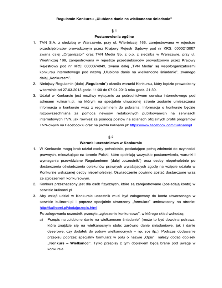Regulamin Konkursu „Ulubione danie na wielkanocne śniadanie” §1 Postanowienia ogólne 1. TVN S.A. z siedzibą w Warszawie, przy ul. Wiertniczej 166, zarejestrowana w rejestrze przedsiębiorców prowadzonym przez Krajowy Rejestr Sądowy pod nr KRS: 0000213007 zwana dalej „Organizator” oraz TVN Media Sp. z o.o. z siedzibą w Warszawie, przy ul. Wiertniczej 166, zarejestrowana w rejestrze przedsiębiorców prowadzonym przez Krajowy Rejestrowy pod nr KRS: 0000374849, zwana dalej „TVN Media” są współorganizatorami konkursu internetowego pod nazwą „Ulubione danie na wielkanocne śniadanie”, zwanego dalej „Konkursem”. 2. Niniejszy Regulamin (dalej „Regulamin”) określa warunki Konkursu, który będzie prowadzony w terminie od 27.03.2013 godz. 11:00 do 07.04.2013 roku godz. 21:30. 3. Udział w Konkursie jest możliwy wyłącznie za pośrednictwem serwisu internetowego pod adresem kulinarni.pl, na którym na specjalnie utworzonej stronie zostanie umieszczona informacja o konkursie wraz z regulaminem do pobrania. Informacja o konkursie będzie rozpowszechniana za pomocą newsów redakcyjnych publikowanych na serwisach internetowych TVN, jak również za pomocą postów na ścianach oficjalnych profili programów TVN-owych na Facebook’u oraz na profilu kulinarni.pl: https://www.facebook.com/Kulinarnipl §2 Warunki uczestnictwa w Konkursie 1. W Konkursie mogą brać udział osoby pełnoletnie, posiadające pełną zdolność do czynności prawnych, mieszkające na terenie Polski, które spełniają wszystkie postanowienia, warunki i wymagania przewidziane Regulaminem (dalej „uczestnik”) oraz osoby niepełnoletnie po dostarczeniu oświadczenia opiekunów prawnych wyrażających zgodę na wzięcie udziału w Konkursie wskazanej osoby niepełnoletniej. Oświadczenie powinno zostać dostarczone wraz ze zgłoszeniem konkursowym. 2. Konkurs przeznaczony jest dla osób fizycznych, które są zarejestrowane (posiadają konto) w serwisie kulinarni.pl 3. Aby wziąć udział w Konkursie uczestnik musi być zalogowany do konta utworzonego w serwisie kulinarni.pl i poprzez specjalnie utworzony „formularz” umieszczony na stronie: http://kulinarni.pl/dodajprzepis.html Po zalogowaniu uczestnik przesyła „zgłoszenie konkursowe”, w którego skład wchodzą: a) Przepis na „ulubione danie na wielkanocne śniadanie” (może to być dowolna potrawa, która znajdzie się na wielkanocnym stole: zarówno danie śniadaniowe, jak i danie deserowe, czy dodatek do potraw wielkanocnych – np. sos itp.). Podczas dodawanie przepisu poprzez specjalny formularz w polu o nazwie „Opis” należy dodać dopisek „Konkurs – Wielkanoc”. Tylko przepisy z tym dopiskiem będą brane pod uwagę w konkursie. b) Zdjęcie „ulubionego dania wielkanocnego”. Zdjęcie należy przesyłać w formacie: JPG, TIFF, GIF. Maksymalna waga zdjęcia: 5 MB. Zdjęcia muszą być oryginalnie wykonane przez uczestników Konkursu (muszą to być zdjęcia autorskie). c) dane uczestnika: imię, nazwisko, adres e-mail (dane z rejestracji podczas zakładania konta na kulinarni.pl) 4. Zgłoszenie konkursowe nie może zawierać jakichkolwiek przekazów promocyjnych lub reklamowych m.in. towarów, usług, znaków towarowych i/lub podmiotów. Nadesłane poprawnie (tzn. zgodnie z Regulaminem) zgłoszenia konkursowe będą oceniane przez Jury Konkursowe. Oceniane będą jedynie zgłoszenia, w których znajdzie się prawidłowa odpowiedź na pytanie konkursowe (wymienione w § 2, punkt 2 a) 5. Kryterium oceny zgłoszenia konkursowego przez Jury Konkursowego będzie wybór najbardziej inspirujących przepisów na „ulubione danie na wielkanocne śniadanie”. Wybranych i nagrodzonych zostanie łącznie 10 przepisów. Nagrody, przyznane autorom przepisów przez Jury Konkursowe zostały opisane w § 4, pkt 2. 6. W celu weryfikacji uczestnika i/lub wydania zwycięzcom nagrody konkursowej, uczestnik Konkursu jest zobowiązany do podania danych określonych w ust. 2 pkt (c) niniejszego paragrafu. 7. Przystępując do Konkursu poprzez wykonanie czynności, o których mowa w § 2 a i b Regulaminu, uczestnik Konkursu: a) wyraża zgodę na wykorzystywanie przez Organizatora swojego imienia, nazwiska i pseudonimu oraz opisu z przesłanego zgłoszenia konkursowego dla celów promocji i reklamy TVN oraz programów telewizyjnych i serwisów internetowych rozpowszechnianych przez TVN, b) oświadcza i gwarantuje, że inne osoby wymienione w pracy konkursowej wyrażają zgodę na wykorzystanie przez Organizatora swojego imienia i nazwiska, pseudonimu, wykorzystanego w zgłoszeniu konkursowym w zakresie wymienionych poniżej pól eksploatacji i ponosi z tego tytułu wyłączną odpowiedzialność, a ww. osoby udzieliły przedmiotowej zgody na piśmie. 8. Z chwilą przesłania przez Uczestnika zgłoszenia konkursowego Organizator otrzymuje zgodę na korzystanie ze zgłoszenia konkursowego Uczestnika i jest uprawniony do korzystania z tych praw w ramach Konkursu, jego eksploatacji i promocji bez jakichkolwiek ograniczeń (w tym bez ograniczeń czasowych), na wszystkich polach eksploatacji, a w szczególności: a) utrwalania i zwielokrotniania jakąkolwiek techniką (w jakimkolwiek systemie, formacie i na jakimkolwiek nośniku), w tym m.in. drukiem, na kliszy fotograficznej, na taśmie magnetycznej, cyfrowo, b) wprowadzania do obrotu, c) wprowadzania do pamięci komputera, do sieci komputerowej i/lub multimedialnej, do baz danych, d) publicznego udostępniania w taki sposób, aby każdy mógł mieć dostęp do utworów i przedmiotów praw pokrewnych w miejscu i w czasie przez siebie wybranym (m.in. udostępnianie w Internecie np. w ramach dowolnych stron internetowych oraz jakichkolwiek serwisów odpłatnych lub nieodpłatnych, w szczególności video on demand, pay-per-view, dostępnych m.in. w technice downloading, streaming, IPTV, ADSL, DSL oraz jakiejkolwiek innej), a także w ramach dowolnych usług telekomunikacyjnych z zastosow