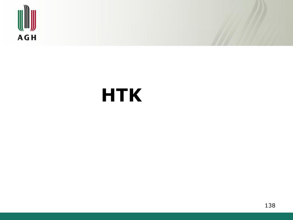 HTK 138 Czym jest HTK • Zbiór programów implementujących Niejawne Łańcuchy Markowa - Hidden Markov Models (HMMs) • ASR, synteza mowa, rozpoznawanie liter, badania nad sekwencjami DNA • Analiza mowy, wyćwiczenie HMM, testowanie i analiza rezultatów • HTK dopasowuje hipotezę każdego rozpoznania do jednego z elementów słownika przygotowanego przez użytkownika • Porównanie transkrypcji fonetycznych słów 139 Schemat HTK 140 Sekwencja symboli 141 Rozpoznanie pojedynczego słowa 142 Łańcuch Markowa 143 Ćwiczenie 144 Rozpoznawanie 145 Reprezentowanie mikstur 146 Reestymacja • Najpierw robi się zgrubne przybliżenie wartości parametrów HMM • Następnie dokładniejsze parametry można znaleźć stosując reestymację Baum-Welcha • Według kryterium maksymalnego podobieństwa (maximum likelihood) 147 Algorytm Viterbiego dla rozpoznawania izolowanych słów 148 Sieć rozpoznawania dla mowy ciągłej 149 Tokeny wykrywające granice słów 150 Używanie HTK • System można wykonać korzystając z tutoriala HTK Book, jednakże niektóre kroki będą inne, a niektóre można pominąć – Step 7 - 8 Fixing the Silence Models – Step 9 - 10 Making Triphones from Monophones • Różnice i niedopatrzenia – Przygotuj plik config1 i codetr.scp (config jak w tutorialu ale z SOURCEFORMAT = WAV) – Utwórz katalogi hmm0, hmm1, ... 151 Rzeczy o których należy pamiętać • Dokumentuj używane komendy i inne czynności • Dbaj o porządek w swoich plikach • Nagrywaj mowę w dobrej jakości (głośno, poprawnie wymowa, jak najmniej zakłóceń i szumu, bez przesterowania) • Nagrania muszą idealnie pasować do transkrypcji • Niczego nie kasuj • Aby otrzymać ocenę wyślij sprawozdanie, 152 nagrania, transkrypcję i cały system Modelowanie mowy Bartosz Ziółko 153 HMM 154 155 156 157 Probability density function 158 Maximum A Posteriori (MAP) Estimation Maximising the posterior pdf 159 Maximum-Likelihood (ML) Estimation Maximising the likelihood function 160 Common problems with using statistics 161 162 Klasyfikowanie i dekodowanie w ASR poza HMM • Klasyfikator k-NN • Artificial Neural Networks (ANN), Sztuczne sieci neuronowe • Support Vector Machine (SVM), Maszyna wektorów nośnych • Dynamic Bayesian Networks (DBN), Dynamiczne sieci Bayesa • Graphical Model Toolkit (GMTK) • Maximum Entropy Direct Model 163 • Conditional Random Fields (CRF) Modyfikacja AGH klasyfikatora k-NN 1 c1 0.8 c2 Wartość cechy 2 (x[2]) 0.6 0.4 0.2 0 -0.2 x -0.4 -0.6 -0.8 J. Gałka 0 0.2 0.4 0.6 0.8 1 1.2 Wartość cechy 1 (x[1]) 1.4 1.6 1.8 164 Artificial Neural Networks (ANN, NN) 165 Modelowanie czasu i kontekstu w ANN 166 Hosom, Cole, Fanty, CSLU at Oregon Institute of Science and Technology 167 168 169 „EVALUATION AND INTEGRATION OF NEURALNETWORK TRAINING TECHNIQUES FOR CONTINUOUS DIGIT RECOGNITION„ J.-P. Hosom, R. A. Cole, and P. Cosi Features: •13th-order MFCC with delta values (as in the baseline system, referred to as MFCC13D), •13th-order MFCC with no delta values (MFCC13), •9th-order MFCC with and without delta values (MFCC9D and MFCC9), •13th-order and 9th-order PLP with and without delta values (PLP13D, PLP13, PLP9D, PLP9), •a combination of 13th-order PLP and 13th-order MFCC (PM13), •a combination of 9th-order PLP and 9th-order MFCC (PM9). •All PLP features were computed using RASTA pre-processing, and all MFCC Grammars: features were computed using CMS •allowing optional silence between digits (SIL), pre-processing. •allowing an optional “garbage” word as well as 170 optional silence between digits (GAR). Metodologia empirycznego oceniania • Wyniki testów niczego nie dowodzą, mogą jedynie wskazywać itp. • Konieczne jest rozdzielenie danych treningowych i testowych, aczkolwiek można „crossować” • Prawo wielkich liczb, ale • Niektóre systemy statystyczne mogą się przećwiczyć • Oceniamy na raz wyłącznie jedną zmienną, reszta systemu musi być całkowicie stabilna • Należy podać jak najwięcej szczegółów dotyczących danych testowych, a w miarę możliwości używać ogólnodostępnych testów • Wyniki naukowe powinny być falsyfikowalne – 171 otwarcie na krytykę Support Vector Machine (SVM) 172 173 Ganapathiraju, Hamaker, Picone: „Applications of Support Vector Machines to Speech Recognition” • SVM nie może modelować wprost struktur czasowych • Stosuje się rozwiązania hybrydowe SVM/HMM • SVM zapewnia miarę i dyskryminant umożliwiający porównywanie klasyfikatorów • Brak jasnych relacji między dystansem klastrów i prawdopodobieństw a posteriori • Projektowanie klasyfikatora: jeden przeciwko wszystkim lub jeden na jeden • Model segmentowy ze stałą liczbą regionów 174 Ganapathiraju, Hamaker, Picone: „Applications of Support Vector Machines to Speech Recognition” 175 Ganapathiraju, Hamaker, Picone: „Applications of Support Vector Machines to Speech Recognition” 176 Nieliniowe klasyfikacje SVM • http://www.youtube.com/watch?v=3liCbR ZPrZA 177 Rezultaty stosowania SVM z różnymi ustawieniami w rozpoznawaniu mowy 178 Sieć Bayesowska Skierowany acykliczny graf reprezentujący zbiór zmiennych losowych i zależności warunkowych między nimi. 183 Sieć Bayesowska 184 185 Dynamiczne sieci Bayesowskie Wyrażenie s ozna cza wystąpienia stanów koncepcyjnych z dyskretnymi wartościami opisującymi fizyczny system o wartościach ciągłych ze stanami x i obserwacjami y 186 187 HMM a DBN • HMM jest podklasą DBN • DBN reprezentuje wprost właściwości rozkładu na czynniki • Rozkład na czynniki określony przez DBN narzuca warunki które model musi spełnić • DBNy przekazują informację strukturalną o ukrytym problemie 188 Edinburgh articulatory DBN model manner, place, voicing, rounding, front-back, static 189 Graphical Model Toolkit extension of DBN • Dopuszcza krawędzie ukierunkowane przeciwnie do upływu czasu • Płaszczyzny sieci mogą obej
