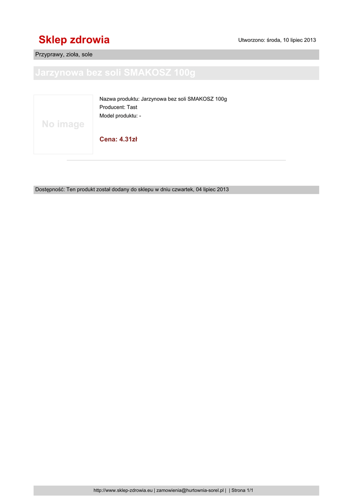 Sklep zdrowia Utworzono: środa, 10 lipiec 2013 Przyprawy, zioła, sole Jarzynowa bez soli SMAKOSZ 100g Nazwa produktu: Jarzynowa bez soli SMAKOSZ 100g Producent: Tast Model produktu: - No image Cena: 4.31zł Dostępność: Ten produkt został dodany do sklepu w dniu czwartek, 04 lipiec 2013 http://www.sklep-zdrowia.eu | [email protected] | | Strona 1/1