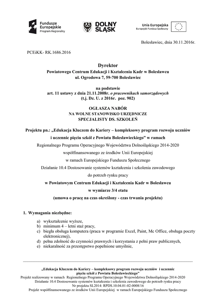 Bolesławiec, dnia 30.11.2016r. PCEiKK- RK.1686.2016 Dyrektor Powiatowego Centrum Edukacji i Kształcenia Kadr w Bolesławcu ul. Ogrodowa 7, 59-700 Bolesławiec na podstawie art. 11 ustawy z dnia 21.11.2008r. o pracownikach samorządowych (t.j. Dz. U. z 2016r. poz. 902) OGŁASZA NABÓR NA WOLNE STANOWISKO URZĘDNICZE SPECJALISTY DS. SZKOLEŃ Projektu pn.: „Edukacja Kluczem do Kariery – kompleksowy program rozwoju uczniów i uczennic pięciu szkół z Powiatu Bolesławieckiego” w ramach Regionalnego Programu Operacyjnego Województwa Dolnośląskiego 2014-2020 współfinansowanego ze środków Unii Europejskiej w ramach Europejskiego Funduszu Społecznego Działanie 10.4 Dostosowanie systemów kształcenia i szkolenia zawodowego do potrzeb rynku pracy w Powiatowym Centrum Edukacji i Kształcenia Kadr w Bolesławcu w wymiarze 3/4 etatu (umowa o pracę na czas określony - czas trwania projektu) 1. Wymagania niezbędne: a) wykształcenie wyższe, b) minimum 4 – letni staż pracy, c) biegła obsługa komputera (praca w programie Excel, Paint, Mc Office, obsługa poczty elektronicznej), d) pełna zdolność do czynności prawnych i korzystania z pełni praw publicznych, e) niekaralność za przestępstwo popełnione umyślnie, ______________________________________________________________________________ „Edukacja Kluczem do Kariery – kompleksowy program rozwoju uczniów i uczennic pięciu szkół z Powiatu Bolesławieckiego” Projekt realizowany w ramach Regionalnego Programu Operacyjnego Województwa Dolnośląskiego 2014-2020 Działanie 10.4 Dostosowanie systemów kształcenia i szkolenia zawodowego do potrzeb rynku pracy Nr projektu SL2014: RPDS.10.04.01-02-0008/16 Projekt współfinansowanego ze środków Unii Europejskiej w ramach Europejskiego Funduszu Społecznego 2. Wymagania dodatkowe: a) b) c) d) e) f) g) doświadczenie w pracy na podobnym stanowisku, w tym obsługa klienta, doświadczenie w archiwizacji dokumentów, umiejętność opisu faktur i rachunków, samodzielność, komunikatywność, dobra organizacja czasu pracy, biegła obsługa sprzętu biurowego: ksero, fax, skaner. 3. Wymagane dokumenty: list motywacyjny z opisem doświadczenia w zakresie wymagań, CV, kserokopie dokumentów potwierdzających wykształcenie i kwalifikacje zawodowe, kserokopie dokumentów potwierdzających staż pracy (świadectwa pracy), kserokopie zaświadczeń o ukończonych kursach, szkoleniach itp., ewentualne referencje lub listy polecające, oświadczenie kandydata o posiadaniu pełnej zdolności do czynności prawnych i korzystania z pełni praw publicznych, h) oświadczenie o niekaralności za przestępstwo popełnione umyślnie ścigane z oskarżenia publicznego lub umyślne przestępstwo skarbowe, a) b) c) d) e) f) g) Wymagane dokumenty powinny być opatrzone klauzulą: „Wyrażam zgodę na przetwarzanie moich danych osobowych zawartych w złożonych dokumentach aplikacyjnych na potrzeby niezbędne do realizacji procesu rekrutacji” (zgodnie z ustawą z dnia 29.08.1997r. o ochronie danych osobowych (t.j. Dz. U. z 2016 r. poz. 922). 4. Zakres wykonywanych zadań na stanowisku: a) telefoniczna i bezpośrednia obsługa klienta, b) prowadzenie korespondencji projektowej, c) przygotowanie, gromadzenie i archiwizacja dokumentów związanych z realizacją projektu, d) opis faktur, rachunków i not, zgodnie z instrukcją obiegu dokumentów, e) przygotowanie organizacyjne szkoleń, f) prowadzenie dokumentacji szkoleniowej, g) rekrutacja uczestników szkoleń, h) wykonywanie innych poleceń kierownika projektu. ______________________________________________________________________________ „Edukacja Kluczem do Kariery – kompleksowy program rozwoju uczniów i uczennic pięciu szkół z Powiatu Bolesławieckiego” Projekt realizowany w ramach Regionalnego Programu Operacyjnego Województwa Dolnośląskiego 2014-2020 Działanie 10.4 Dostosowanie systemów kształcenia i szkolenia zawodowego do potrzeb rynku pracy Nr projektu SL2014: RPDS.10.04.01-02-0008/16 Projekt współfinansowanego ze środków Unii Europejskiej w ramach Europejskiego Funduszu Społecznego 5. Informacje o warunkach pracy na stanowisku: Praca o charakterze biurowym będzie świadczona w siedzibie biura projektu w Powiatowym Centrum Edukacji i Kształcenia Kadr w Bolesławcu, w wymiarze 3/4 etatu, umowa na czas określony (czas realizacji projektu tj. od 01.01.2017r. do 31.08.2018r. ), praca przy komputerze powyżej 4 godzin dziennie. 6. Inne informacje: w miesiącu poprzedzającym datę upublicznienia ogłoszenia o naborze wskaźnik zatrudnienia osób niepełnosprawnych w PCEiKK, w rozumieniu przepisów o rehabilitacji zawodowej i społecznej oraz zatrudnianiu osób niepełnosprawnych, jest niższy niż 6% co oznacza, że zachodzi sytuacja, o której mowa w art. 13a ust. 2 ustawy z dnia 21 listopada 2008r. o pracownikach samorządowych (t.j. Dz. U. z 2016r. poz. 902). aplikacje w zamkniętej kopercie opatrzonej dopiskiem „Nabór na stanowisko specjalisty ds. szkoleń” należy złożyć do dnia 15 grudnia 2016r. do godz. 1500 w sekretariacie Powiatowego Centrum Edukacji i Kształcenia Kadr w Bolesławcu, przy ul. Ogrodowa 7. aplikacje, które wpłyną po tym terminie nie będą rozpatrywane, w toku naboru komisja wyłoni nie więcej niż 5 najlepszych kandydatów spełniających wymagania niezbędne i zaprosi do udziału w rozmowie kwalifikacyjnej, o której kandydaci zostaną powiadomieni telefonicznie. nabór może zostać odwołany w każdym czasie bez podania uzasadnienia. informacja o wyniku naboru zostanie umieszczona na stronie internetowej Powiatowego Centrum Edukacji i Kształcenia Kadr w Bolesławcu www.pceikk.pl ______________________________________________________________________________ „Edukacja Kluczem do Kariery – kompleksowy program rozwoju uczniów i uczennic pięciu szkół z Powiatu Bolesławieckiego” Projekt realizowany w ramach Regionalnego Programu Operacyjnego Województwa Dolnośl