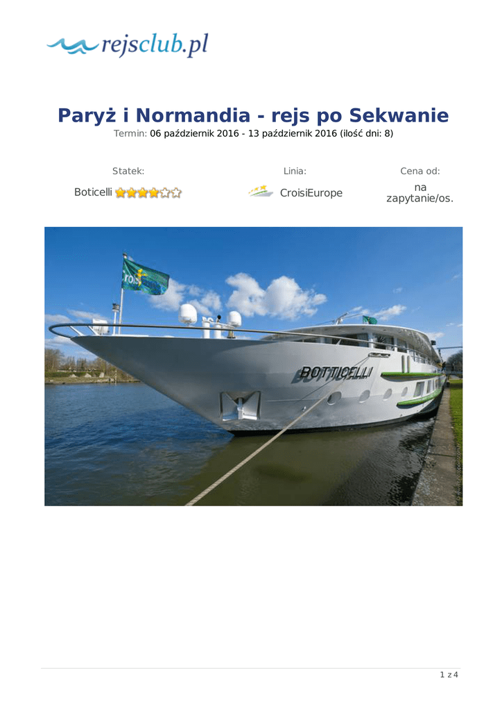 Paryż i Normandia - rejs po Sekwanie Termin: 06 październik 2016 - 13 październik 2016 (ilość dni: 8) Statek: Boticelli Linia: CroisiEurope Cena od: na zapytanie/os. 1 z4 TRASA REJSU dzień 1 Data Port czwartek 06.10.2016 Paryż Francja Wpłynięcie Wypłynięcie Legenda --:-- --:-- Zaokrętowanie pomiędzy godziną 18 a 19. P o koktajlu powitalnym i kolacji „nocne zwiedzanie” z pokładu statku. dzień 2 piątek 07.10.2016 Paryż Francja --:-- --:-- P o śniadaniu możliwość skorzystania z wycieczki fakultatywnej po stolicy Francji w trakcie której odwiedzimy jej najsłynniejsze miejsca: Wieżę Eiffla, katedrę Notre Dame, Łuk Triumfalny oraz P ola Elizejskie. P o lunchu czas wolny na popołudniowy spacer po P aryżu. P o kolacji natomiast możliwość wybrania się do paryskiego kabaretu. dzień 3 sobota 08.10.2016 Vernon Francja --:-- --:-- P o śniadaniu wypłyniemy w kierunku Vernon, gdzie powinniśmy dotrzeć około godziny 12:30. P o lunchu możliwość skorzystania z wycieczki do Fundacji C laude Moneta w Giverny. W trakcie wycieczki odwiedzimy dom słynnego malarza wraz z ogromną pracownią, pokojem dziennym, jadalnią oraz słynnym ogrodem. P o powrocie na statek wypłynięcie w kierunku C audebec-en-C aux. dzień 4 niedziela 09.10.2016 Dunclair Francja --:-- --:-- dzień 5 poniedziałek 10.10.2016 Honfleur Francja --:-- --:-- P o śniadaniu możliwość skorzystania z wycieczki do "C ote Fleurie”, Trouville i Deauville w trakcie której wizyta w destylarni, gdzie produkują słynnego C alvadosa. P owrót na statek na lunch. P o południu możliwość skorzystania z wycieczki z przewodnikiem do Honfleur. To leżące u podnóża C ôte de Grace miasto oczaruje nas portem rybackim, malowniczymi uliczkami ze starymi domami oraz kościołem św. Katarzyny, który w całości zbudowany jest z drewna. Ewentualnie możliwość skorzystania z całodniowej wycieczki z lunchem na plażę, gdzie odbyło się „Lądowanie w Normandii” (rezerwacja przed rejsem, minimum 30 uczestników). P rzejazd autokarem przez P ointe du Hoc, plażę Omaha i C oleville sur Mer. P o lunchu zatrzymamy się w Arromanches, gdzie obejrzymy film „C ena wolności”. P owrót na statek na kolację i wolny wieczór. dzień 6 wtorek 11.10.2016 Rouen Francja --:-- --:-- Rano będziemy płynąć wzdłuż pięknej doliny, która była natchnieniem dla wielu poetów i malarzy impresjonizmu. P o przepłynięciu pod pięknym Mostem Normandzkim około 14:00 dotrzemy do Rouen. Możliwość skorzystania z wycieczki z przewodnikiem po starym mieście w Rouen – historycznej stolicy Normandii. Zwiedzimy historyczne dzielnice m.in. „P lace du Vieux Marche”, gdzie Joanna d'Arc spłonęła na stosie. P owrót na statek na kolację po której przewidziany jest wieczór rozrywki. dzień 7 środa 12.10.2016 Les Andelys Francja --:-- --:-- 2 z4 P o śniadaniu wypłyniemy w kierunku Les Andelys po drodze miniemy śluzę w Amfreville i około południa dotrzemy na miejsce. P o południu możliwość skorzystania z wycieczki fakultatywnej do zamku Martainville. Była to letnia rezydencja bogatego bankiera z XV wieku. Obecnie jest to Muzeum Tradycji i Sztuki Normandzkiej. P owrót na statek i uroczysta kolacja galowa. dzień 8 czwartek 13.10.2016 Paryż Francja --:-- --:-- Wyokrętowanie od godziny 8:00. 3 z4 CENNIK Cena katalogowa Cena promocyjna Uwaga! Ceny za osobę w kabinie dwuosobowej. Cena zawiera: 8-dniowy (7 noclegów) rejs po Sekwanie; zakwaterowanie w kabinie dwuosobowej z klimatyzacją, prysznicem oraz WC; pełne wyżywienie od kolacji dnia pierwszego do śniadania dnia ostatniego; napoje w tym wodę, wino, piwo, soki owocowe i kawę serwowane podczas posiłków na pokładzie, napoje serwowane w barze (za wyjątkiem szampana oraz win z karty); opiekę hostessy na pokładzie; koktajl powitalny oraz uroczysty wieczór galowy; opłaty portowe. Cena nie zawiera: kosztów dojazdu do portu; ubezpieczenia KL, NNW i bagaż; win z karty, szampana oraz napojów podczas wycieczek fakultatywnych i transferów; wydatków osobistych. 4 z4