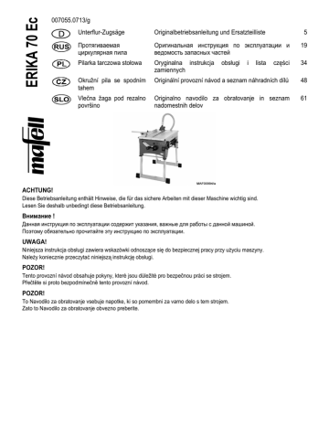 ERIKA 70 Ec 007055.0713/g Unterflur-Zugsäge Originalbetriebsanleitung und Ersatzteilliste Протягиваемая циркулярная пила Оригинальная инструкция по эксплуатации и ведомость запасных частей 19 Pilarka tarczowa stołowa Oryginalna instrukcja zamiennych części 34 Okružní pila se spodním tahem Originální provozní návod a seznam náhradních dílů 48 Vlečna žaga pod rezalno površino Originalno navodilo za obratovanje in seznam nadomestnih delov 61 obsługi i lista ACHTUNG! Diese Betriebsanleitung enthält Hinweise, die für das sichere Arbeiten mit dieser Maschine wichtig sind. Lesen Sie deshalb unbedingt diese Betriebsanleitung. Внимание ! Данная инструкция по эксплуатации содержит указания, важные для работы с данной машиной. Поэтому обязательно прочитайте эту инструкцию по эксплуатации. UWAGA! Niniejsza instrukcja obsługi zawiera wskazówki odnoszące się do bezpiecznej pracy przy użyciu maszyny. Należy koniecznie przeczytać niniejszą instrukcję obsługi. POZOR! Tento provozní návod obsahuje pokyny, které jsou důležité pro bezpečnou práci se strojem. Přečtěte si proto bezpodmínečně tento provozní návod. POZOR! To Navodilo za obratovanje vsebuje napotke, ki so pomembni za varno delo s tem strojem. Zato to Navodilo za obratovanje obvezno preberite. 5 Deutsch Inhaltsverzeichnis 1 2 2.1 2.2 2.3 2.4 2.5 2.6 2.7 2.8 3 4 4.1 4.2 4.3 4.4 4.5 4.6 4.7 4.8 5 5.1 5.2 5.3 5.4 5.5 5.6 5.7 5.8 5.9 5.10 6 6.1 6.2 6.3 7 8 Zeichenerklärung.............................................................................................................. 6 Erzeugnisangaben ........................................................................................................... 6 Angaben zum Hersteller................................................................................................... 6 Kennzeichnung der Maschine .......................................................................................... 6 Technische Daten ............................................................................................................ 7 Angaben zur Geräuschemission ...................................................................................... 7 Lieferumfang .................................................................................................................... 7 Sicherheitseinrichtungen .................................................................................................. 8 Bestimmungsgemäße Verwendung ................................................................................. 8 Restrisiken........................................................................................................................ 8 Sicherheitshinweise.......................................................................................................... 8 Rüsten / Einstellen ......................................................................................................... 10 Aufstellung / Transport ................................................................................................... 10 Netzanschluss ................................................................................................................ 11 Späneabsaugung ........................................................................................................... 11 Sägeblattauswahl ........................................................................................................... 11 Sägeblattwechsel ........................................................................................................... 12 Spaltkeil.......................................................................................................................... 12 Einsatz als Unterflur-Zugsäge ........................................................................................ 13 Einsatz als Tischkreissäge ............................................................................................. 13 Betrieb ............................................................................................................................ 13 Inbetriebnahme .............................................................................................................. 13 Ein- und Ausschalten ..................................................................................................... 13 Drehzahlauswahl............................................................................................................ 13 Überlastschutz................................................................................................................ 13 Schnitttiefeneinstellung .................................................................................................. 14 Einstellung für Schrägschnitte........................................................................................ 14 Multifunktionsanschlag (Lieferumfang Erika 85 Ec) ....................................................... 14 Universalanschlag (Lieferumfang Erika 70 Ec) .............................................................. 14 Einsatz als Parallelanschlag........................................................................................... 14 Einsatz als Quer- und Gehrungsanschlag...................................................................... 15 Wartung und Instandhaltung .......................................................................................... 16 Prüfung der Sicherheitseinrichtungen ............................................................................ 16 Maschinenpflege ............................................................................................................ 16 Lagerung .........................................