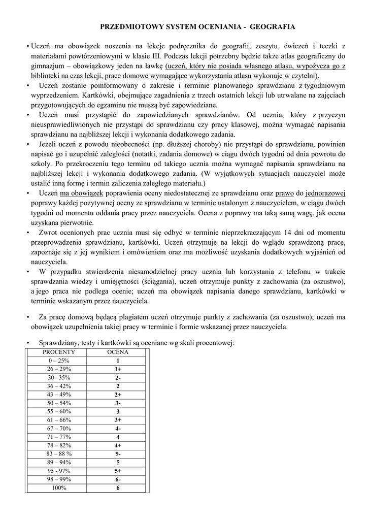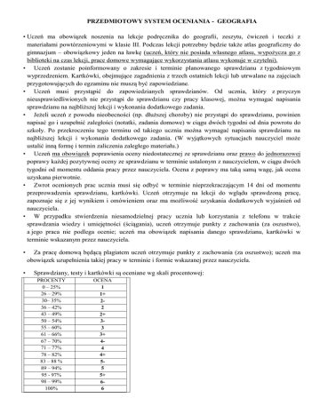 PRZEDMIOTOWY SYSTEM OCENIANIA - GEOGRAFIA • Uczeń ma obowiązek noszenia na lekcje podręcznika do geografii, zeszytu, ćwiczeń i teczki z materiałami powtórzeniowymi w klasie III. Podczas lekcji potrzebny będzie także atlas geograficzny do gimnazjum – obowiązkowy jeden na ławkę (uczeń, który nie posiada własnego atlasu, wypożycza go z biblioteki na czas lekcji, prace domowe wymagające wykorzystania atlasu wykonuje w czytelni). • Uczeń zostanie poinformowany o zakresie i terminie planowanego sprawdzianu z tygodniowym wyprzedzeniem. Kartkówki, obejmujące zagadnienia z trzech ostatnich lekcji lub utrwalane na zajęciach przygotowujących do egzaminu nie muszą być zapowiedziane. • Uczeń musi przystąpić do zapowiedzianych sprawdzianów. Od ucznia, który z przyczyn nieusprawiedliwionych nie przystąpi do sprawdzianu czy pracy klasowej, można wymagać napisania sprawdzianu na najbliższej lekcji i wykonania dodatkowego zadania. • Jeżeli uczeń z powodu nieobecności (np. dłuższej choroby) nie przystąpi do sprawdzianu, powinien napisać go i uzupełnić zaległości (notatki, zadania domowe) w ciągu dwóch tygodni od dnia powrotu do szkoły. Po przekroczeniu tego terminu od takiego ucznia można wymagać napisania sprawdzianu na najbliższej lekcji i wykonania dodatkowego zadania. (W wyjątkowych sytuacjach nauczyciel może ustalić inną formę i termin zaliczenia zaległego materiału.) • Uczeń ma obowiązek poprawienia oceny niedostatecznej ze sprawdzianu oraz prawo do jednorazowej poprawy każdej pozytywnej oceny ze sprawdzianu w terminie ustalonym z nauczycielem, w ciągu dwóch tygodni od momentu oddania pracy przez nauczyciela. Ocena z poprawy ma taką samą wagę, jak ocena uzyskana pierwotnie. • Zwrot ocenionych prac ucznia musi się odbyć w terminie nieprzekraczającym 14 dni od momentu przeprowadzenia sprawdzianu, kartkówki. Uczeń otrzymuje na lekcji do wglądu sprawdzoną pracę, zapoznaje się z jej wynikiem i omówieniem oraz ma możliwość uzyskania dodatkowych wyjaśnień od nauczyciela. • W przypadku stwierdzenia niesamodzielnej pracy ucznia lub korzystania z telefonu w trakcie sprawdzania wiedzy i umiejętności (ściągania), uczeń otrzymuje punkty z zachowania (za oszustwo), a jego praca nie podlega ocenie; uczeń ma obowiązek napisania danego sprawdzianu, kartkówki w terminie wskazanym przez nauczyciela. • • Za pracę domową będącą plagiatem uczeń otrzymuje punkty z zachowania (za oszustwo); uczeń ma obowiązek uzupełnienia takiej pracy w terminie i formie wskazanej przez nauczyciela. Sprawdziany, testy i kartkówki są oceniane wg skali procentowej: PROCENTY 0 – 25% 26 – 29% 30– 35% 36 – 42% 43 – 49% 50 – 54% 55 – 60% 61 – 66% 67 – 70% 71 – 77% 78 – 82% 83 – 88 % 89 – 94% 95 - 97% 98 – 99% 100% OCENA 1 1+ 22 2+ 33 3+ 44 4+ 55 5+ 66 • • Ocenom przypisano następujące wartości: forma oceniania sprawdzian kartkówki, odpowiedzi ustne prace domowe, praca na lekcji i aktywność, praca w grupach, przygotowanie i przedstawienie referatu lub prezentacji na wyznaczony temat, zeszyt inne formy waga 3 2 1 waga ustalona na bieżąco z uczniami Oceny śródroczne i roczne wystawia się wg następującej skali: średnia ważona ocen cząstkowych ocena 1,54 i poniżej 1 od 1,55 do 2,54 2 od 2,55 do 3,54 3 od 3,55 do 4,54 4 od 4,55 do 5,30 5 od 5,31 6 • Nauczyciel, biorąc pod uwagę całokształt pracy, możliwości i zaangażowanie ucznia, może wystawić ocenę inną niż wynika ze średniej ważonej. • Nauczyciel zobowiązuje się respektować wskazania poradni psychologiczno - pedagogicznej i dostosować wymagania do zaleceń. • Za aktywny udział w zajęciach uczeń może uzyskać tzw. plusy (5 plusów = cel), za brak pracy na lekcji – uczeń może uzyskać minusy (3 minusy = ndst). • Trzy razy w semestrze (przy 2 godz./tydz.) i dwa razy w semestrze (przy 1godz./tydz.)uczeń ma prawo zgłosić nieprzygotowanie do lekcji bez podania przyczyny. Nie dotyczy to sprawdzianów oraz zapowiedzianych wcześniej kartkówek. Nie można zgłosić braku pracy domowej, jeśli była ona zadana z więcej niż tygodniowym wyprzedzeniem. Kolejne braki są równoznaczne z otrzymaniem oceny niedostatecznej. • Nieobecność na lekcji nie zwalnia ucznia z przygotowania do zajęć - jeżeli uczeń był nieobecny na ostatniej (jednej) lekcji, ma obowiązek uzupełnienia notatek i wykonania pracy domowej. Niewywiązanie się z tego obowiązku jest równoznaczne z nieprzygotowaniem do lekcji. • Sposób udostępniania sprawdzonych i ocenionych pisemnych prac uczniowi i jego rodzicom określa WSO. • Na koniec semestru i roku szkolnego nie przewiduje się sprawdzianu zaliczeniowego. Ocena jest wystawiana za pracę w całym semestrze lub roku szkolnym. • Wymagania edukacyjne niezbędne do uzyskania poszczególnych ocen śródrocznych i końcoworocznych wynikają z realizowanego programu nauczania. Mogą ulec drobnym modyfikacjom wynikającym z indywidualnych planów pracy. Uczeń zostaje poinformowany na początku roku o wymaganiach edukacyjnych. Anna Ciesielska Beata Cieślewicz