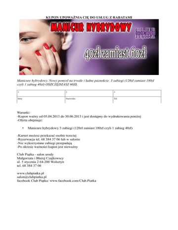 KUPON UPOWAŻNIA CIĘ DO USŁUG Z RABATAMI Manicure hybrydowy. Nowy pomysł na trwałe i ładne paznokcie. 3 zabiegi (120zł zamiast 180zł czyli 1 zabieg 40zł) OSZCZĘDZASZ 60ZŁ 1 2 3 Imię Nazwisko Tel. Warunki: -Kupon ważny od 05.04.2013 do 30.06.2013 i jest dostępny do wydrukowania poniżej -Oferta obejmuje: • Manicure hybrydowy 3 zabiegi (120zł zamiast 180zł czyli 1 zabieg 40zł) -Karnet możesz przekazać osobie trzeciej -Rezerwacja tel. 68 384 37 06 lub w salonie -Nie wykorzystane zabiegi przepadają -Po okresie ważności kupon jest nieważny Club Piątka - salon urody Małgorzata i Błażej Czajkowscy ul. 5 stycznia 2 64-200 Wolsztyn tel. 68 384 37 06 www.clubpiatka.pl [email protected] facebook Club Piątka: www.facebook.com/Club.Piatka