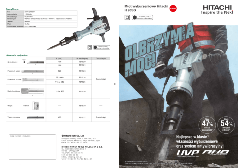 Młot wyburzeniowy Hitachi Specyfikacja H 90SG Moc 230V: 2 000W Liczba udarów 1 000/min Wartość drgań trójosiowych Dłutowanie: Wartość emisji wibracji ah, Cheq = 7,7m/s2 / niepewność K =1,5m/s2 Długość 860mm Waga 32,0kg 28.5mm(1-1/8”) Uchwyt sześciokąt Standardowe akcesoria Klucz sześciokąt 28.5mm(1-1/8”) Uchwyt sześciokąt Akcesoria opcjonalne L (mm) 28,5mm Grot zbieżny L Przecinak wąski Nr katalogowy 400 751520 520 751521 520 751523 76 x 400 751524 115 x 440 751525 125 x 500 751526 Typ uchwytu L Przecinak szeroki L Dłuto łopatkowe NOWOŚĆ Sześciokąt a i m y z r b l o oc! m L Ubijak 751530 178mm Trzon mocujący 400 L 751527 Sześciokąt Aż do 47% wyższa skuteczność*1 Shinagawa Intercity Tower A, 20th Floor, 15-1, Konan 2-chome, Minato-ku, Tokyo 108-6020, Japan www.hitachi-koki.com HITACHI POWER TOOLS POLSKA SP. Z O.O. UL. GIERDZIEJEWSKIEGO 1 02-495 WARSZAWA TELEFON: 22 863 33 78 FAX: 22 863 33 82 E-MAIL: [email protected] 54% mniejsze wibracje*1 Najlepsze w klasie własności wyburzeniowe oraz system antywibracyjny! *2 NASZ PARTNER HANDLOWY: Około www.hitachi-narzedzia.pl *1. W porównaniu do modelu H90SE. *2. Stan na czerwiec 2014 dla młotów klasy 30kg wśród wiodących producentów. Badanie Hitachi Koki. Parametry Najlepsze w klasie wyburzeniowe 70 J 27% 512 kg 47% *1 Energia udaru Parametry wyburzeniowe Aż do wyższa energia udaru*2 3 H 90SE wyższe parametry wyburzeniowe*2 Skruszony urobek (kg/30 min.)*3 Energia udaru H 90SG Aż do 70J 512kg H 90SG 55J 349kg H 90SE Około 54% System ochrony antywibracyjnej Zoptymalizowany mechanizm udaru, konstrukcja redukująca wibracje oraz antywibracyjne rękojeści. 1 Zoptymalizowany mechanizm udaru Bijak Poduszka powietrzna 3 Tłok mniejsze wibracje*2 Wartość drgań trójosiowych 7,7m/s 2 Antywibracyjne rękojeści 1 Amortyzator rękojeści Zabezpiecza wystarczającą ilość powietrza dla poduszki powietrznej i poprawia działanie udaru, zmniejszając siłę reakcji tłoka generowaną podczas pracy udaru. Również wibracje wytwarzane przez tłok są znacząco ograniczone. 2 Konstrukcja redukująca wibracje Obudowa Amortyzatory przednie (A) i (B) zamontowane na osłonie redukują wibracje pochodzące z pracy. 2 a i m y z r b l o oc! m H 90SG Uchwyt (B) Amortyzator przedni (A) Wałek rękojeści Uchwyt (A) Redukuje drgania z urządzenia za pomocą czterech amortyzatorów rękojeści, które kompresują drgające ruchy uchwytu (A). Amortyzator przedni (B) Wysoka wytrzymałość Poprawiona obsługa Uchwyty soft grip dla bardziej Duże dźwignie dla większej komfortowej pracy kontroli i wygody Bardzo wytrzymały odlew aluminiowy korpusu, konstrukcja podwójnej izolacji wewnętrznej oraz uchwyt stojanu wykonany z tworzywa sztucznego. Sprawia, że obudowa jest bardziej sztywna, znacznie zwiększając trwałość jednostki napędowej. Dwuwarstwowe uchwyty z twardego i miękkiego tworzywa oferują więcej wygody i komfortu obsługi w pracy. Zmniejsza zmęczenie operatora nawet przy długich okresach pracy. *1. Od lipca 2014 roku wśród klasy 30 kg młotów wyburzeniowych wykonanych przez wiodących producentów elektronarzędzi (badanych przez Hitachi Koki). *2. W porównaniu do modelu H90SE. *3. Wyburzonego urobku przez 30 minut (dane tylko jako odniesienie). Mogą się one różnić w zależności od wyburzonych materiałów i innych warunków. *4. Wartość drgań trójosiowych mierzono zgodnie EN60745-2-6. *4 Parametry Najlepsze w klasie wyburzeniowe 70 J 27% 512 kg 47% *1 Energia udaru Parametry wyburzeniowe Aż do wyższa energia udaru*2 3 H 90SE wyższe parametry wyburzeniowe*2 Skruszony urobek (kg/30 min.)*3 Energia udaru H 90SG Aż do 70J 512kg H 90SG 55J 349kg H 90SE Około 54% System ochrony antywibracyjnej Zoptymalizowany mechanizm udaru, konstrukcja redukująca wibracje oraz antywibracyjne rękojeści. 1 Zoptymalizowany mechanizm udaru Bijak Poduszka powietrzna 3 Tłok mniejsze wibracje*2 Wartość drgań trójosiowych 7,7m/s 2 Antywibracyjne rękojeści 1 Amortyzator rękojeści Zabezpiecza wystarczającą ilość powietrza dla poduszki powietrznej i poprawia działanie udaru, zmniejszając siłę reakcji tłoka generowaną podczas pracy udaru. Również wibracje wytwarzane przez tłok są znacząco ograniczone. 2 Konstrukcja redukująca wibracje Obudowa Amortyzatory przednie (A) i (B) zamontowane na osłonie redukują wibracje pochodzące z pracy. 2 a i m y z r b l o oc! m H 90SG Uchwyt (B) Amortyzator przedni (A) Wałek rękojeści Uchwyt (A) Redukuje drgania z urządzenia za pomocą czterech amortyzatorów rękojeści, które kompresują drgające ruchy uchwytu (A). Amortyzator przedni (B) Wysoka wytrzymałość Poprawiona obsługa Uchwyty soft grip dla bardziej Duże dźwignie dla większej komfortowej pracy kontroli i wygody Bardzo wytrzymały odlew aluminiowy korpusu, konstrukcja podwójnej izolacji wewnętrznej oraz uchwyt stojanu wykonany z tworzywa sztucznego. Sprawia, że obudowa jest bardziej sztywna, znacznie zwiększając trwałość jednostki napędowej. Dwuwarstwowe uchwyty z twardego i miękkiego tworzywa oferują więcej wygody i komfortu obsługi w pracy. Zmniejsza zmęczenie operatora nawet przy długich okresach pracy. *1. Od lipca 2014 roku wśród klasy 30 kg młotów wyburzeniowych wykonanych przez wiodących producentów elektronarzędzi (badanych przez Hitachi Koki). *2. W porównaniu do modelu H90SE. *3. Wyburzonego urobku przez 30 minut (dane tylko jako odniesienie). Mogą się one różnić w zależności od wyburzonych materiałów i innych warunków. *4. Wartość drgań trójosiowych mierzono zgodnie EN60745-2-6. *4 Młot wyburzeniowy Hitachi Specyfikacja H 90SG Moc 230V: 2 000W Liczba udarów 1 000/min Wartość drgań trójosiowych Dłutowanie: Wartość emisji wibracji ah, Cheq = 7,7m/s2 / niepewność K =1,5m/s2 Długość 860mm Waga 32,0kg 28.5mm(1-1/8”) Uchwyt sześciokąt Standardowe akcesoria Klucz sześciokąt 28.5mm(1-1/8”) Uchwyt sześciokąt Akcesori