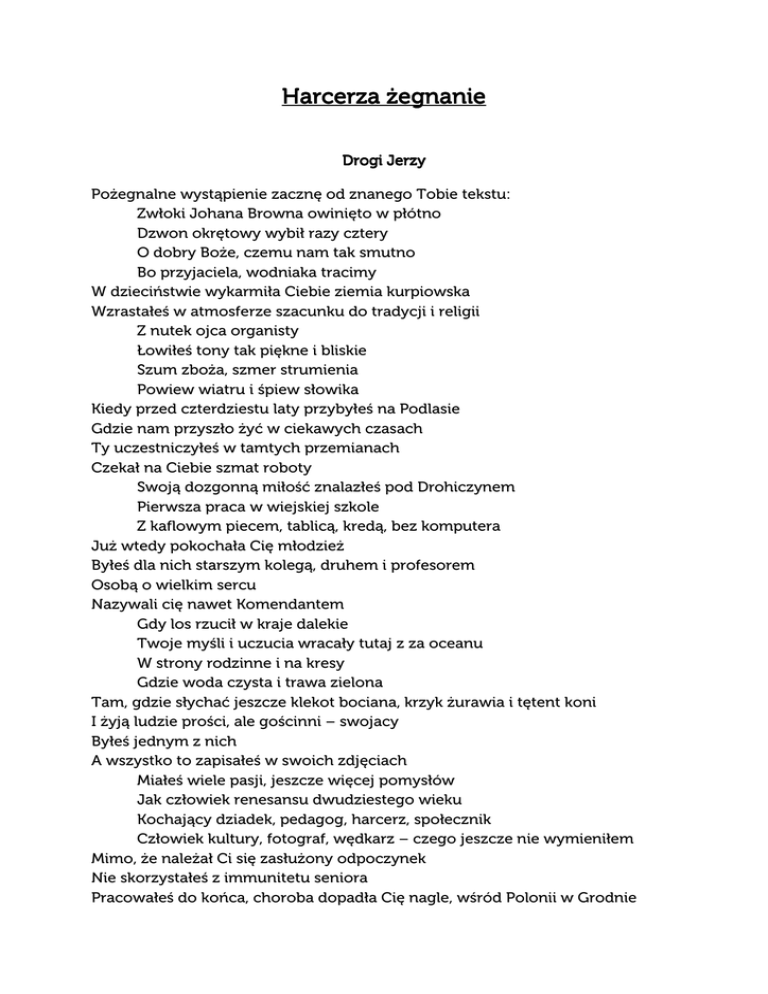 Harcerza żegnanie Drogi Jerzy Pożegnalne wystąpienie zacznę od znanego Tobie tekstu: Zwłoki Johana Browna owinięto w płótno Dzwon okrętowy wybił razy cztery O dobry Boże, czemu nam tak smutno Bo przyjaciela, wodniaka tracimy W dzieciństwie wykarmiła Ciebie ziemia kurpiowska Wzrastałeś w atmosferze szacunku do tradycji i religii Z nutek ojca organisty Łowiłeś tony tak piękne i bliskie Szum zboża, szmer strumienia Powiew wiatru i śpiew słowika Kiedy przed czterdziestu laty przybyłeś na Podlasie Gdzie nam przyszło żyć w ciekawych czasach Ty uczestniczyłeś w tamtych przemianach Czekał na Ciebie szmat roboty Swoją dozgonną miłość znalazłeś pod Drohiczynem Pierwsza praca w wiejskiej szkole Z kaflowym piecem, tablicą, kredą, bez komputera Już wtedy pokochała Cię młodzież Byłeś dla nich starszym kolegą, druhem i profesorem Osobą o wielkim sercu Nazywali cię nawet Komendantem Gdy los rzucił w kraje dalekie Twoje myśli i uczucia wracały tutaj z za oceanu W strony rodzinne i na kresy Gdzie woda czysta i trawa zielona Tam, gdzie słychać jeszcze klekot bociana, krzyk żurawia i tętent koni I żyją ludzie prości, ale gościnni – swojacy Byłeś jednym z nich A wszystko to zapisałeś w swoich zdjęciach Miałeś wiele pasji, jeszcze więcej pomysłów Jak człowiek renesansu dwudziestego wieku Kochający dziadek, pedagog, harcerz, społecznik Człowiek kultury, fotograf, wędkarz – czego jeszcze nie wymieniłem Mimo, że należał Ci się zasłużony odpoczynek Nie skorzystałeś z immunitetu seniora Pracowałeś do końca, choroba dopadła Cię nagle, wśród Polonii w Grodnie Gdy odszedłeś był czas na refleksje i nocne wspomnienia Śniłem, że szliśmy razem kresową, polną drogą Jak wtedy, w czasie żniw do Mateczki do Wilna Pobyt na śluzie w Niemnowie, odpust w Wasiliczkach „A czas jak rzeka, jak rzeka płynie” Powróciły i inne obrazy Pamiętam, jak wędrując szlakami Glogera Utrwaliłeś na kliszy nadniemeńskie kaplice i kwiaty polskie Fiołki, malwy, kaczeńce i maki Mam tą wystawę, Ciebie już nie ma Zdjęcia kwiatów pozostały Hołdowałeś dewizę – ważna jest rodzina, zdrowie i przyjaciele O zdrowie mało dbałeś, kiedy go zabrakło Pozostajesz jedynie w naszej pamięci W dniu, kiedy odszedłeś do Pana Ksiądz odprawiający mszę za Ciebie na Kresach w Wierobiach Powiedział – módlmy się za duszę swojaka Który przygrywał nam tu na organach I zawiesił żyrandol z łusek powstańczych W drodze na miejsce ostatniego spoczynku Przysiadłeś tutaj, na schodach kościoła, który wspólnie wznosiłeś Który stał się kościołem Twojej rodziny Nie martw się bracie, kiedyś się zejdziemy Gdy Pan nas wezwie do wspólnej załogi Szykuj aparat na to spotkanie Gdy przybędziemy razem w Nieba progi Święty Piotrze Uchyl nieco szerzej niebiańskiej furty Oto zmierza do Ciebie dobry, ciekawy człowiek Humanistyczna, artystyczna, dziwna dusza Tak, jak dziwny jest ten świat W zielonej kurcie, u boku saperka, skautowski kapelusz W zawadiackich gumowcach W ręku trzyma wędki i wiosło Na szyi ma aparat fotograficzny, pod pachą komputer Prosimy Cię Święty Piotrze Przyjmij Go do Królestwa Niebieskiego Niech mu ziemia lekka będzie Amen Łącząc się w bólu z bliskimi Prof. Wojciech Sobaniec hm.