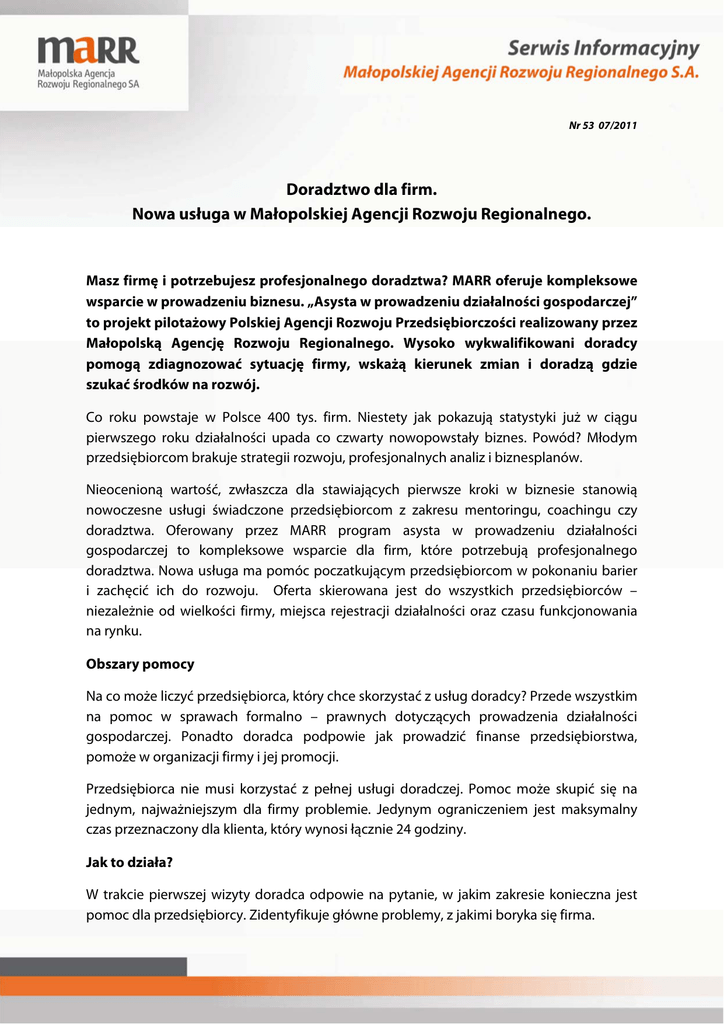 Nr 53 07/2011 Doradztwo dla firm. Nowa usługa w Małopolskiej Agencji Rozwoju Regionalnego. Masz firmę i potrzebujesz profesjonalnego doradztwa? MARR oferuje kompleksowe wsparcie w prowadzeniu biznesu. „Asysta w prowadzeniu działalności gospodarczej” to projekt pilotażowy Polskiej Agencji Rozwoju Przedsiębiorczości realizowany przez Małopolską Agencję Rozwoju Regionalnego. Wysoko wykwalifikowani doradcy pomogą zdiagnozować sytuację firmy, wskażą kierunek zmian i doradzą gdzie szukać środków na rozwój. Co roku powstaje w Polsce 400 tys. firm. Niestety jak pokazują statystyki już w ciągu pierwszego roku działalności upada co czwarty nowopowstały biznes. Powód? Młodym przedsiębiorcom brakuje strategii rozwoju, profesjonalnych analiz i biznesplanów. Nieocenioną wartość, zwłaszcza dla stawiających pierwsze kroki w biznesie stanowią nowoczesne usługi świadczone przedsiębiorcom z zakresu mentoringu, coachingu czy doradztwa. Oferowany przez MARR program asysta w prowadzeniu działalności gospodarczej to kompleksowe wsparcie dla firm, które potrzebują profesjonalnego doradztwa. Nowa usługa ma pomóc poczatkującym przedsiębiorcom w pokonaniu barier i zachęcić ich do rozwoju. Oferta skierowana jest do wszystkich przedsiębiorców – niezależnie od wielkości firmy, miejsca rejestracji działalności oraz czasu funkcjonowania na rynku. Obszary pomocy Na co może liczyć przedsiębiorca, który chce skorzystać z usług doradcy? Przede wszystkim na pomoc w sprawach formalno – prawnych dotyczących prowadzenia działalności gospodarczej. Ponadto doradca podpowie jak prowadzić finanse przedsiębiorstwa, pomoże w organizacji firmy i jej promocji. Przedsiębiorca nie musi korzystać z pełnej usługi doradczej. Pomoc może skupić się na jednym, najważniejszym dla firmy problemie. Jedynym ograniczeniem jest maksymalny czas przeznaczony dla klienta, który wynosi łącznie 24 godziny. Jak to działa? W trakcie pierwszej wizyty doradca odpowie na pytanie, w jakim zakresie konieczna jest pomoc dla przedsiębiorcy. Zidentyfikuje główne problemy, z jakimi boryka się firma. Przeanalizuje dokumenty oraz wskaże metody rozwiązania zdiagnozowanych problemów. Ta „weryfikacja” realizowana jest maksymalnie w ciągu 4 godzin. Etap pierwszy może również zakończyć się określeniem, iż usługa doradcza nie jest konieczna, a problemy przedsiębiorcy rozwiązane zostały w ciągu pierwszych 4 godzin. Ten etap pomocy jest bezpłatny dla przedsiębiorcy. Natomiast, jeśli zaistnieje konieczność przejścia do bardziej zaawansowanych działań, określony zostaje zakres doradztwa świadczonego w drugim etapie. Następuje też podpisanie umowy i rozpoczęcie świadczenia usługi właściwej. Na tym etapie usługa już nie jest bezpłatna. Firma korzystająca z pełnej usługi zapłaci 5 proc. kosztów pracy konsultanta (maksymalnie 120 zł). Pozostałą część, tj. 2 280,00 zł, sfinansuje Unia Europejska. Zatem rzeczywisty koszt jednej godziny pracy konsultanta dla przedsiębiorcy to jedynie 5 zł. Jak pozyskać doradcę? Aby skorzystać z doradztwa, należy na stronie internetowej Małopolskiej Agencji Rozwoju Regionalnego ( www.marr.pl) wypełnić formularz zgłoszeniowy. Po jego otrzymaniu konsultant skontaktuje się telefonicznie bądź mailowo i ustala termin pierwszego spotkania. Można też umówić się telefonicznie pod nr tel. 12 417 44 21. Z usług doradców MARR można skorzystać w Punktach Konsultacyjnych w Krakowie i Nowym Sączu. UWAGA! To oferta przeznaczona dla pierwszych 50 klientów, którzy skorzystają z usługi doradczej. Zgłoszenia przyjmujemy do 10 listopada 2011 r.
