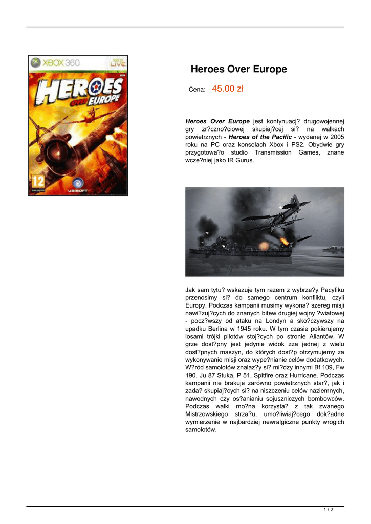 Heroes Over Europe Cena: 45.00 zł Heroes Over Europe jest kontynuacj? drugowojennej gry zr?czno?ciowej skupiaj?cej si? na walkach powietrznych - Heroes of the Pacific - wydanej w 2005 roku na PC oraz konsolach Xbox i PS2. Obydwie gry przygotowa?o studio Transmission Games, znane wcze?niej jako IR Gurus. Jak sam tytu? wskazuje tym razem z wybrze?y Pacyfiku przenosimy si? do samego centrum konfliktu, czyli Europy. Podczas kampanii musimy wykona? szereg misji nawi?zuj?cych do znanych bitew drugiej wojny ?wiatowej - pocz?wszy od ataku na Londyn a sko?czywszy na upadku Berlina w 1945 roku. W tym czasie pokierujemy losami trójki pilotów stoj?cych po stronie Aliantów. W grze dost?pny jest jedynie widok zza jednej z wielu dost?pnych maszyn, do których dost?p otrzymujemy za wykonywanie misji oraz wype?nianie celów dodatkowych. W?ród samolotów znalaz?y si? mi?dzy innymi Bf 109, Fw 190, Ju 87 Stuka, P 51, Spitfire oraz Hurricane. Podczas kampanii nie brakuje zarówno powietrznych star?, jak i zada? skupiaj?cych si? na niszczeniu celów naziemnych, nawodnych czy os?anianiu sojuszniczych bombowców. Podczas walki mo?na korzysta? z tak zwanego Mistrzowskiego strza?u, umo?liwiaj?cego dok?adne wymierzenie w najbardziej newralgiczne punkty wrogich samolotów. 1/2 Poza kampani? dla jednego gracza twórcy udost?pnili nam kilka zró?nicowanych i ciekawych trybów rozgrywki. Nie zabrak?o tak?e mo?liwo?ci sprawdzenia si? w walce z innymi graczami. Jednocze?nie w takiej potyczce mo?e wzi?? udzia? szesna?cie osób. Zobacz wideo: 2/2 Powered by TCPDF (www.tcpdf.org)