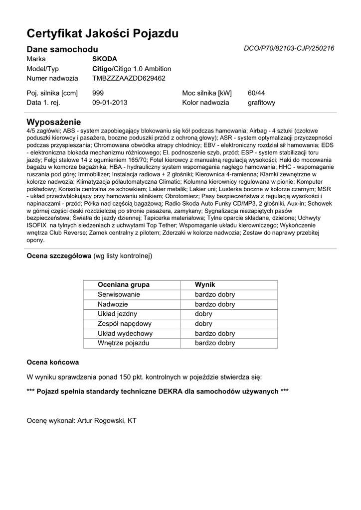 Certyfikat Jakości Pojazdu DCO/P70/82103-CJP/250216 Dane samochodu Marka Model/Typ Numer nadwozia SKODA Citigo/Citigo 1.0 Ambition TMBZZZAAZDD629462 Poj. silnika [ccm] Data 1. rej. 999 09-01-2013 Moc silnika [kW] Kolor nadwozia 60/44 grafitowy Wyposażenie 4/5 zagłówki; ABS - system zapobiegający blokowaniu się kół podczas hamowania; Airbag - 4 sztuki (czołowe poduszki kierowcy i pasażera, boczne poduszki przód z ochroną głowy); ASR - system optymalizacji przyczepności podczas przyspieszania; Chromowana obwódka atrapy chłodnicy; EBV - elektroniczny rozdział sił hamowania; EDS - elektroniczna blokada mechanizmu różnicowego; El. podnoszenie szyb, przód; ESP - system stabilizacji toru jazdy; Felgi stalowe 14 z ogumieniem 165/70; Fotel kierowcy z manualną regulacją wysokości; Haki do mocowania bagażu w komorze bagażnika; HBA - hydrauliczny system wspomagania nagłego hamowania; HHC - wspomaganie ruszania pod górę; Immobilizer; Instalacja radiowa + 2 głośniki; Kierownica 4-ramienna; Klamki zewnętrzne w kolorze nadwozia; Klimatyzacja półautomatyczna Climatic; Kolumna kierownicy regulowana w pionie; Komputer pokładowy; Konsola centralna ze schowkiem; Lakier metalik; Lakier uni; Lusterka boczne w kolorze czarnym; MSR - układ przeciwblokujący przy hamowaniu silnikiem; Obrotomierz; Pasy bezpieczeństwa z regulacją wysokości i napinaczami - przód; Półka nad częścią bagażową; Radio Skoda Auto Funky CD/MP3, 2 głośniki, Aux-in; Schowek w górnej części deski rozdzielczej po stronie pasażera, zamykany; Sygnalizacja niezapiętych pasów bezpieczeństwa; Światła do jazdy dziennej; Tapicerka materiałowa; Tylne oparcie składane, dzielone; Uchwyty ISOFIX na tylnych siedzeniach z uchwytami Top Tether; Wspomaganie układu kierowniczego; Wykończenie wnętrza Club Reverse; Zamek centralny z pilotem; Zderzaki w kolorze nadwozia; Zestaw do naprawy przebitej opony. Ocena szczegółowa (wg listy kontrolnej) Oceniana grupa Serwisowanie Nadwozie Układ jezdny Zespół napędowy Układ wydechowy Wnętrze pojazdu Wynik bardzo dobry bardzo dobry dobry dobry bardzo dobry bardzo dobry Ocena końcowa W wyniku sprawdzenia ponad 150 pkt. kontrolnych w pojeździe stwierdza się: *** Pojazd spełnia standardy techniczne DEKRA dla samochodów używanych *** Ocenę wykonał: Artur Rogowski, KT