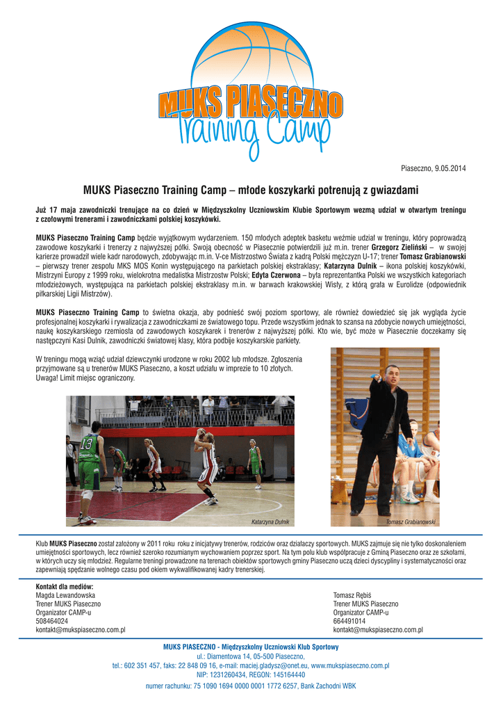 Piaseczno, 9.05.2014 MUKS Piaseczno Training Camp – młode koszykarki potrenują z gwiazdami Już 17 maja zawodniczki trenujące na co dzień w Międzyszkolny Uczniowskim Klubie Sportowym wezmą udział w otwartym treningu z czołowymi trenerami i zawodniczkami polskiej koszykówki. MUKS Piaseczno Training Camp będzie wyjątkowym wydarzeniem. 150 młodych adeptek basketu weźmie udział w treningu, który poprowadzą zawodowe koszykarki i trenerzy z najwyższej półki. Swoją obecność w Piasecznie potwierdzili już m.in. trener Grzegorz Zieliński – w swojej karierze prowadził wiele kadr narodowych, zdobywając m.in. V-ce Mistrzostwo Świata z kadrą Polski mężczyzn U-17; trener Tomasz Grabianowski – pierwszy trener zespołu MKS MOS Konin występującego na parkietach polskiej ekstraklasy; Katarzyna Dulnik – ikona polskiej koszykówki, Mistrzyni Europy z 1999 roku, wielokrotna medalistka Mistrzostw Polski; Edyta Czerwona – była reprezentantka Polski we wszystkich kategoriach młodzieżowych, występująca na parkietach polskiej ekstraklasy m.in. w barwach krakowskiej Wisły, z którą grała w Eurolidze (odpowiednik piłkarskiej Ligii Mistrzów). MUKS Piaseczno Training Camp to świetna okazja, aby podnieść swój poziom sportowy, ale również dowiedzieć się jak wygląda życie profesjonalnej koszykarki i rywalizacja z zawodniczkami ze światowego topu. Przede wszystkim jednak to szansa na zdobycie nowych umiejętności, naukę koszykarskiego rzemiosła od zawodowych koszykarek i trenerów z najwyższej półki. Kto wie, być może w Piasecznie doczekamy się następczyni Kasi Dulnik, zawodniczki światowej klasy, która podbije koszykarskie parkiety. W treningu mogą wziąć udział dziewczynki urodzone w roku 2002 lub młodsze. Zgłoszenia przyjmowane są u trenerów MUKS Piaseczno, a koszt udziału w imprezie to 10 złotych. Uwaga! Limit miejsc ograniczony. Katarzyna Dulnik Tomasz Grabianowski Klub MUKS Piaseczno został założony w 2011 roku roku z inicjatywy trenerów, rodziców oraz działaczy sportowych. MUKS zajmuje się nie tylko doskonaleniem umiejętności sportowych, lecz również szeroko rozumianym wychowaniem poprzez sport. Na tym polu klub współpracuje z Gminą Piaseczno oraz ze szkołami, w których uczy się młodzież. Regularne treningi prowadzone na terenach obiektów sportowych gminy Piaseczno uczą dzieci dyscypliny i systematyczności oraz zapewniają spędzanie wolnego czasu pod okiem wykwalifikowanej kadry trenerskiej. Kontakt dla mediów: Magda Lewandowska Trener MUKS Piaseczno Organizator CAMP-u 508464024 [email protected] Tomasz Rębiś Trener MUKS Piaseczno Organizator CAMP-u 664491014 [email protected] MUKS PIASECZNO - Międzyszkolny Uczniowski Klub Sportowy ul.: Diamentowa 14, 05-500 Piaseczno, tel.: 602 351 457, faks: 22 848 09 16, e-mail: [email protected], www.mukspiaseczno.com.pl NIP: 1231260434, REGON: 145164440 numer rachunku: 75 1090 1694 0000 0001 1772 6257, Bank Zachodni WBK
