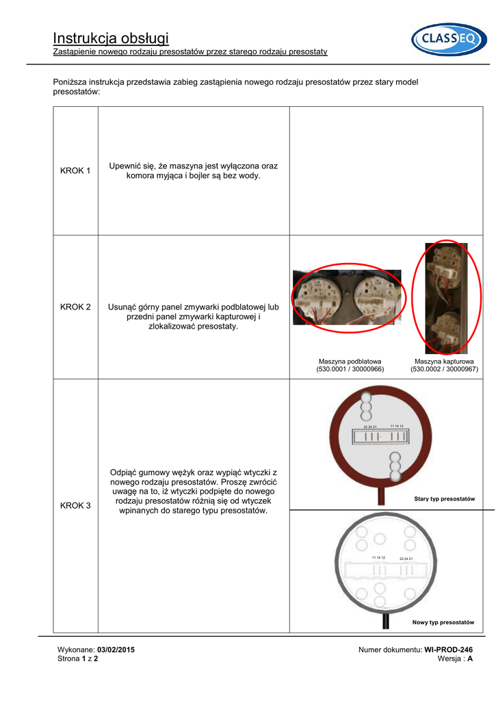 Instrukcja obsługi Zastąpienie nowego rodzaju presostatów przez starego rodzaju presostaty Poniższa instrukcja przedstawia zabieg zastąpienia nowego rodzaju presostatów przez stary model presostatów: KROK 1 KROK 2 Upewnić się, że maszyna jest wyłączona oraz komora myjąca i bojler są bez wody. Usunąć górny panel zmywarki podblatowej lub przedni panel zmywarki kapturowej i zlokalizować presostaty. Maszyna podblatowa (530.0001 / 30000966) 22 24 21 KROK 3 Maszyna kapturowa (530.0002 / 30000967) 11 14 12 Odpiąć gumowy wężyk oraz wypiąć wtyczki z nowego rodzaju presostatów. Proszę zwrócić uwagę na to, iż wtyczki podpięte do nowego rodzaju presostatów różnią się od wtyczek wpinanych do starego typu presostatów. Stary typ presostatów 11 14 12 22 24 21 Nowy typ presostatów Wykonane: 03/02/2015 Strona 1 z 2 Numer dokumentu: WI-PROD-246 Wersja : A Instrukcja obsługi Zastąpienie nowego rodzaju presostatów przez starego rodzaju presostaty KROK 4 Zastąpić nowy typ presostatów przez stary typ presostatów (czerwony). Stary typ presostatów KROK 5 Nowy typ presostatów Przypiąć wężyk do starego typu presostatu. Następnie podpiąć końcówkę przewodu do styków 22, 24 & 21 w starym presostacie – uwaga, gdyż te styki różnią się lokalizacją w starego/nowego rodzaju presostatach. Aby końcówka pasowała należy ściąć jej prowadzące wycięcia. Stary typ presostatów 22 24 21 Nowy typ presostatów 11 14 12 11 14 12 22 24 21 Wtyki Wykonane: 03/02/2015 Strona 2 z 2 Numer dokumentu: WI-PROD-246 Wersja : A
