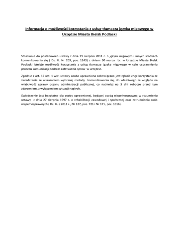 Informacja o możliwości korzystania z usług tłumacza języka migowego w Urzędzie Miasta Bielsk Podlaski Stosownie do postanowień ustawy z dnia 19 sierpnia 2011 r. o języku migowym i innych środkach komunikowania się ( Dz. U. Nr 209, poz. 1243) z dniem 30 marca br. w Urzędzie Miasta Bielsk Podlaski istnieje możliwość korzystania z usług tłumacza języka migowego w celu usprawnienia procesu komunikacji podczas załatwiania spraw w urzędzie. Zgodnie z art. 12 ust. 1 ww. ustawy osoba uprawniona zobowiązana jest zgłosić chęć korzystania ze świadczenia ze wskazaniem wybranej metody komunikowania się, do właściwego ze względu na właściwość sprawy organu administracji publicznej, co najmniej na 3 dni robocze przed tym zdarzeniem, z wyłączeniem sytuacji nagłych. Świadczenie jest bezpłatne dla osoby uprawnionej, będącej osobą niepełnosprawną w rozumieniu ustawy z dnia 27 sierpnia 1997 r. o rehabilitacji zawodowej i społecznej oraz zatrudnieniu osób niepełnosprawnych ( Dz. U. z 2011 r., Nr 127, poz. 721 i Nr 171, poz. 1016).