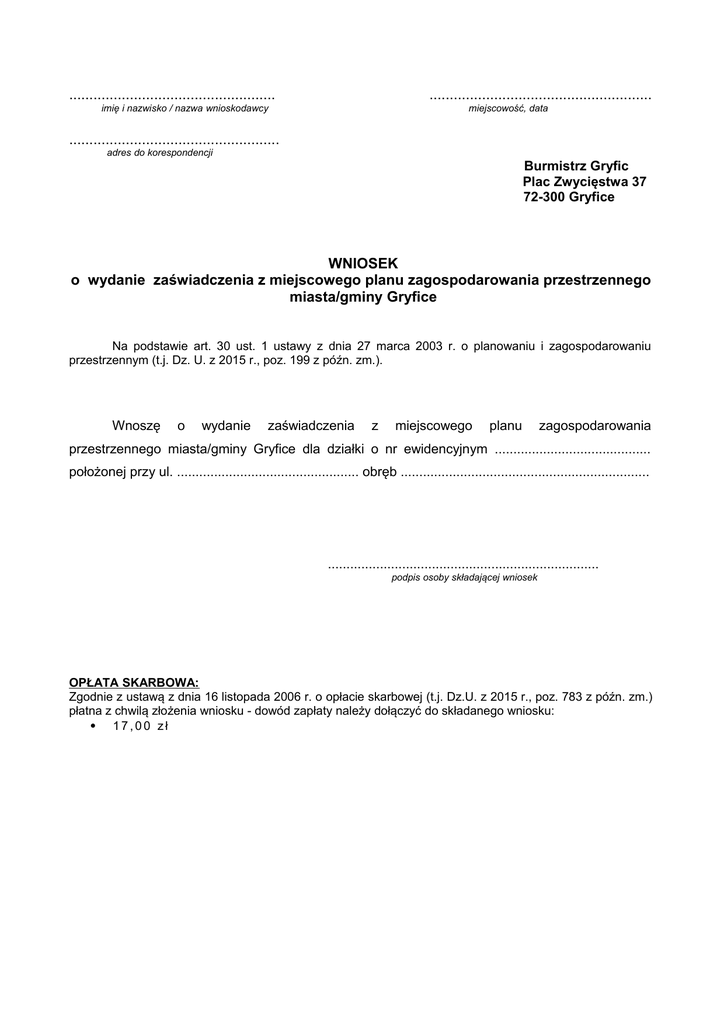 ................................................... ....................................................... imię i nazwisko / nazwa wnioskodawcy miejscowość, data .................................................... adres do korespondencji Burmistrz Gryfic Plac Zwycięstwa 37 72-300 Gryfice WNIOSEK o wydanie zaświadczenia z miejscowego planu zagospodarowania przestrzennego miasta/gminy Gryfice Na podstawie art. 30 ust. 1 ustawy z dnia 27 marca 2003 r. o planowaniu i zagospodarowaniu przestrzennym (t.j. Dz. U. z 2015 r., poz. 199 z późn. zm.). Wnoszę o wydanie zaświadczenia z miejscowego planu zagospodarowania przestrzennego miasta/gminy Gryfice dla działki o nr ewidencyjnym .......................................... położonej przy ul. ................................................. obręb ................................................................... ......................................................................... podpis osoby składającej wniosek OPŁATA SKARBOWA: Zgodnie z ustawą z dnia 16 listopada 2006 r. o opłacie skarbowej (t.j. Dz.U. z 2015 r., poz. 783 z późn. zm.) płatna z chwilą złożenia wniosku - dowód zapłaty należy dołączyć do składanego wniosku: 17,00 zł