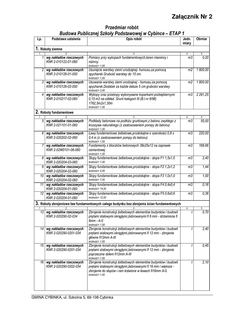 Załącznik Nr 2 Przedmiar robót Budowa Publicznej Szkoły Podstawowej w Cybince – ETAP 1 Lp. Podstawa ustalenia Opis robót Jedn. miary Obmiar 3 4 5 1. Roboty ziemne 1 2 1 wg nakładów rzeczowych KNR 2-010122-01-060 Pomiary przy wykopach fundamentowych,teren równinny i nizinny. m3 0,20 m2 1 800,00 m2 1 800,00 m3 2 291,25 m3 55,00 m3 220,00 m3 168,66 m3 2,40 m3 1,44 m3 1,00 m3 0,16 m3 0,36 krotność= 1,00 2 wg nakładów rzeczowych KNR 2-010126-01-050 Usunięcie warstwy ziemi urodzajnej- humusu,za pomocą spycharek.Grubość warstwy do 15 cm. krotność= 1,00 3 wg nakładów rzeczowych KNR 2-010126-02-050 Usuwanie warstwy ziemi urodzajnej - humusu,za pomocą spycharek.Dodatek za kaŜde dalsze 5 cm grubości warstwy krotność= 3,00 4 wg nakładów rzeczowych KNR 2-010217-02-060 Wykopy oraz przekopy wykonywane koparkami podsiębiernymi 0,15 m3 na odkład. Grunt kategorii III (B.I.nr 8/96) 1762,5m2x1,30m krotność= 1,00 2. Roboty fundamentowe 1 2 5 wg nakładów rzeczowych KNR 2-021101-01-060 3 4 Podkłady betonowe na podłoŜu gruntowym,z betonu zwykłego z kruszywa naturalnego (z zastosowaniem pompy do betonu). 5 krotność= 1,00 6 wg nakładów rzeczowych KNR 2-020202-02-060 Ławy fundamentowe Ŝelbetowe,prostokątne o szerokości 0,8 x 0,4 m (z zastosowaniem pompy do betonu). krotność= 1,00 7 wg nakładów rzeczowych KNR 2-02W0101-06-060 Fundamenty z bloczków betonowych 38x25x12 na zaprawie cementowej krotność= 1,00 8 wg nakładów rzeczowych KNR 2-020204-03-060 9 wg nakładów rzeczowych KNR 2-020204-02-060 10 wg nakładów rzeczowych KNR 2-020204-02-060 11 wg nakładów rzeczowych KNR 2-020204-01-060 12 wg nakładów rzeczowych KNR 2-020204-01-060 Stopy fundamentowe Ŝelbetowe,prostokątne - stopa F1 1,5x1,5 krotność= 1,00 Stopy fundamentowe Ŝelbetowe,prostokątne - stopa F2 1,2x1,2 krotność= 4,00 Stopy fundamentowe Ŝelbetowe,prostokątne - stopa F3 1,0x1,0 krotność= 7,00 Stopy fundamentowe Ŝelbetowe,prostokątne - stopa F4 0,4x0,4 krotność= 14,00 Stopy fundamentowe Ŝelbetowe,prostokątne - stopa F5 0,6x0,6 krotność= 12,00 3. Roboty zbrojeniowe ław fundamentowych całego budynku bez zbrojenia ścian fundamentowych 1 2 13 wg nakładów rzeczowych KNR 2-020290-02-034 3 Zbrojenie konstrukcji Ŝelbetowych elementów budynków i budowli prętami stalowymi okrągłymi,Ŝebrowanymi fi 6 mm - strzemiona fi 6mm - A-0 4 5 t 0,70 t 2,40 t 0,45 t 2,10 krotność= 1,00 14 wg nakładów rzeczowych KNR 2-020290-0201-034 Zbrojenie konstrukcji Ŝelbetowych elementów budynków i budowli prętami stalowymi okrągłymi,Ŝebrowanymi fi 12 mm - zbrojenie główne fi12mm A-III krotność= 1,00 15 wg nakładów rzeczowych KNR 2-020290-0201-034 Zbrojenie konstrukcji Ŝelbetowych elementów budynków i budowli prętami stalowymi okrągłymi,Ŝebrowanymi fi 12 mm - zbrojenie poprzeczne dołem fi12mm A-III krotność= 1,00 16 wg nakładów rzeczowych KNR 2-020290-0202-034 Zbrojenie konstrukcji Ŝelbetowych elementów budynków i budowli prętami stalowymi okrągłymi,Ŝebrowanymi fi 16 mm i większe zbrojenie do słupów i ram kotwione w ławach fi16mm A-0. krotność= 1,00 GMINA CYBINKA, ul. Szkolna 5, 69-108 Cybinka Załącznik Nr 2 Lp. Podstawa ustalenia Opis robót Jedn. miary Obmiar 4. Roboty zbrojeniowe elementów monolitycznych ścian fundamentowych całego budynku 1 2 17 wg nakładów rzeczowych KNR 2-020290-02-034 3 4 Zbrojenie konstrukcji Ŝelbetowych elementów budynków i budowli prętami stalowymi okrągłymi,Ŝebrowanymi fi 6 mm - strzemiona fi 6mm - A-0 5 t 0,27 t 0,09 t 1,46 m2 198,60 m3 15,09 m2 1 246,78 m2 253,62 krotność= 1,00 18 wg nakładów rzeczowych KNR 2-020290-0201-034 Zbrojenie konstrukcji Ŝelbetowych elementów budynków i budowli prętami stalowymi okrągłymi,Ŝebrowanymi fi 12 mm - zbrojenie główne fi12mm A-III krotność= 1,00 19 wg nakładów rzeczowych KNR 2-020290-0202-034 Zbrojenie konstrukcji Ŝelbetowych elementów budynków i budowli prętami stalowymi okrągłymi,Ŝebrowanymi fi 16 mm i większe zbrojenie główne fi16mm A-III. krotność= 1,00 5. Roboty izolacyjne 1 2 20 wg nakładów rzeczowych KNR 2-020609-08-050 3 4 Izolacje pionowa z polistyrenu ekstrudowanego gr. 12cm-tylko ściana trójwarstwoa bez ścian sali zabaw 5 krotność= 1,00 21 wg nakładów rzeczowych KNR 2-02W0101-06-060 Bloczek betonowy 38x25x12 na zaprawie cementowej układany pionowo-tylko ściana trójwarstwowa bez ścian sali zabaw krotność= 1,00 22 wg nakładów rzeczowych KNR 2-020603-09-050 Izolacje przeciwwilgociowe powłokowe,pionowe,z roztworu asfaltowego ABIZOL R+P - ławy i ściany fundamentowe krotność= 1,00 23 wg nakładów rzeczowych KNR 2-020604-05-050 Izolacje przeciwwilgociowe powierzchni poziomych,z papy smołowej na lepiku na zimno-zabezpieczenie powierzcni poziomej ścian fundamentowych. krotność= 1,00 6. Roboty przy przebudowie linii kablowej eN 1 2 24 wg nakładów rzeczowych KNP 18-131329-0101-101 3 4 Ustalenie przebiegu trasy likwidowanego kabla o długości do 500 m odcinek 5 1,00 m 100,00 m 176,00 m 176,00 m 176,00 m 176,00 Badanie linii kablowej niskiego napięcia. Kabel N.N. o ilości Ŝył - 4 odcinek 1,00 krotność= 1,00 25 wg nakładów rzeczowych KNR 5-100103-02-040 26 wg nakładów rzeczowych KNR 2-010702-0401-040 Wyjęcie kabla YAKY 4x25 krotność= 1,00 Mechaniczne kopanie rowów,o głębokości do 0,8 m i szerokości dna rowu do 0,6 m,dla kabli,koparkami podsiębiernymi o pojemności łyŜki 0,15 m3.Grunt kat.III-IV krotność= 1,00 27 wg nakładów rzeczowych KNR 5-10W0301-02-040 Nasypanie warstwy piasku do rowu kablowego o szerokości do 0,6 m krotność= 1,00 28 wg nakładów rzeczowych KNNR 50707-050-040 Układanie ręczne kabli wieloŜyłowych o masie do 5,5 kg/m w rowie kablowym z przykryciem folią kalendrowaną z PCW uplastycznionego grub.pow.0,4-0,6 mm - kabel YAKY 4x150 krotność= 1,00 29 wg nakładów rzeczowych KNR 2-010705-0402-040 Mechaniczne zasypywanie spycharkami rowów dla kabli.Głębokość rowów do 0,8 m