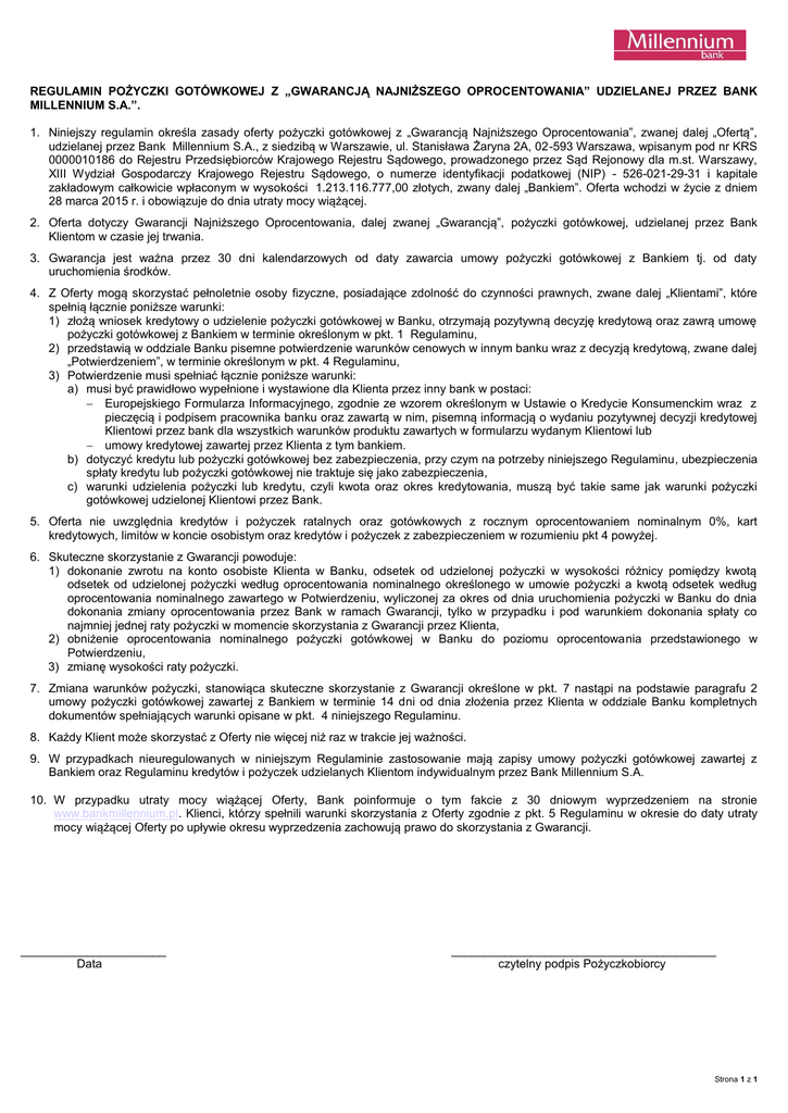REGULAMIN POŻYCZKI GOTÓWKOWEJ Z „GWARANCJĄ NAJNIŻSZEGO OPROCENTOWANIA” UDZIELANEJ PRZEZ BANK MILLENNIUM S.A.”. 1. Niniejszy regulamin określa zasady oferty pożyczki gotówkowej z „Gwarancją Najniższego Oprocentowania”, zwanej dalej „Ofertą”, udzielanej przez Bank Millennium S.A., z siedzibą w Warszawie, ul. Stanisława Żaryna 2A, 02-593 Warszawa, wpisanym pod nr KRS 0000010186 do Rejestru Przedsiębiorców Krajowego Rejestru Sądowego, prowadzonego przez Sąd Rejonowy dla m.st. Warszawy, XIII Wydział Gospodarczy Krajowego Rejestru Sądowego, o numerze identyfikacji podatkowej (NIP) - 526-021-29-31 i kapitale zakładowym całkowicie wpłaconym w wysokości 1.213.116.777,00 złotych, zwany dalej „Bankiem”. Oferta wchodzi w życie z dniem 28 marca 2015 r. i obowiązuje do dnia utraty mocy wiążącej. 2. Oferta dotyczy Gwarancji Najniższego Oprocentowania, dalej zwanej „Gwarancją”, pożyczki gotówkowej, udzielanej przez Bank Klientom w czasie jej trwania. 3. Gwarancja jest ważna przez 30 dni kalendarzowych od daty zawarcia umowy pożyczki gotówkowej z Bankiem tj. od daty uruchomienia środków. 4. Z Oferty mogą skorzystać pełnoletnie osoby fizyczne, posiadające zdolność do czynności prawnych, zwane dalej „Klientami”, które spełnią łącznie poniższe warunki: 1) złożą wniosek kredytowy o udzielenie pożyczki gotówkowej w Banku, otrzymają pozytywną decyzję kredytową oraz zawrą umowę pożyczki gotówkowej z Bankiem w terminie określonym w pkt. 1 Regulaminu, 2) przedstawią w oddziale Banku pisemne potwierdzenie warunków cenowych w innym banku wraz z decyzją kredytową, zwane dalej „Potwierdzeniem”, w terminie określonym w pkt. 4 Regulaminu, 3) Potwierdzenie musi spełniać łącznie poniższe warunki: a) musi być prawidłowo wypełnione i wystawione dla Klienta przez inny bank w postaci: Europejskiego Formularza Informacyjnego, zgodnie ze wzorem określonym w Ustawie o Kredycie Konsumenckim wraz z pieczęcią i podpisem pracownika banku oraz zawartą w nim, pisemną informacją o wydaniu pozytywnej decyzji kredytowej Klientowi przez bank dla wszystkich warunków produktu zawartych w formularzu wydanym Klientowi lub umowy kredytowej zawartej przez Klienta z tym bankiem. b) dotyczyć kredytu lub pożyczki gotówkowej bez zabezpieczenia, przy czym na potrzeby niniejszego Regulaminu, ubezpieczenia spłaty kredytu lub pożyczki gotówkowej nie traktuje się jako zabezpieczenia, c) warunki udzielenia pożyczki lub kredytu, czyli kwota oraz okres kredytowania, muszą być takie same jak warunki pożyczki gotówkowej udzielonej Klientowi przez Bank. 5. Oferta nie uwzględnia kredytów i pożyczek ratalnych oraz gotówkowych z rocznym oprocentowaniem nominalnym 0%, kart kredytowych, limitów w koncie osobistym oraz kredytów i pożyczek z zabezpieczeniem w rozumieniu pkt 4 powyżej. 6. Skuteczne skorzystanie z Gwarancji powoduje: 1) dokonanie zwrotu na konto osobiste Klienta w Banku, odsetek od udzielonej pożyczki w wysokości różnicy pomiędzy kwotą odsetek od udzielonej pożyczki według oprocentowania nominalnego określonego w umowie pożyczki a kwotą odsetek według oprocentowania nominalnego zawartego w Potwierdzeniu, wyliczonej za okres od dnia uruchomienia pożyczki w Banku do dnia dokonania zmiany oprocentowania przez Bank w ramach Gwarancji, tylko w przypadku i pod warunkiem dokonania spłaty co najmniej jednej raty pożyczki w momencie skorzystania z Gwarancji przez Klienta, 2) obniżenie oprocentowania nominalnego pożyczki gotówkowej w Banku do poziomu oprocentowania przedstawionego w Potwierdzeniu, 3) zmianę wysokości raty pożyczki. 7. Zmiana warunków pożyczki, stanowiąca skuteczne skorzystanie z Gwarancji określone w pkt. 7 nastąpi na podstawie paragrafu 2 umowy pożyczki gotówkowej zawartej z Bankiem w terminie 14 dni od dnia złożenia przez Klienta w oddziale Banku kompletnych dokumentów spełniających warunki opisane w pkt. 4 niniejszego Regulaminu. 8. Każdy Klient może skorzystać z Oferty nie więcej niż raz w trakcie jej ważności. 9. W przypadkach nieuregulowanych w niniejszym Regulaminie zastosowanie mają zapisy umowy pożyczki gotówkowej zawartej z Bankiem oraz Regulaminu kredytów i pożyczek udzielanych Klientom indywidualnym przez Bank Millennium S.A. 10. W przypadku utraty mocy wiążącej Oferty, Bank poinformuje o tym fakcie z 30 dniowym wyprzedzeniem na stronie www.bankmillennium.pl. Klienci, którzy spełnili warunki skorzystania z Oferty zgodnie z pkt. 5 Regulaminu w okresie do daty utraty mocy wiążącej Oferty po upływie okresu wyprzedzenia zachowują prawo do skorzystania z Gwarancji. ______________________ Data ________________________________________ czytelny podpis Pożyczkobiorcy Strona 1 z 1