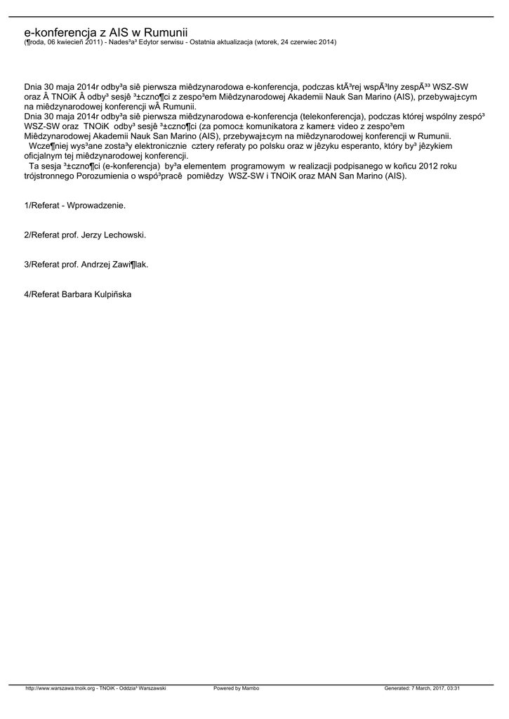 e-konferencja z AIS w Rumunii (¶roda, 06 kwiecieñ 2011) - Nades³a³ Edytor serwisu - Ostatnia aktualizacja (wtorek, 24 czerwiec 2014) Dnia 30 maja 2014r odby³a siê pierwsza miêdzynarodowa e-konferencja, podczas której wspólny zespó³ WSZ-SW oraz  TNOiK  odby³ sesjê ³±czno¶ci z zespo³em Miêdzynarodowej Akademii Nauk San Marino (AIS), przebywaj±cym na miêdzynarodowej konferencji w Rumunii. Dnia 30 maja 2014r odby³a siê pierwsza miêdzynarodowa e-konferencja (telekonferencja), podczas której wspólny zespó³ WSZ-SW oraz TNOiK odby³ sesjê ³±czno¶ci (za pomoc± komunikatora z kamer± video z zespo³em Miêdzynarodowej Akademii Nauk San Marino (AIS), przebywaj±cym na miêdzynarodowej konferencji w Rumunii. Wcze¶niej wys³ane zosta³y elektronicznie cztery referaty po polsku oraz w jêzyku esperanto, który by³ jêzykiem oficjalnym tej miêdzynarodowej konferencji. Ta sesja ³±czno¶ci (e-konferencja) by³a elementem programowym w realizacji podpisanego w koñcu 2012 roku trójstronnego Porozumienia o wspó³pracê pomiêdzy WSZ-SW i TNOiK oraz MAN San Marino (AIS). 1/Referat - Wprowadzenie. 2/Referat prof. Jerzy Lechowski. 3/Referat prof. Andrzej Zawi¶lak. 4/Referat Barbara Kulpiñska http://www.warszawa.tnoik.org - TNOiK - Oddzia³ Warszawski Powered by Mambo Generated: 7 March, 2017, 03:31