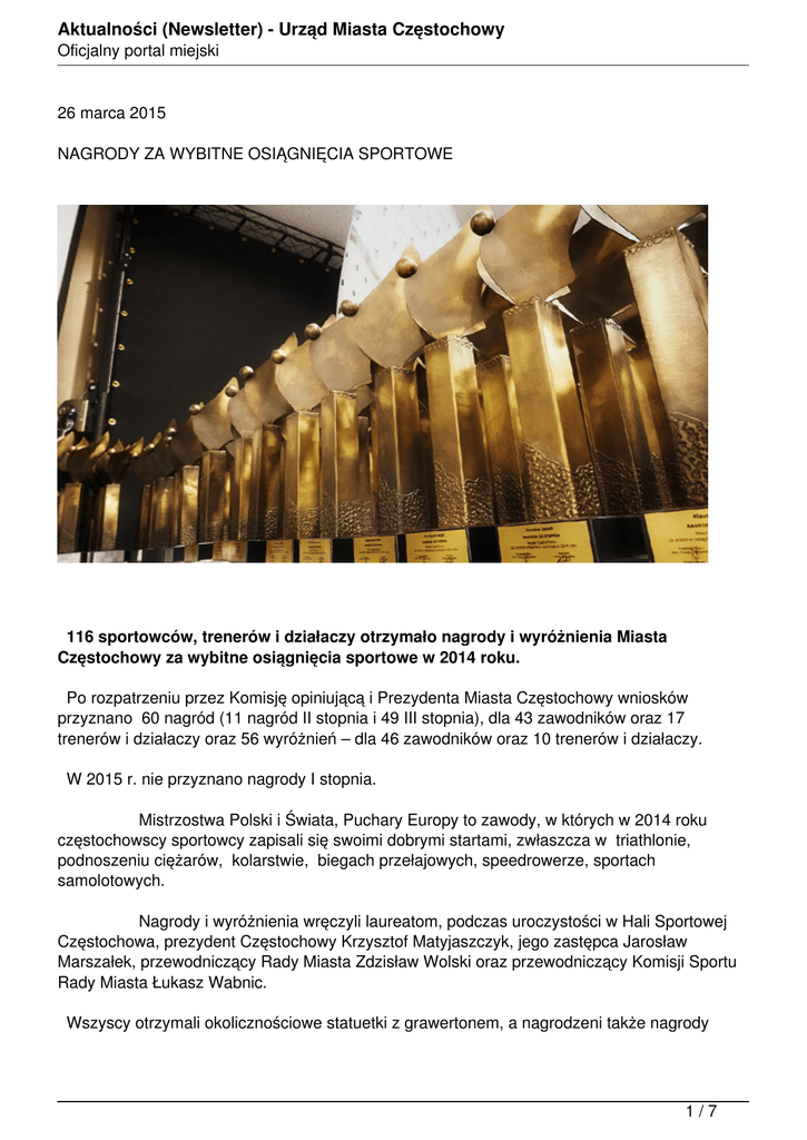 Aktualności (Newsletter) - Urząd Miasta Częstochowy Oficjalny portal miejski 26 marca 2015 NAGRODY ZA WYBITNE OSIĄGNIĘCIA SPORTOWE 116 sportowców, trenerów i działaczy otrzymało nagrody i wyróżnienia Miasta Częstochowy za wybitne osiągnięcia sportowe w 2014 roku. Po rozpatrzeniu przez Komisję opiniującą i Prezydenta Miasta Częstochowy wniosków przyznano 60 nagród (11 nagród II stopnia i 49 III stopnia), dla 43 zawodników oraz 17 trenerów i działaczy oraz 56 wyróżnień – dla 46 zawodników oraz 10 trenerów i działaczy. W 2015 r. nie przyznano nagrody I stopnia. Mistrzostwa Polski i Świata, Puchary Europy to zawody, w których w 2014 roku częstochowscy sportowcy zapisali się swoimi dobrymi startami, zwłaszcza w triathlonie, podnoszeniu ciężarów, kolarstwie, biegach przełajowych, speedrowerze, sportach samolotowych. Nagrody i wyróżnienia wręczyli laureatom, podczas uroczystości w Hali Sportowej Częstochowa, prezydent Częstochowy Krzysztof Matyjaszczyk, jego zastępca Jarosław Marszałek, przewodniczący Rady Miasta Zdzisław Wolski oraz przewodniczący Komisji Sportu Rady Miasta Łukasz Wabnic. Wszyscy otrzymali okolicznościowe statuetki z grawertonem, a nagrodzeni także nagrody 1/7 Aktualności (Newsletter) - Urząd Miasta Częstochowy Oficjalny portal miejski finansowe (II stopnia - 1 500 złotych, III stopnia - 750 złotych). Poniżej nagrodzeni zawodnicy, trenerzy i działacze, w załączonej tabeli: nagrodzeni i wyróżnieni Nagrody II stopnia 1. Ewa Bugdoł- Wiodący Ludowy Klub Sportowy „Kmicic” (triathlon) I miejsce w Mistrzostwach Polski w Triathlonie na dystansie długim w kat. elita, I miejsce w Pucharze Polski w Crossduathlonie na dystansie krótkim w kat. elita, IV miejsce w Mistrzostwach Świata w Triathlonie na dystansie długim, III miejsce w Pucharze Europy w Triathlonie na dystansie długim 1. Waldemar Chwastowski- Klub Uczelniany AZS Akademii im. Jana Długosza - trener sekcji podnoszenia ciężarów 2. Łukasz Grela- Klub Uczelniany AZS Akademii im. Jana Długosza awans do ekstraligi seniorów w podnoszeniu ciężarów, III miejsce w Mistrzostwach Polski Seniorów w Podnoszeniu Ciężarów w kat. wagowej 94 kg, I miejsce w Mistrzostwach Świata AZS Seniorów w Podnoszeniu Ciężarów 1. Grzegorz Gronkiewicz- Częstochowski Kolarski Klub Sportowy „Kolejarz – Jura” – trener 2. Martyna Klekot - Częstochowski Kolarski Klub Sportowy „Kolejarz–Jura” I miejsce w jeździe indywidualnej na czas i III miejsce w wyścigu ze startu wspólnego w Akademickich Mistrzostwach Świata w Kolarstwie w kategorii elita, I miejsce w klasyfikacji generalnej w Pucharze Polski w Kolarstwie Przełajowym, II miejsce w Mistrzostwach Polski w Kolarskich Kryteriach w kategorii elita i II miejsce w Mistrzostwach Polski w Kolarstwie Przełajowym w kategorii elita 1. Rafał Nowak - Częstochowski Klub Sportowy „Budowlani” – III miejsce indywidualnie i II miejsce drużynowo w Mistrzostwach Europy Głuchoniemych w Biegach Przełajowych na dystansie 4 km, III miejsce drużynowo w Mistrzostwach Polski Seniorów w Biegach Przełajowych 1. Sebastian Paruzel - Stowarzyszenie Speedway Fan Club – II miejsce w Indywidualnych Mistrzostwach Europy w Speedrowerze, III miejsce w Drużynowych Mistrzostwach Polski w Speedrowerze i I miejsce w Drużynowym Pucharze Polski w Speedrowerze 1. Tomasz Pokorski- Stowarzyszenie Speedway Fan Club – trener 2. Marcin Szymański- Stowarzyszenie Speedway Fan Club – 2/7 Aktualności (Newsletter) - Urząd Miasta Częstochowy Oficjalny portal miejski I miejsce w Drużynowych Mistrzostwach Europy w Speedrowerze i IV miejsce w Indywidualnych Mistrzostwach Europy w Speedrowerze, I miejsce indywidualnie w Pucharze Polski w Speedrowerze, III miejsce w Drużynowych Mistrzostwach Polski w Speedrowerze i I miejsce w Drużynowym Pucharze Polski w Speedrowerze, I miejsce w Drużynowych Mistrzostwach Europy w Speedrowerze i IV miejsce w Indywidualnych Mistrzostwach Europy w Speedrowerze 1. Rafał Szymura - Klub Sportowy AZS Częstochowa SSA II miejsce w Mistrzostwach Europy Juniorów w Piłce Siatkowej 1. Sławomir Talowski- Aeroklub Częstochowski I miejsce drużynowo, II miejsce w programie dowolnym i III miejsce w klasyfikacji generalnej w Szybowcowych Mistrzostwach Świata, II miejsce w Mistrzostwach Polski w Akrobacji Szybowcowej NAGRODY III STOPNIA 1. Tomasz Góra-Częstochowska Akademia Taekwon-do I miejsce w Mistrzostwach Polski w Taekwon-do w walkach indywidualnych w kat. wagowej do 57 kg 1. Kamil Klimaszewski- Częstochowska Akademia Taekwon-do II miejsce w Mistrzostwach Polski w Taekwon-do w walkach aranżowanych 1. Jacek Wąsik- Częstochowska Akademia Taekwon-do - trener, działacz 2. Rafał Bogus- Stowarzyszenie Sportowe Seniorzy-Juniorom „Siatkówka 2002” – trener 3. Anita Kisiel- Wiodący Ludowy Klub Sportowy „Kmicic” I miejsce w Mistrzostwach Polski w Triathlonie na dystansie długim w kat. plus senior 40 1. Przemysław Szymanowski- Wiodący Ludowy Klub Sportowy „Kmicic” II miejsce w Mistrzostwach Polski w Crosstriathlonie na dystansie długim w kat. elita, I miejsce w Pucharze Polski w Crossduathlonie na dystansie krótkim w kat. Elita 1. Krzysztof Toczko - Wiodący Ludowy Klub Sportowy „Kmicic” – działacz 2. Dominika Mirowska- Częstochowski Ośrodek Szkolenia Wyczynowego I miejsce w skokach z wieży w kat. open kobiet oraz w kat B dziewcząt, II miejsce w skokach z trampoliny 1m i 3m w kat. B dziewcząt w Letnich Mistrzostwach Polski, II miejsce w skokach do wody z trampoliny 1m w kat. B dziewcząt, III miejsce w skokach z trampoliny 3m oraz wieży w kat. B dziewcząt w Zimowych Mistrzostwach Polski 3/7 Aktualności (Newsletter) - Urząd Miasta Częstochowy Oficjalny portal miejski 1. Dariusz Pleśniak- Klub Sportów Walki „Start” – trener 2. Karolina Klabis- ISD – AJD Częstochowa II miejsce w Mistrzostwach Polski w Futsalu 1. Renata Uchnast- ISD – AJD Częstochowa II m