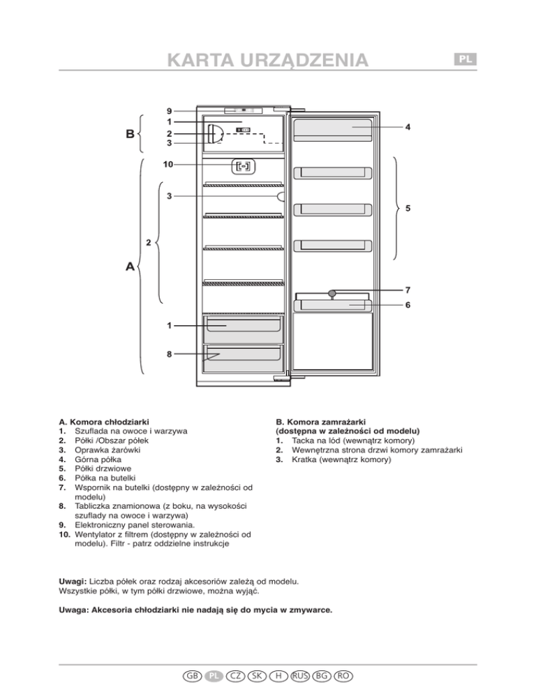 KARTA URZĄDZENIA A. 1. 2. 3. 4. 5. 6. 7. Komora chłodziarki Szuflada na owoce i warzywa Półki /Obszar półek Oprawka żarówki Górna półka Półki drzwiowe Półka na butelki Wspornik na butelki (dostępny w zależności od modelu) 8. Tabliczka znamionowa (z boku, na wysokości szuflady na owoce i warzywa) 9. Elektroniczny panel sterowania. 10. Wentylator z filtrem (dostępny w zależności od modelu). Filtr - patrz oddzielne instrukcje B. Komora zamrażarki (dostępna w zależności od modelu) 1. Tacka na lód (wewnątrz komory) 2. Wewnętrzna strona drzwi komory zamrażarki 3. Kratka (wewnątrz komory) Uwagi: Liczba półek oraz rodzaj akcesoriów zależą od modelu. Wszystkie półki, w tym półki drzwiowe, można wyjąć. Uwaga: Akcesoria chłodziarki nie nadają się do mycia w zmywarce. GB PL CZ SK PL H RUS BG RO OPIS PANELU STEROWANIA B A F G H A. Wskaźnik ustawionej temperatury. Jeśli na wyświetlaczu miga litera "A", należy skontaktować się z Serwisem Technicznym. B. Przycisk "Wł." / Tryb czuwania. C. Przycisk ustawiania żądanej temperatury (+3, +4, +5, +6, +7 °C) D. Przycisk Szybkiego zamrażania - w urządzeniach wyposażonych w komorę zamrażarki (funkcja Szybkiego zamrażania musi być włączona co najmniej 3 godziny przed włożeniem do zamrażarki świeżej żywności. Wyłącza się automatycznie po 26 godzinach) D. Przycisk Szybkiego chłodzenia - w urządzeniach bez komory zamrażarki (funkcja wyłącza się automatycznie po ok. 6 godzinach). E. Żółta kontrolka świeci się, gdy włączona jest funkcja Szybkiego zamrażania (lub Szybkiego chłodzenia). GB PL C CZ SK E D F. Przycisk wyłączania alarmu dźwiękowego (alarm uruchamia sygnał dźwiękowy, gdy drzwi chłodziarki są otwarte przez ponad dwie minuty) G. Czerwona kontrolka miga, gdy aktywny jest sygnał otwartych drzwi lub gdy na wyświetlaczu miga litera "A" H. Blokada przycisków - aby ją włączyć, należy jednocześnie nacisnąć przyciski F i D. W ten sposób zapobiega się przypadkowej zmianie temperatury oraz wybranych funkcji przez inne osoby (np. dzieci). Aby wyłączyć funkcję "Blokada przycisków", należy powtórzyć tę samą czynność, tj. wcisnąć jednocześnie przyciski F i D H RUS BG RO REGULACJA TEMPERATURY CHŁODZIARKI Urządzenie jest ustawione fabrycznie do pracy z zalecaną temperaturą wynoszącą +5°C. Istnieje możliwość zmiany temperatury w zakresie od +3°C do +7°C w następujący sposób: • Wcisnąć jeden raz przycisk C regulacji temperatury wewnętrznej: na cyfrowym wskaźniku zacznie migać poprzednio ustawiona temperatura. • Teraz można zmienić temperaturę wewnątrz chłodziarki: każdorazowe naciśnięcie przycisku powoduje jej zmianę o 1°C: wartość temperatury miga cyklicznie (w zakresie od +3°C do +7°C). • • Około 5 sekund po ostatnim wciśnięciu przycisku ustawiona temperatura zostaje zapisana w pamięci, a cyfrowy wskaźnik przestaje migać. Temperatury komory zamrażarki (ok. –18 / –24°C) nie można ustawić. Jest ona regulowana automatycznie przez elektroniczny układ sterowania. Uwaga: W przypadku przerwy w dopływie prądu ustawienia funkcji pozostają bez zmian. WYMIANA ŻARÓWKI Przed przystąpieniem do wymiany żarówek należy zawsze odłączyć urządzenie od zasilania. Jeżeli oświetlenie nie działa, należy: 1. Zdjąć osłonę żarówki: wsunąć palce w boczne otwory wentylacyjne (1) i delikatnie pociągnąć osłonę w górę. 2. Sprawdzić żarówkę: w razie potrzeby odkręcić przepaloną żarówkę i wymienić ją na nową (o maksymalnej mocy 15 W). 3. Założyć z powrotem osłonę żarówki. 5019 608 01069 Printed in Italy 02/10 Nie pozostawiać żarówek bez osłony. GB PL CZ SK H RUS BG RO