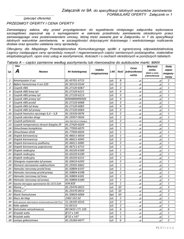 Załącznik nr 9A do specyfikacji istotnych warunków zamówienia FORMULARZ OFERTY Załącznik nr 1 ...................................... (pieczęć oferenta) PRZEDMIOT OFERTY I CENA OFERTY Zamawiający zaleca, aby przed przystąpieniem do wypełnienia niniejszego załącznika wykonawca szczegółowo zapoznał się z wymaganiami w zakresie przedmiotu zamówienia określonymi przez zamawiającego oraz postanowieniami umowy, której treść zawarta jest w Załączniku nr 7 do specyfikacji istotnych warunków zamówienia, w szczególności dotyczącymi ilościowego i wartościowego rozliczenia dostaw oraz sposobu ustalania ceny sprzedaży. Oferujemy dla Miejskiego Przedsiębiorstwa Komunikacyjnego spółki z ograniczoną odpowiedzialnością Legnicy następujące ceny sprzedaży nowych i regenerowanych części zamiennych podzespołów, materiałów eksploatacyjnych, opon oraz usług w asortymencie, ilościach i o cechach określonych w poniższych tabelach. Tabela A – części zamienne według asortymentu lub równoważne do autobusów marki: MAN Man Lp. 1 2 3 4 5 6 7 8 9 10 11 12 13 14 15 16 17 18 19 20 21 22 23 24 25 26 27 28 29 30 31 32 33 34 35 36 37 38 39 A Nazwa Amortyzator II osi Bęben hamulcowy II osi 220 Czujnik ABS Czujnik ABS lewy tył Czujnik ABS prawy tył Czujnik ABS prawy tył Czujnik ABS przód Czujnik ABS tył lewy Czujnik ABS tył prawy Czujnik hamulca ręcznego 5,4 – 5,8 Czujnik odcinka drogi Czujnik położenia Czujnik temperatury skrzyni biegów ZF Dmuchawa kompletna Dmuchawa-silnik Drążek kierowniczy Drążek kierowniczy Drążek kierowniczy podłużny Drążek kierowniczy poprzeczny Drążek reakcyjny Drążek reakcyjny Drążek reakcyjny Dźwignia rozpieraka tył prawa Element sterowania nadmuchem Hamulec tarczowy przód lewy Hamulec tarczowy przód prawy Hamulec tarczowy tył lewy Hamulec tarczowy tył prawy Nr katalogowy 81.43701-6715 81.50110-0144 81.27120-6067 81.27120-6211 81.27120-6213 BO04860000583 81.27120-6068 81.27120-6065 81.27120-6064 81.25520-0076 81.25937-0016 441 050 012 0 Wabco 81.27420-6029 81.77930-6075 81.77930-6034 81.46611-6016 81.46611-6045 81.46611-6085 81.46711-6715 81.43220-6189 81.43220-6190 81.43220-6215 81.50610-6203 81.25935-6662 81.50804-6197 81.50804-6198 81.50804-6181 81.50804-6180 634.82E Kaseta sterująca ogrzewania SG 1572 D24 Klema „-” 81.25470-0015 Klema „+” 81.25470-0014 Klocki hamulcowe 81.50820-6004 Klucz do klap 2302 552 02 Koło pasowe alternatora wielorowkowe12K/73,3 51.26105-0216 Koło zębate 51.02115 Końcówka wtryskiwacza B0 0433 171 159 Krzyżak wału Ø 57 x 144 Krzyżak wału Ø 52 x 147 Lampa gabarytowa 81.25260-6077 Cena Indeks J.M. Ilość jednostkowa magazynowy netto szt. szt. szt. szt. szt. szt. szt. szt. szt. szt. szt. szt. szt. szt. szt. szt. szt. szt. szt. szt. szt. szt. szt. szt. szt. szt. szt. szt. szt. szt. szt. kpl. szt. szt. szt. szt. szt. szt. szt. 8 2 2 4 3 4 3 4 2 2 1 2 1 1 1 1 2 2 1 1 1 1 2 1 1 1 1 1 1 10 10 10 2 2 2 6 1 1 6 Wartość netto (ilość x cena jednostkowa) …………….zł ……….……….zł …………….zł ……….……….zł …………….zł ……….……….zł …………….zł ……….……….zł …………….zł ……….……….zł …………….zł ……….……….zł …………….zł ……….……….zł …………….zł ……….……….zł …………….zł ……….……….zł …………….zł ……….……….zł …………….zł ……….……….zł …………….zł ……….……….zł …………….zł ……….……….zł …………….zł ……….……….zł …………….zł ……….……….zł …………….zł ……….……….zł …………….zł ……….……….zł …………….zł ……….……….zł …………….zł ……….……….zł …………….zł ……….……….zł …………….zł ……….……….zł …………….zł ……….……….zł …………….zł ……….……….zł …………….zł ……….……….zł …………….zł ……….……….zł …………….zł ……….……….zł …………….zł ……….……….zł …………….zł ……….……….zł …………….zł ……….……….zł …………….zł ……….……….zł …………….zł ……….……….zł …………….zł ……….……….zł …………….zł ……….……….zł …………….zł ……….……….zł …………….zł ……….……….zł …………….zł ……….……….zł …………….zł ……….……….zł …………….zł ……….……….zł …………….zł ……….……….zł Stały zapas magazynowy 2 1 1 1 1 1 1 1 1 1 1 1 1 1 1 1 1 1 1 1 1 1 1 1 1 1 1 1 1 3 3 2 1 1 1 6 1 1 2 1|Strona Man Lp. 40 41 42 43 44 45 46 47 48 49 50 51 52 53 54 55 56 57 58 59 60 61 62 63 64 65 66 67 68 69 70 71 72 73 74 75 76 77 78 79 80 81 82 83 84 85 86 87 88 89 90 91 92 93 94 A Nazwa Nr katalogowy Lampa halogenowa z kierunkowskazem lewa 81.25320-6091 81.25320-6112 Lampa obrysowa czerwona 81.25225-6485 Lampa oświetlenia tablicy rejestracyjnej 001 820 7656MP Lampa przednia 81.25101-6219 Lampa reflektorowa lewa str. 81.25101-6357 Lampa reflektorowa prawa 81.25101-6348 /6448 Lampa reflektorowa prawa str. 81.25101-6356 Lampa tył lewa 81.25225-6511 Lampa tył prawa 81.25225-6510 Listwa zaworowa sprężarki 601 07 145 04 7 Łącznik 8/M10 Łącznik ECAS-u 81.43613-0030 Łożysko 32019 Łożysko 32310 Łożysko 33019 33019x Łożysko 33021 06.32499-0188 Łożysko 6304 6304 ZZ Łożysko 6306 81.93410-0074 Łożysko kolumny obrotowej przód 81.74967-0053 Łożysko kolumny obrotowej tył 81.74967-0054 Łożysko piasty 33021 Łożysko pompy wody 51.93410-0051 Łożysko stożkowo – rolkowe z kołem impulsowym 81.93420-0349 Łożysko wieszaka BTH 1024C SKF Magnes wypychający KM60/Z Membrana B121AB445 Membrana siłownika 897 120 5404 Mufa 
