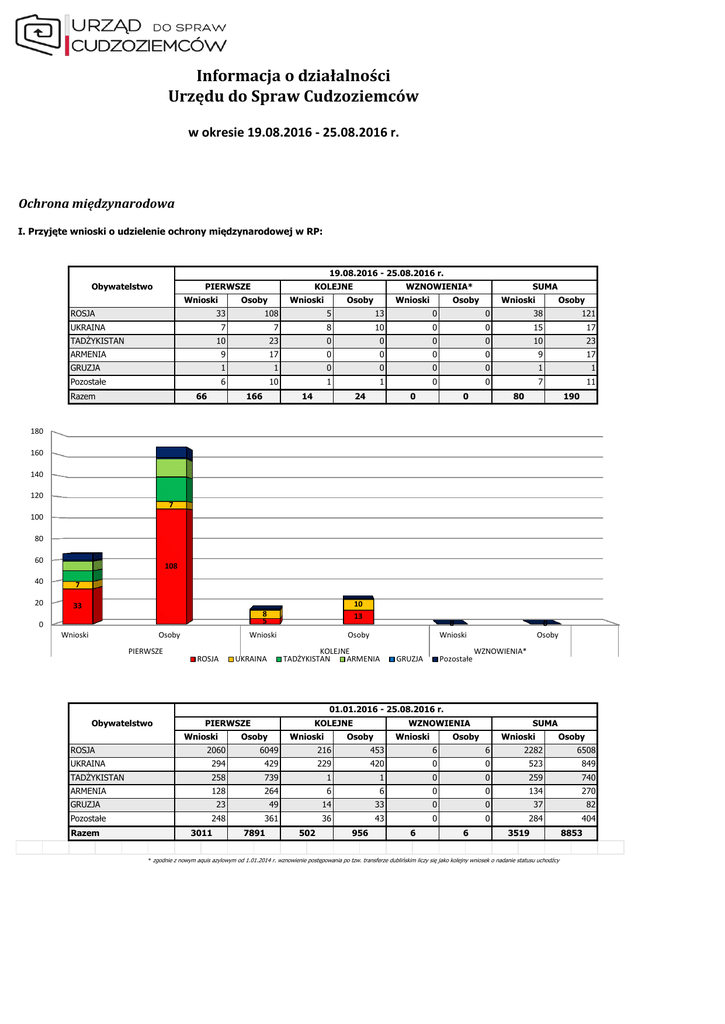 Informacja o działalności Urzędu do Spraw Cudzoziemców w okresie 19.08.2016 - 25.08.2016 r. Ochrona międzynarodowa I. Przyjęte wnioski o udzielenie ochrony międzynarodowej w RP: 19.08.2016 - 25.08.2016 r. Obywatelstwo PIERWSZE Osoby Wnioski ROSJA KOLEJNE WZNOWIENIA* Osoby Wnioski SUMA Osoby Wnioski Osoby Wnioski 33 108 5 13 0 0 38 121 7 7 8 10 0 0 15 17 10 23 0 0 0 0 10 23 ARMENIA 9 17 0 0 0 0 9 17 GRUZJA 1 1 0 0 0 0 1 1 Pozostałe 6 10 1 1 0 0 7 11 UKRAINA TADŻYKISTAN Razem 66 166 14 24 0 0 80 190 180 160 140 120 7 100 80 60 108 40 7 20 33 10 13 8 5 0 Wnioski Osoby PIERWSZE Wnioski ROSJA 0 Wnioski Osoby KOLEJNE TADŻYKISTAN ARMENIA UKRAINA GRUZJA Pozostałe 0 Osoby WZNOWIENIA* 01.01.2016 - 25.08.2016 r. Obywatelstwo PIERWSZE Wnioski ROSJA KOLEJNE Osoby WZNOWIENIA Osoby Wnioski SUMA Osoby Wnioski Wnioski Osoby 2060 6049 216 453 6 6 2282 6508 UKRAINA 294 429 229 420 0 0 523 849 TADŻYKISTAN 258 739 1 1 0 0 259 740 ARMENIA 128 264 6 6 0 0 134 270 23 49 14 33 0 0 37 82 248 361 36 43 0 0 284 404 GRUZJA Pozostałe Razem 3011 7891 502 956 6 6 3519 * zgodnie z nowym aquis azylowym od 1.01.2014 r. wznowienie postępowania po tzw. transferze dublińskim liczy się jako kolejny wniosek o nadanie statusu uchodźcy 8853 8000 7000 6000 5000 4000 6049 3000 2000 2060 1000 0 Wnioski Osoby 216 453 Wnioski Osoby PIERWSZE 6 Wnioski KOLEJNE ROSJA UKRAINA TADŻYKISTAN 6 Osoby WZNOWIENIA ARMENIA GRUZJA Pozostałe Do 25 sierpnia 2016 r. wniosek o udzielenie ochrony międzynarodowej złożyło 8 853 cudzoziemców, z czego 89% stanowiły wnioski pierwsze. 91% wniosków zostało złożonych przez obywateli pochodzących z trzech państw: Rosji (6 512 os., 73% ogółu), Ukrainy (853 os., 10% ogółu) Tadżykistanu (740 os., 8% ogółu). W gronie pozostałych dominujących grup, (jednak wyraźnie nie tak licznych jak poprzednie państwa) znalazły się także wnioski złożone przez obywateli: Armenii (270 os., 3% ogółu), Gruzji (81 os., 1% ogółu), Turcji (58 os., 1%), Kirgistanu (45 os.), Kazachstanu (36 os.), Wietnamu (35 os.) i Syrii ( 34 os.) . Jeden wniosek obejmuje średnio 2-3 osoby. Porównując ten przedział czasowy z analogicznym okresem 2015 r. widoczny jest wzrost ogólnej liczby osób aplikujących o ochronę międzynarodowej o 38% (+2 421 wniosków). Najważniejsze zmiany, jakie miały miejsce w tym czasie to: * prawie dwukrotny wzrost liczby wnioskodawców z Rosji (6 512/3 642), * spadek o połowę liczby wnioskodawców z Ukrainy (853/1 627); Ukraina jako jedno z dwóch państw z zestawienia TOP 5 charakteryzuje się wysokim na tle innych krajów odsetkiem kolejnych wniosków: 57%, podczas gdy w przypadku innych państw jest to wartość w przedziale 2-7%, a zdecydowaną większość stanowią wnioski pierwsze (93%-100%). * 4-krotny wzrost wnioskodawców z Tadżykistanu (740/190); z powodu trwającego konfliktu wewnętrznego w Tadżykistanie, od sierpnia 2015 r. widoczny jest wzrost wniosków. Aktualna liczba wnioskodawców z Tadżykistanu aplikujących o ochronę w 2016 r. przekroczyła o ponad czterokrotnie liczbę wniosków złożonych przez obywateli tego kraju w 2015 r., * 3-krotny wzrost liczby wniosków z Armenii (270/82) związany z konfliktem w Górnym Karabachu pomiędzy Armenią i Azerbejdżanem. Obecność licznej diaspory Ormiańskiej wyjaśnia wybór Polski jako kraju właściwego do ubiegania się o ochronę międzynarodową, * spadek o 72% liczby wniosków z Gruzji (81/290). Gruzja dołączyła do Ukrainy, jako kolejne państwo z tendencją do dużego odsetka wniosków kolejnych (57%). * wzrost liczby wnioskodawców z Turcji (58/4). Wzrost liczby złożonych wniosków miał miejsce głównie w pierwszym kwartale (8 os./41 os./7 os.). * spadek o 86% wnioskodawców z Syrii (34/244). W 2015 r. duża liczba aplikantów z Syrii miała związek z przyjazdem (z inicjatywy Fundacji Estera) do Polski w połowie lipca grupy 158 Syryjczyków, z których wszyscy złożyli wnioski o nadanie statusu uchodźcy. II. Stosowanie Rozporządzenia Dublińskiego*: Transfer Decyzja pozytywna Wniosek OUT Państwo 01.01.2016 - 25.08.2016 r. Transfer Decyzja pozytywna Wniosek IN Państwo 01.01.2016 - 25.08.2016 r. NIEMCY 4442 4072 433 NIEMCY 43 24 4 FRANCJA 556 502 21 WĘGRY 15 2 0 AUSTRIA 444 399 90 AUSTRIA 13 7 0 SZWECJA 251 226 41 FRANCJA 11 1 0 NIDERLANDY 207 204 21 BELGIA 6 4 0 Pozostałe 426 427 97 Pozostałe 35 17 Suma 6326 5830 703 Suma 123 55 1 5 Zdecydowaną większość działań związanych ze stosowaniem Procedur Dublińskich stanowią sprawy dotyczące przejęcia odpowiedzialności za wniosek o udzielenie ochrony złożony na terytorium innego państwa członkowskiego (tzw. IN). Liczba cudzoziemców objętych wnioskami IN wyniosła od początku roku 6 326os. Polska wystąpiła z takim wnioskiem do innych krajów europejskich (OUT) w przypadku 123 os., z czego 92% wniosków IN oraz 45% wniosków OUT zostało rozpatrzonych pozytywnie. 62% wniosków IN oraz 35% wniosków OUT dotyczy współpracy z Niemcami. Poza tym, osoby, które ubiegały się o ochronę międzynarodową w Polsce składały niezmiennie kolejne wnioski we Francji, Austrii, Szwecji i Holandii. Z kolei dalsze wnioski OUT z Polski kierowane były tradycyjnie głównie do Austrii, Węgier, Francji i Litwy. . * ustanawiającego kryteria określania, które państwo członkowskie jest odpowiedzialne za rozpatrzenie wniosku o ochronę międzynarodową III. Wydane decyzje w sprawie o udzielenie ochrony międzynarodowej: Umorzenie Negatywna Pobyt tolerowany Status uchodźcy Obywatelstwo Ochrona uzupełniająca 19.08.2016 - 25.08.2016 r. ROSJA 0 2 0 12 170 UKRAINA 0 0 0 7 11 TADŻYKISTAN 0 0 0 0 13 ARMENIA 0 0 0 1 4 GRUZJA 0 0 0 5 1 Pozostałe 0 0 0 5 12 Razem 0 2 0 30 211 Umorzenie Negatywna Pobyt tolerowany Status uchodźcy Obywatelstwo Ochrona uzupełniająca 01.01.2016 - 25.08.2016 r. ROSJA 7 40 8 661 6 161 UKRAINA 0 22 1 497 330 TADŻYKISTAN 0 0 0 13 610 ARMENIA 0 0 5 10 202 GRUZJA 0 1 0 31 83 47 30 7 147 240 Pozostałe Raz