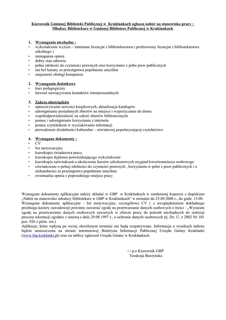Kierownik Gminnej Biblioteki Publicznej w Kruklankach ogłasza nabór na stanowisko pracy : Młodszy Bibliotekarz w Gminnej Bibliotece Publicznej w Kruklankach 1. Wymagania niezbędne : • wykształcenie wyższe – minimum licencjat z bibliotekarstwa ( preferowany licencjat z bibliotekarstwa szkolnego ) • nienaganna opinia • dobry stan zdrowia • pełna zdolność do czynności prawnych oraz korzystanie z pełni praw publicznych • nie był karany za przestępstwa popełnione umyślnie • znajomość obsługi komputera 2. Wymagania dodatkowe • kurs pedagogiczny • łatwość nawiązywania kontaktów interpersonalnych 3. Zakres obowiązków • opracowywanie nowości książkowych, aktualizacja katalogów • udostępnianie posiadanych zbiorów na miejscu i wypożyczanie do domu • współodpowiedzialność na całość zbiorów bibliotecznych • pomoc i udostępnianie korzystania z internetu • pomoc czytelnikom w wyszukiwaniu informacji • prowadzenie działalności kulturalno – oświatowej popularyzującej czytelnictwo 4. Wymagane dokumenty : • CV • list motywacyjny • kserokopia świadectwa pracy • kserokopia dyplomu potwierdzającego wykształcenie • kserokopia zaświadczeń o ukończeniu kursów szkoleniowych oryginał kwestionariusza osobowego • oświadczenie o pełnej zdolności do czynności prawnych , korzystaniu w pełni z praw publicznych i o niekaralności za przestępstwa popełnione umyślnie • ewentualna opinia z poprzedniego miejsca pracy Wymagane dokumenty aplikacyjne należy składać w GBP w Kruklankach w zamknietej kopercie z dopiskiem „Nabór na stanowisko młodszy bibliotekarz w GBP w Kruklankach” w terminie do 25.09.2008 r., do godz. 15.00. Wymagane dokumenty aplikacyjne : list motywacyjny, szczegółowe CV ( z uwzględnieniem dokładnego przebiegu kariery zawodowej) powinny zawierać zgodę na przetwarzanie danych osobowych o treści : „Wyrażam zgodę na przetwarzanie danych osobowych zawartych w ofercie pracy do potrzeb niezbędnych do realizcji procesu rekrutacji zgodnie z ustawą z dnia 29.08.1997 r., o ochronie danych osobowych (tj. Dz. U. z 2002 Nr 101 poz. 926 z późn. zm.) Aplikacje, które wpłyną po wyżej określonym terminie nie będą rozpatrywane. Informacja o wynikach naboru będzie umieszczona na stronie internetowej Biuletynu Informacji Publicznej Urzędu Gminy Kruklanki (www.bip.kruklanki.pl) oraz na tablicy ogłoszeń Urzędu Gminy w Kruklankach. /-/ p.o Kierownik GBP Teodozja Burzyńska