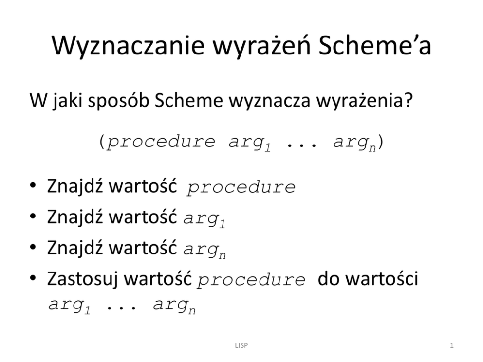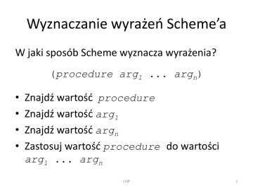 Wyznaczanie wyrażeo Scheme’a W jaki sposób Scheme wyznacza wyrażenia? (procedure arg1 ... argn) • • • • Znajdź wartośd procedure Znajdź wartośd arg1 Znajdź wartośd argn Zastosuj wartośd procedure do wartości arg1 ... argn LISP 1 Wyznaczanie wyrażeo Scheme’a Przykład Wyrażenie (+ 3 4) Wartością procedury + jest dodawanie Wartością 3 jest liczba 3 Wartością 4 jest liczba 4 Stosując dodawanie + dla liczb 3 i 4 daje to 7 Wartością jest obiekt 7 LISP 2 Wyznaczanie wyrażeo Scheme’a Przykład Znajdź wartośd zagnieżdżonego wyrażenia (* (+ 3 4) 2) Wartością * jest procedura mnożenia Wartością (+ 3 4) jest liczba 7 Wartością 2 jest liczba 2 Mnożąc 7 przez 2 uzyskujemy 14 Odpowiedź brzmi 14 LISP 3 Wyznaczanie wyrażeo Scheme’a • Reguła ta jest słuszna dla oceniania procedur ale nie dla cytowanego (quote) wyrażenia • Podwyrażenia procedury są oceniane, zaś podwyrażenia cytowanego nie • Wyznaczanie wartości wyrażeniom quote jest podobne do oceny stałych obiektów • Wartością wyrażenia quote przykładowo (quote object) jest po prostu object LISP 4 Wyznaczanie wyrażeo Scheme’a • Wyznaczanie wartości wyrażeo w Scheme-ie ma charakter dowolnego kierunku – od lewej do prawej – od prawej do lewej – jakikolwiek inny dowolny kierunek • Wartości podwyrażeo mogą byd wyznaczane w dowolnych kierunkach dla tego samego wyrażenia LISP 5 Wyznaczanie wyrażeo Scheme’a Przykład. Wyznacz wartośd wyrażenia ((car (list + - * /)) 2 3) Procedura ma postad (car (list + - * /)) Wartością (car (list + - * /)) jest operacja dodawania Tak jakby procedura była po prostu zmienną + LISP 6 Zmienne i wyrażenie let • Oznaczenia: – expr jest wyrażeniem Scheme-a zawierające zmienną var – var posiada wartośd val uzyskaną z oceny wyrażenia expr • let – forma składniowa • let zawiera listę par zmienna-wyrażenie oraz sekwencję wyrażeo stanowiące ciało formy składniowej let LISP 7 Zmienne i wyrażenie let • Ogólna postad wyrażenia let (let ((var val)...)exp1 exp2 ...) • let związuje (przypisuje) zmiennym wartości • Mówimy o zmiennych związanych poprzez let-przypisanie • Wyrażenie let jest często stosowane w celu uproszczenia wyrażeo zawierających dwa identyczne wyrażenia LISP 8 Zmienne i wyrażenie let • Wartośd wspólnego podwyrażenia jest wyznaczana tylko raz (+ (* 4 4) (* 4 4)) 32 (let ((a (* 4 4))) (+ a a)) 32 LISP 9 Zmienne i wyrażenie let Przykład użycia formy składniowej let (let ((x 2)) (+ x 3)) 5 (let ((y 3)) (+ 2 y)) 5 (let ((x 2) (y 3)) (+ x y)) 5 LISP 10 Zmienne i wyrażenie let Przykład. Jaka będzie wartośd wyrażenia? (let ((list1 '(a b c)) (list2 '(d e f))) (cons (cons (car list1) (car list2)) (cons (car (cdr list1)) (car (cdr list2)))) LISP ((a . d) b . e) 11 Zmienne i wyrażenie let Przykład użycia formy składniowej let (let ((f +)) (f 2 3)) 5 5 5 (let ((f +) (x 2)) (f x 3)) (let ((f +) (x 2) (y 3)) (f x y)) LISP 12 Zmienne i wyrażenie let • Zmienne związane przez wyrażenie let są widoczne tylko wewnątrz procedury let • Przykładowo: (let ((+ *)) (+ 2 3)) 6 (+ 2 3) 5 LISP 13 Zmienne i wyrażenie let • Zagnieżdżone wyrażenie let (let ((a 4) (b -3)) (let ((a-squared (* a a)) (b-squared (* b b))) (+ a-squared b-squared))) 25 • Kiedy zagnieżdżone wyrażenie let wiąże tę samą zmienną, tylko wewnętrzne związanie poprzez let jest widoczne w wyrażeniu LISP 14 Zmienne i wyrażenie let Przykład Jaka jest wartośd wyrażenia(+ x 1)? Co powiemy o wartości (+ x x)? (let ((x 1)) (let ((x (+ x 1))) (+ x x))) 4 LISP 15 Zmienne i wyrażenie let • Wewnętrzne związanie x powoduje tzw. przyciemnianie (przykrycie) zewnętrznego let • Zmienna związana przez let jest widoczna gdziekolwiek w ciele rozważanego wyrażenia poza zjawiskiem przykrycia • Granice dla których związane zmienne są widoczne nazywa się zakresem (zasięgiem) widoczności LISP 16 Zmienne i wyrażenie let • Zasięg pierwszej wartości x jest w ciele zewnętrznego wyrażenia let • W wewnętrznym wyrażeniu let jest ona przykryta przez drugą wartośd x • Ten sposób zasięgu określany jest jako leksykalny zasięg • Zasięg każdego związania zmiennej może byd określany poprzez analizę programu LISP 17 Zmienne i wyrażenie let • Przykrywanie może byd zapobiegnięte poprzez wybranie odmiennych nazw dla zmiennych • Poprzednie wyrażenie przepisano, tak aby zmienna związana przez wewnętrzne let uzyskała nową nazwę new-x (let ((x 1)) (let ((new-x (+ x 1))) (+ new-x new-x))) 4 LISP 18 Wyrażenie lambda • Forma składniowa lambda tworzy nową procedurę • Ogólna forma lambda wyrażenia ma postad (lambda (var ...) exp1 exp2 ...) • Zmienne var ... są formalnymi parametrami procedury lambda • Sekwencja wyrażeo exp1 ... jest jego ciałem LISP 19 Wyrażenie lambda • Przykładowo: procedura posiada parametr x i ma ciało podobne do wyrażenia let (lambda (x) (+ x x)) #<procedure> • Najbardziej znaną operacją do wykonania procedury jest zastosowanie jej do jednej lub wielu wartości ((lambda (x) (+ x x)) (* 3 4)) 24 LISP 20 Wyrażenie lambda • Procedury są obiektami: – można określad je jako wartości zmiennych – mogą byd wywołane więcej niż jeden raz (let ((double (lambda (x) (+ x x)))) (list (double (* 3 4)) (double (/ 99 11)) (double (- 2 7)))) (24 18 -10) LISP 21 Wyrażenie lambda • Parametry mogą byd dowolnym obiektem • Przykładowe zastosowanie cons zamiast + (let((double-cons (lambda (x)(cons x x)))) (double-cons 'a)) (a . a) LISP 22 Wyrażenie lambda • Zwracając uwagę na podobieostwa double and double-cons • Można powyższą procedurę zapisad w postaci (let ((double-any (lambda (f x) (f x x)))) (list (double-any + 13) (double-any cons 'a))) (26 (a . a)) LISP 23 Wyrażenie lambda • Wyrażenie lambda może byd zagnieżdżane wewnątrz wyrażeo lambda i let (let ((x 'a)) (let ((f (lambda (y) (list x y)))) (f 'b))) (a b) 