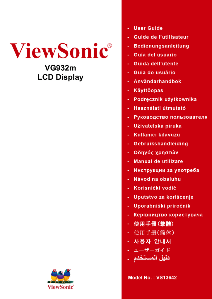 ViewSonic ® VG932m LCD Display Model No. : VS13642 Spis treúci Oświadczenia o zgodności z przepisami ........................................................1 Ważne instrukcje bezpieczeństwa...................................................................2 Deklaracja zgodności RoHS............................................................................3 Prawo autorskie informacja .............................................................................4 Rejestracja produktu........................................................................................4 Wprowadzenie Zawartość opakowania ...................................................................................5 Środki ostrożności ..........................................................................................5 Szybka instalacja ............................................................................................6 Przygotowanie do montażu na ścianie (Opcja) ..............................................7 Korzystanie z monitora LCD Display Ustawianie trybu synchronizacji .....................................................................8 Ustawienia blokady menu ekranowego OSD i przycisku zasilania ................8 Kontrast dynamiczny .......................................................................................8 Regulacja obrazu ............................................................................................9 Elementy sterujące menu głównego ............................................................. 11 Inne informacje Dane techniczne ...........................................................................................14 Rozwiązywanie problemów ..........................................................................15 Pomoc techniczna klienta .............................................................................16 Czyszczenie monitora LCD Display .............................................................17 Ograniczona gwarancja.................................................................................18 ViewSonic VG932m Oświadczenia o zgodności z przepisami Oświadczenie FCC To urządzenie jest zgodne z częścią 15 zasad FCC. Jego działanie podlega następującym dwóm warunkom: (1) urządzenie to nie może powodować szkodliwych zakłóceń oraz (2) urządzenie to musi akceptować wszystkie odbierane zakłócenia, włącznie z zakłóceniami, które mogą powodować nieoczekiwane działanie. Urządzenie to zostało poddane testom, które stwierdziły, że spełnia ono ograniczenia dla urządzeń cyfrowych klasy B, zgodnie z częścią 15 Zasad FCC. Ograniczenia te określono w celu zapewnienia stosownego zabezpieczenia przed szkodliwymi zakłóceniami w instalacjach domowych. Urządzenie to generuje, wykorzystuje i może emitować energię o częstotliwości radiowej i w przypadku instalacji oraz stosowania niezgodnie z instrukcjami może powodować uciążliwe zakłócenia komunikacji radiowej. Jednakże, nie gwarantuje się, że zakłócenia nie wystąpią w danej instalacji. Jeżeli urządzenie to powoduje uciążliwe zakłócenia odbioru radia i telewizji, co można sprawdzić poprzez włączenie i wyłączenie sprzętu, użytkownik może podjąć próbę usunięcia zakłóceń poprzez jeden lub więcej następujących środków: • Zmiana kierunku lub pooenia anteny odbiorczej. • Zwikszenie odstpu pomidzy urzdzeniem i odbiornikiem. • Podczenie urzdzenia do gniazda zasilanego z innego obwodu ni odbiornik. • Kontakt ze sprzedawc lub dowiadczonym technikiem RTV w celu uzyskania pomocy. Ostrzeżenie: Ostrzega się, zmiany lub modyfikacje wykonywane bez wyraźnej zgody strony odpowiedzialnej za zgodność, mogą spowodować unieważnienie prawa do używania tego urządzenia. Dla Kanady To urządzenie cyfrowe klasy B jest zgodne z przepisami kanadyjskimi ICES-003. Cet appareil numérique de la classe B est conforme à la norme NMB-003 du Canada. Zgodność z CE dla krajów europejskich To urządzenie jest zgodne z Dyrektywą EMC 2004/108/EC i Dyrektywą niskonapięciową 2006/95/EC. Następująca informacja dotyczy tylko państw członkowskich Unii Europejskiej (UE): Symbol przedstawiony po prawej stronie jest zgodny z dyrektywą 2002/96/WE w sprawie zużytego sprzętu elektrycznego i elektronicznego (WEEE). Produktów oznaczonych tym symbolem nie należy wyrzucać do lokalnych śmietników podlegających miastu, lecz powinny one być zebrane i usunięte zgodnie z systemem zbiórki obowiązującym w danym kraju lub regionie, opartym na odpowiednich ustaleniach prawnych. ViewSonic VG932m 1 Ważne instrukcje bezpieczeństwa 1. Przeczytaj niniejsze instrukcje. 2. Zachowaj niniejsze instrukcje. 3. Zwracaj uwagę na wszystkie ostrzeżenia. 4. Postępuj zgodnie ze wszystkimi instrukcjami. 5. Nie korzystaj z urządzenia w pobliżu wody. Ostrzeżenie: Aby zmniejszyć zagrożenie pożaru lub porażenia prądem elektrycznym, nie należy narażać tego urzadzenia na działanie deszczu lub wilgoci. 6. Czyść urządzenie tylko suchą 7. Nie zakrywaj otworów wentylacyjnych. Instaluj urządzenie zgodnie z instrukcjami producenta. 8. Nie instaluj urządzenia w pobliżu ź 9. Nie lekceważ zabezpieczeń w postaci wtyczki polaryzacyjnej i wtyczki z uziemieniem. We wtyczce polaryzacyjnej jeden z płaskich bolców jest szerszy od drugiego. Wtyczka z uziemieniem zawiera dodatkowy bolec. Szerszy bolec wtyczki polaryzacyjnej i trzeci bolec wtyczki z uziemieniem mają na celu zapewnienie bezpieczeństwa użytkownikowi. Jeśli wtyczka nie pasuje do gniazda sieciowego, skontaktuj się z elektrykiem w celu wymiany przestarzałego gniazda. 10. Nie depcz ani nie ściskaj kabla zasilającego (szczególnie przy wtyczkach, oprawkach i przy punkcie wyprowadzenia z urządzenia). Upewnij się, że gniazdo zasilania znajduje się w pobliżu urządzenia i jest łatwo dostępne. 11. Używaj tylko dodatków/akcesoriów wskazanych przez producenta. 12. 