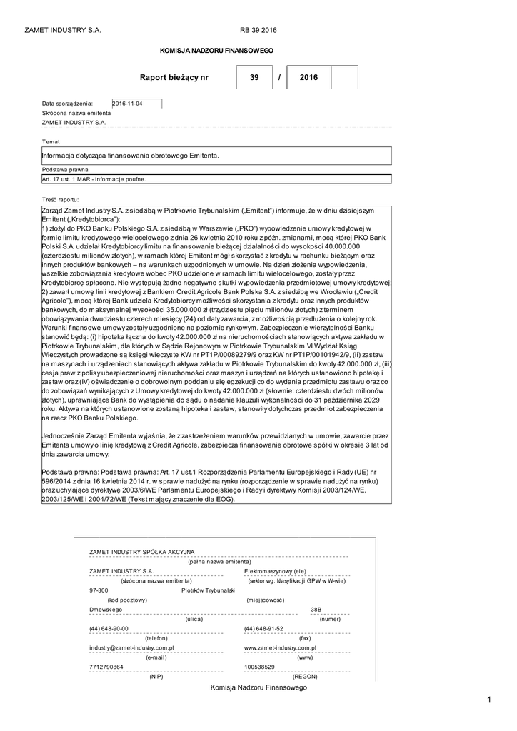 ZAMET INDUSTRY S.A. RB 39 2016 KOMISJA NADZORU FINANSOWEGO Raport bieżący nr 39 / 2016 2016-11-04 Data sporządzenia: Skróc ona nazwa emitenta ZAMET INDUSTRY S.A. Temat Informacja dotycząca finansowania obrotowego Emitenta. Podstawa prawna Art. 17 ust. 1 MAR - informac je poufne. Treść raportu: Zarząd Zamet Industry S.A. z siedzibą w Piotrkowie Trybunalskim („Emitent”) informuje, że w dniu dzisiejszym Emitent („Kredytobiorca”): 1) złożył do PKO Banku Polskiego S.A. z siedzibą w Warszawie („PKO”) wypowiedzenie umowy kredytowej w formie limitu kredytowego wielocelowego z dnia 26 kwietnia 2010 roku z późn. zmianami, mocą której PKO Bank Polski S.A. udzielał Kredytobiorcy limitu na finansowanie bieżącej działalności do wysokości 40.000.000 (czterdziestu milionów złotych), w ramach której Emitent mógł skorzystać z kredytu w rachunku bieżącym oraz innych produktów bankowych – na warunkach uzgodnionych w umowie. Na dzień złożenia wypowiedzenia, wszelkie zobowiązania kredytowe wobec PKO udzielone w ramach limitu wielocelowego, zostały przez Kredytobiorcę spłacone. Nie występują żadne negatywne skutki wypowiedzenia przedmiotowej umowy kredytowej; 2) zawarł umowę linii kredytowej z Bankiem Credit Agricole Bank Polska S.A. z siedzibą we Wrocławiu („Credit Agricole”), mocą której Bank udziela Kredytobiorcy możliwości skorzystania z kredytu oraz innych produktów bankowych, do maksymalnej wysokości 35.000.000 zł (trzydziestu pięciu milionów złotych) z terminem obowiązywania dwudziestu czterech miesięcy (24) od daty zawarcia, z możliwością przedłużenia o kolejny rok. Warunki finansowe umowy zostały uzgodnione na poziomie rynkowym. Zabezpieczenie wierzytelności Banku stanowić będą: (i) hipoteka łączna do kwoty 42.000.000 zł na nieruchomościach stanowiących aktywa zakładu w Piotrkowie Trybunalskim, dla których w Sądzie Rejonowym w Piotrkowie Trybunalskim VI Wydział Ksiąg Wieczystych prowadzone są księgi wieczyste KW nr PT1P/00089279/9 oraz KW nr PT1P/00101942/9, (ii) zastaw na maszynach i urządzeniach stanowiących aktywa zakładu w Piotrkowie Trybunalskim do kwoty 42.000.000 zł, (iii) cesja praw z polisy ubezpieczeniowej nieruchomości oraz maszyn i urządzeń na których ustanowiono hipotekę i zastaw oraz (IV) oświadczenie o dobrowolnym poddaniu się egzekucji co do wydania przedmiotu zastawu oraz co do zobowiązań wynikających z Umowy kredytowej do kwoty 42.000.000 zł (słownie: czterdziestu dwóch milionów złotych), uprawniające Bank do wystąpienia do sądu o nadanie klauzuli wykonalności do 31 października 2029 roku. Aktywa na których ustanowione zostaną hipoteka i zastaw, stanowiły dotychczas przedmiot zabezpieczenia na rzecz PKO Banku Polskiego. Jednocześnie Zarząd Emitenta wyjaśnia, że z zastrzeżeniem warunków przewidzianych w umowie, zawarcie przez Emitenta umowy o linię kredytową z Credit Agricole, zabezpiecza finansowanie obrotowe spółki w okresie 3 lat od dnia zawarcia umowy. Podstawa prawna: Podstawa prawna: Art. 17 ust.1 Rozporządzenia Parlamentu Europejskiego i Rady (UE) nr 596/2014 z dnia 16 kwietnia 2014 r. w sprawie nadużyć na rynku (rozporządzenie w sprawie nadużyć na rynku) oraz uchylające dyrektywę 2003/6/WE Parlamentu Europejskiego i Rady i dyrektywy Komisji 2003/124/WE, 2003/125/WE i 2004/72/WE (Tekst mający znaczenie dla EOG). ZAMET INDUSTRY SPÓŁKA AKCYJNA (pełna nazwa emitenta) ZAMET INDUSTRY S.A. Elektromaszynowy (ele) (skróc ona nazwa emitenta) (sektor wg. klasyfikac ji GPW w W-wie) Piotrków Trybunalski 97-300 (kod poc ztowy) (miejscowość) Dmowskiego 38B (ulica) (44) 648-90-00 (numer) (44) 648-91-52 (telefon) [email protected] (fax) www.zamet-industry.com.pl (e-mail) 7712790864 (www) 100538529 (NIP) (REGON) Komisja Nadzoru Finansowego 1 ZAMET INDUSTRY S.A. RB 39 2016 PODPISY OSÓB REPREZENTUJĄCYCH SPÓŁKĘ Data Imię i Nazwisko Stanowisko/Funkc ja 2016-11-04 Tomasz Jakubowski Prezes Zarządu 2016-11-04 Przemysław Milc zarek Wic eprezes Zarządu ds Finansowych Podpis Komisja Nadzoru Finansowego 2