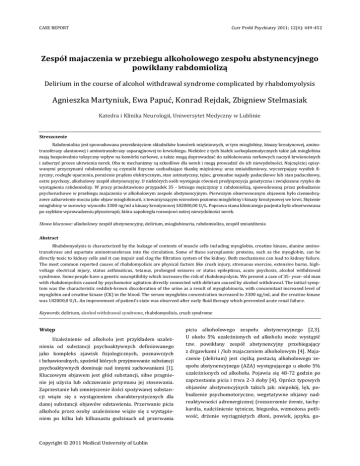 CASE REPORT Curr Probl Psychiatry 2011; 12(4): 449-452 Zespół majaczenia w przebiegu alkoholowego zespołu abstynencyjnego powikłany rabdomiolizą Delirium in the course of alcohol withdrawal syndrome complicated by rhabdomyolysis Agnieszka Martyniuk, Ewa Papuć, Konrad Rejdak, Zbigniew Stelmasiak Katedra i Klinika Neurologii, Uniwersytet Medyczny w Lublinie Streszczenie Rabdomioliza jest spowodowana przeniknięciem składników komórek mięśniowych, w tym mioglobiny, kinazy kreatynowej, aminotransferazy alaninowej i aminotransferazy asparaginowej to krwiobiegu. Niektóre z tych białek sarkoplazmatycznych takie jak mioglobina mają bezpośrednio toksyczny wpływ na komórki nerkowe, a także mogą doprowadzać do zablokowania nerkowych naczyń krwionośnych i zaburzyć proces ukrwienia nerek. Oba te mechanizmy są szkodliwe dla nerek i mogą prowadzić do ich niewydolności. Najczęściej opisywanymi przyczynami rabdomiolizy są czynniki fizyczne uszkadzające tkankę mięśniową: uraz zmiażdżeniowy, wyczerpujący wysiłek fizyczny, rozległe oparzenia, porażenie prądem elektrycznym, stan astmatyczny, tężec, gromadne napady padaczkowe lub stan padaczkowy, ostre psychozy, alkoholowy zespół abstynencyjny. U niektórych osób występuje również predyspozycja genetyczna i zwiększone ryzyko do wystąpienia rabdomiolizy. W pracy przedstawiono przypadek 35 - letniego mężczyzny z rabdomiolizą, spowodowaną przez pobudzenie psychoruchowe w przebiegu majaczenia w alkoholowym zespole abstynencyjnym. Pierwszym obserwowanym objawem było ciemnobrązowe zabarwienie moczu jako objaw mioglobinurii, z towarzyszącym wzrostem poziomu mioglobiny i kinazy kreatynowej we krwi. Stężenie mioglobiny w surowicy wynosiło 3300 ng/ml a kinazy kreatynowej 182000,00 U/L. Poprawa stanu klinicznego pacjenta była obserwowana po szybkim wprowadzeniu płynoterapii, która zapobiegła rozwojowi ostrej niewydolności nerek. Słowa kluczowe: alkoholowy zespół abstynencyjny, delirium, mioglobinuria, rabdomioliza, zespół zmiażdżenia Abstract Rhabdomyolysis is characterized by the leakage of contents of muscle cells including myoglobin, creatine kinase, alanine aminotransferase and aspartate aminotransferase into the circulation. Some of these sarcoplasmic proteins, such as the myoglobin, can be directly toxic to kidney cells and it can impair and clog the filtration system of the kidney. Both mechanisms can lead to kidney failure. The most common reported causes of rhabdomyolisis are physical factors like crush injury, strenuous exercise, extensive burns, highvoltage electrical injury, status asthmaticus, tetanus, prolonged seizures or status epilepticus, acute psychosis, alcohol withdrawal syndrome. Some people have a genetic susceptibility which increases the risk of rhabdomyolysis. We present a case of 35- year- old man with rhabdomyolisis caused by psychomotor agitation directly connected with delirium caused by alcohol withdrawal. The initial symptom was the characteristic reddish-brown discoloration of the urine as a result of myoglobinuria, with concomitant increased level of myoglobin and creatine kinase (CK) in the blood. The serum myoglobin concentration increased to 3300 ng/ml, and the creatine kinase was 182000,0 U/L. An improvement of patient’s state was observed after early fluid therapy which prevented acute renal failure. Keywords: delirium, alcohol withdrawal syndrome, rhabdomyolisis, crush syndrome Wstęp Uzależnienie od alkoholu jest przykładem uzależnienia od substancji psychoaktywnych definiowanego jako kompleks zjawisk fizjologicznych, poznawczych i behawioralnych, spośród których przyjmowanie substancji psychoaktywnych dominuje nad innymi zachowaniami [1]. Kluczowym objawem jest głód substancji, silne pragnienie jej użycia lub odczuwanie przymusu jej stosowania. Zaprzestanie lub zmniejszenie ilości spożywanej substancji wiąże się z wystąpieniem charakterystycznych dla danej substancji objawów odstawienia. Przerwanie picia alkoholu przez osoby uzależnione wiąże się z wystąpieniem po kilku lub kilkunastu godzinach od przerwania Copyright © 2011 Medical University of Lublin picia alkoholowego zespołu abstynencyjnego [2,3]. U około 5% uzależnionych od alkoholu może wystąpić tzw. powikłany zespół abstynencyjny przebiegający z drgawkami i /lub majaczeniem alkoholowym [4]. Majaczenie (delirium) jest ciężką postacią alkoholowego zespołu abstynencyjnego (AZA) występującego u około 5% uzależnionych od alkoholu. Pojawia się 48-72 godzin po zaprzestaniu picia i trwa 2-3 doby [4]. Oprócz typowych objawów abstynencyjnych takich jak: niepokój, lęk, pobudzenie psychomotoryczne, wegetatywne objawy nadreaktywności adrenergicznej (rozszerzenie źrenic, tachykardia, nadciśnienie tętnicze, biegunka, wzmożona potliwość, drżenie wyciągniętych dłoni, powiek, języka, go- 450 A. Martyniuk, E. Papuć, K. Rejdak, Z. Stelmasiak rączka) w majaczeniu dochodzi także do zaburzeń świadomości, przeżywania nieistniejącej rzeczywistości, występowania złudzeń, omamów wzrokowych, słuchowych i czuciowych, urojeniowej interpretacji zdarzeń, z brakiem wglądu, z nasileniem objawów w godzinach nocnych [5,6]. Przyjmuje się, że ze względu na burzliwe uzewnętrznione objawy psychopatologiczne i somatyczne majaczenie jest stanem potencjalnego zagrożenia życia pacjenta, wymagającego leczenia w warunkach szpitalnych. Śmiertelność w rozwiniętym majaczeniu alkoholowym wynosi 1-5%. Pacjenci wymagają intensywnej farmakoterapii, odpowiedniego zabezpieczenia i unieruchomienia [7]. Opis przypadku 35-letni pacjent został przyjęty do oddziału po gromadnych napadach drgawkowych, które wystąpiły po raz pierwszy w życiu z następowym urazem głowy lewej okolicy czołowej. Z wywiadu wiadomo, że w ostatnich miesiącach nadużywał alkoholu jak również leków o działaniu sedatywnym. W wykonanym badaniu TK głowy w obrębie struktur mózgowia 
