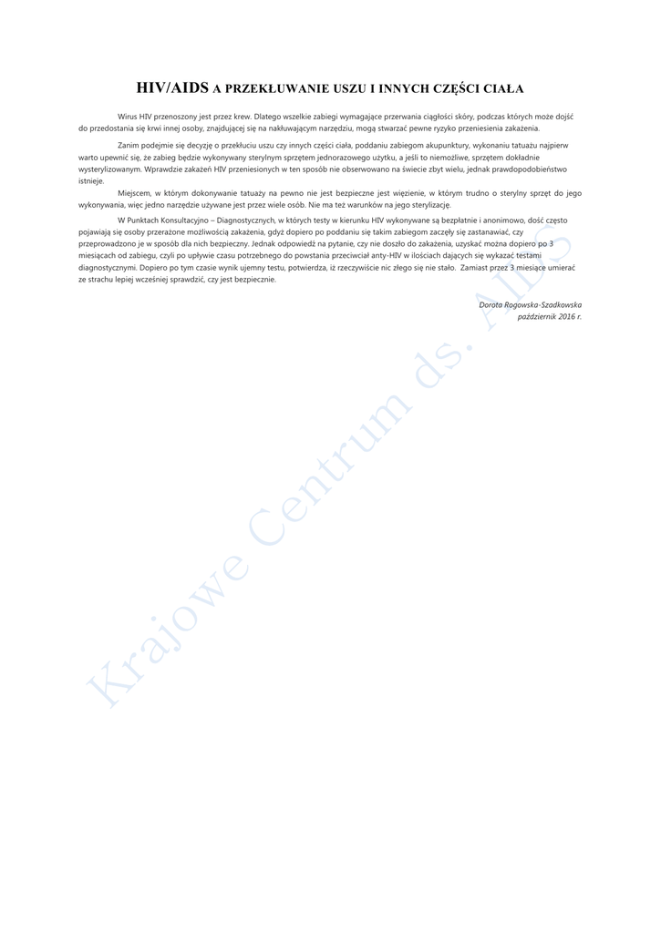 HIV/AIDS A PRZEKŁUWANIE USZU I INNYCH CZĘŚCI CIAŁA Wirus HIV przenoszony jest przez krew. Dlatego wszelkie zabiegi wymagające przerwania ciągłości skóry, podczas których może dojść do przedostania się krwi innej osoby, znajdującej się na nakłuwającym narzędziu, mogą stwarzać pewne ryzyko przeniesienia zakażenia. Zanim podejmie się decyzję o przekłuciu uszu czy innych części ciała, poddaniu zabiegom akupunktury, wykonaniu tatuażu najpierw warto upewnić się, że zabieg będzie wykonywany sterylnym sprzętem jednorazowego użytku, a jeśli to niemożliwe, sprzętem dokładnie wysterylizowanym. Wprawdzie zakażeń HIV przeniesionych w ten sposób nie obserwowano na świecie zbyt wielu, jednak prawdopodobieństwo istnieje. Miejscem, w którym dokonywanie tatuaży na pewno nie jest bezpieczne jest więzienie, w którym trudno o sterylny sprzęt do jego wykonywania, więc jedno narzędzie używane jest przez wiele osób. Nie ma też warunków na jego sterylizację. W Punktach Konsultacyjno – Diagnostycznych, w których testy w kierunku HIV wykonywane są bezpłatnie i anonimowo, dość często pojawiają się osoby przerażone możliwością zakażenia, gdyż dopiero po poddaniu się takim zabiegom zaczęły się zastanawiać, czy przeprowadzono je w sposób dla nich bezpieczny. Jednak odpowiedź na pytanie, czy nie doszło do zakażenia, uzyskać można dopiero po 3 miesiącach od zabiegu, czyli po upływie czasu potrzebnego do powstania przeciwciał anty-HIV w ilościach dających się wykazać testami diagnostycznymi. Dopiero po tym czasie wynik ujemny testu, potwierdza, iż rzeczywiście nic złego się nie stało. Zamiast przez 3 miesiące umierać ze strachu lepiej wcześniej sprawdzić, czy jest bezpiecznie. Dorota Rogowska-Szadkowska październik 2016 r.